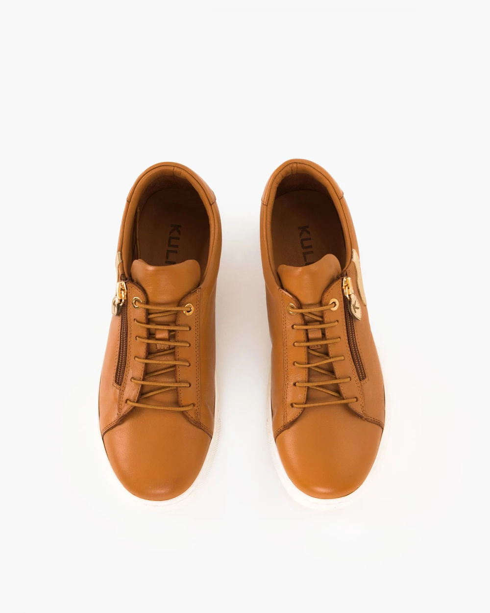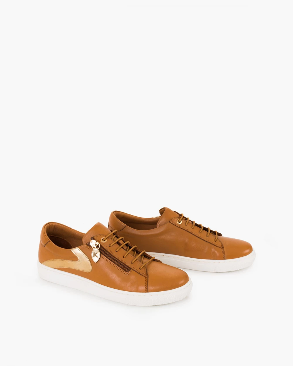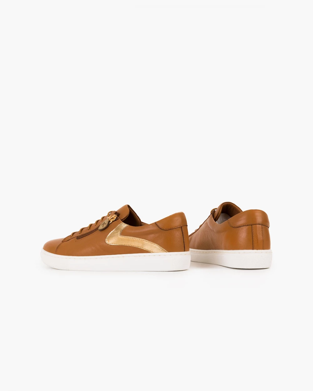 Brązowe półbuty damskie skórzane ze złotymi wstawkami