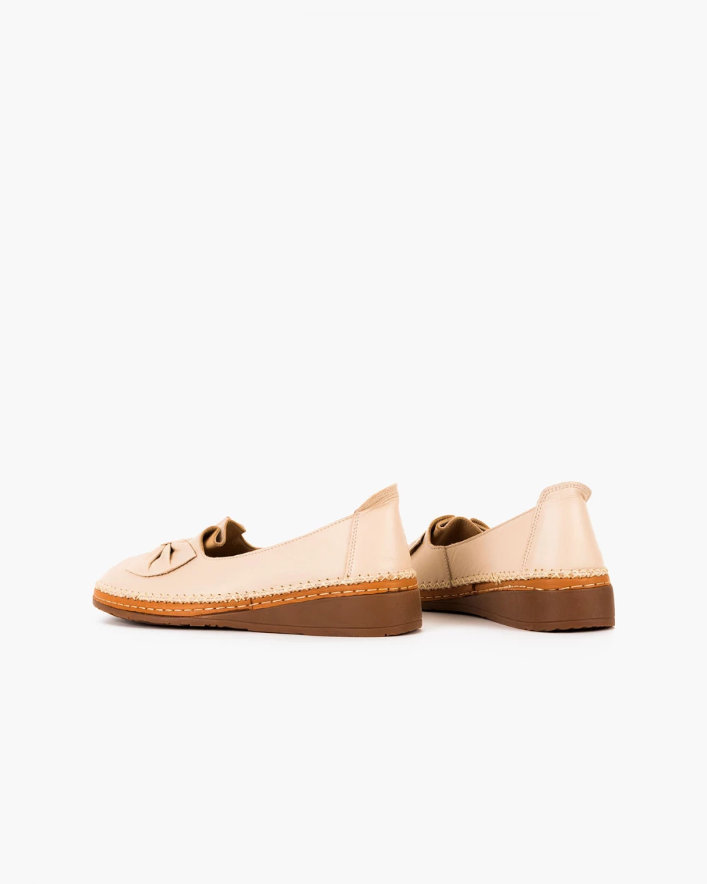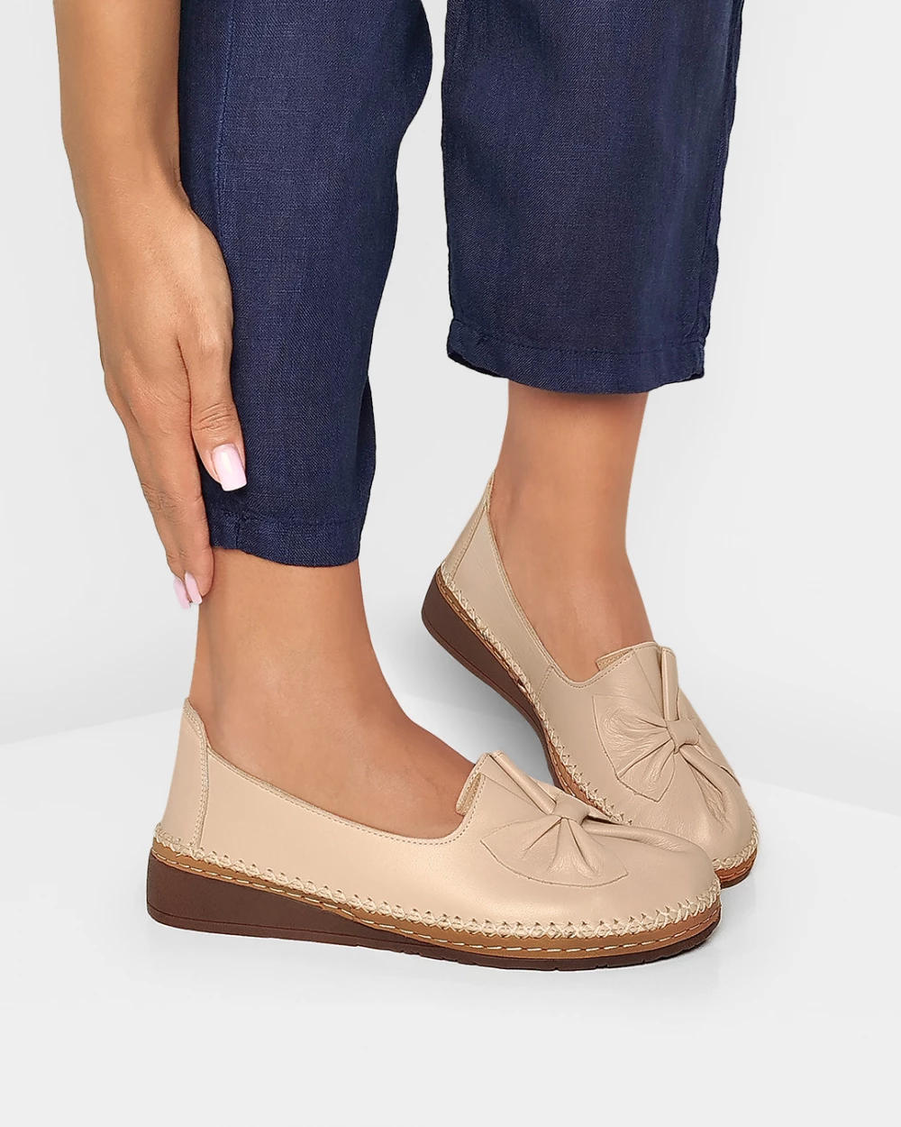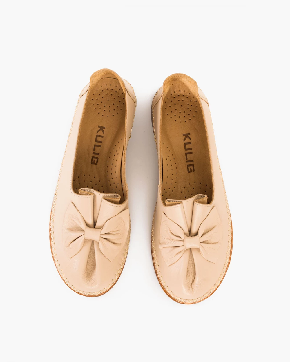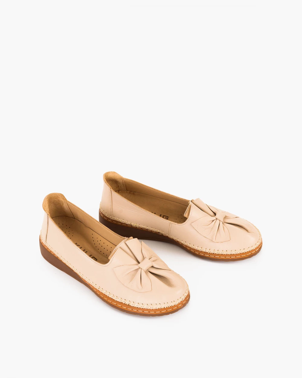 Beżowe półbuty damskie skórzane z kokardą na koturnie