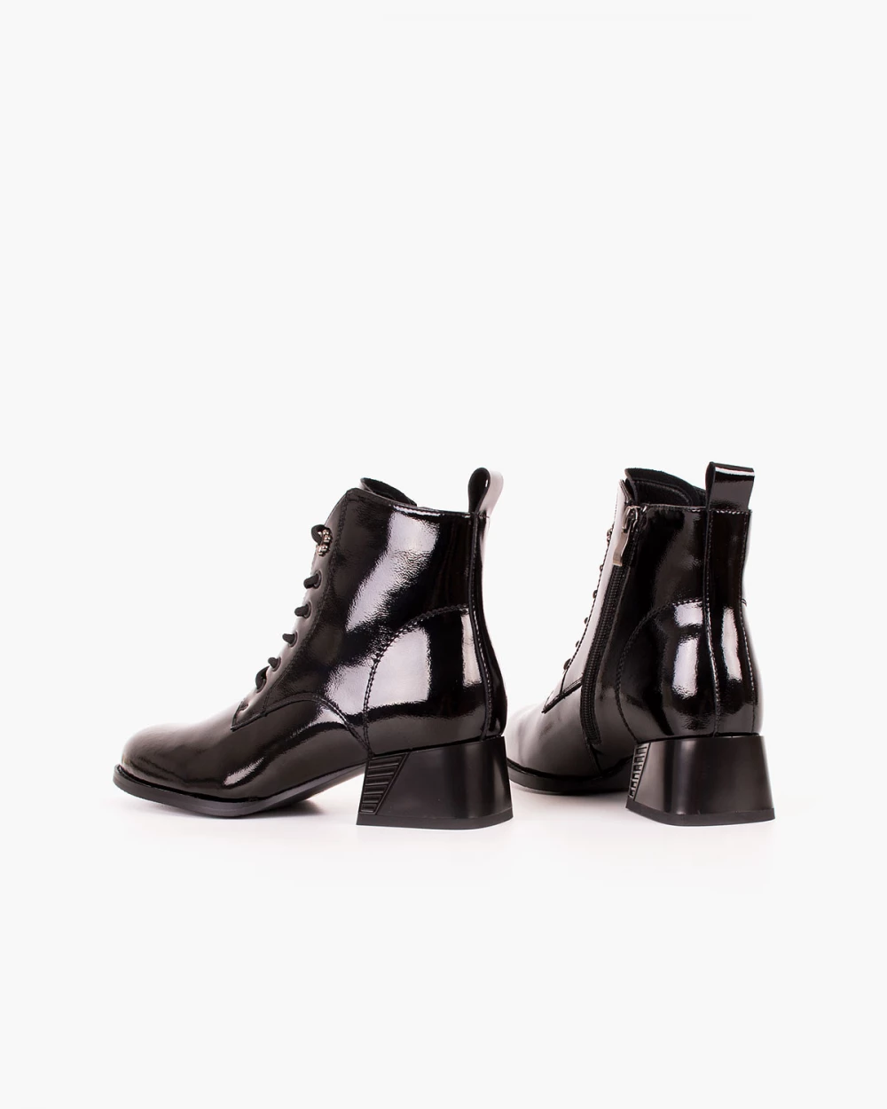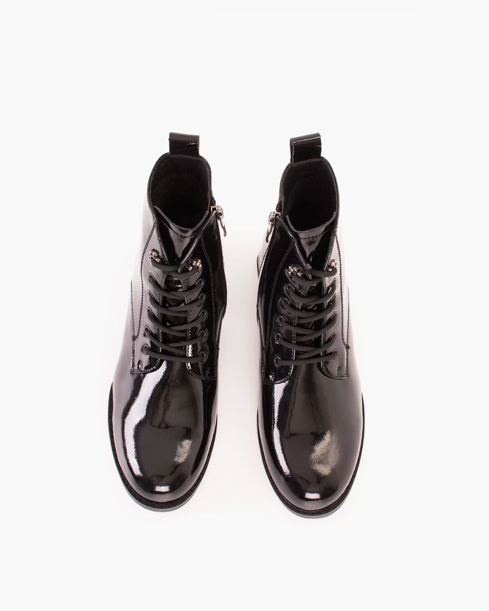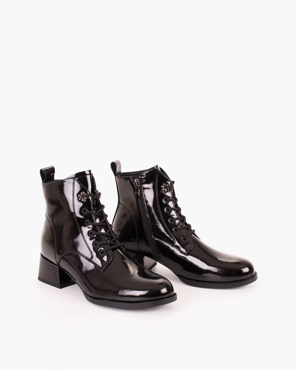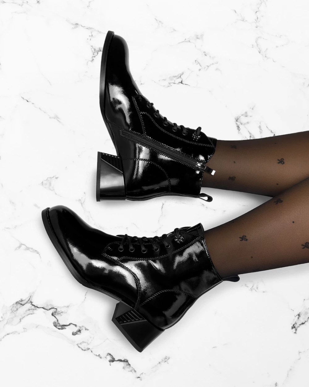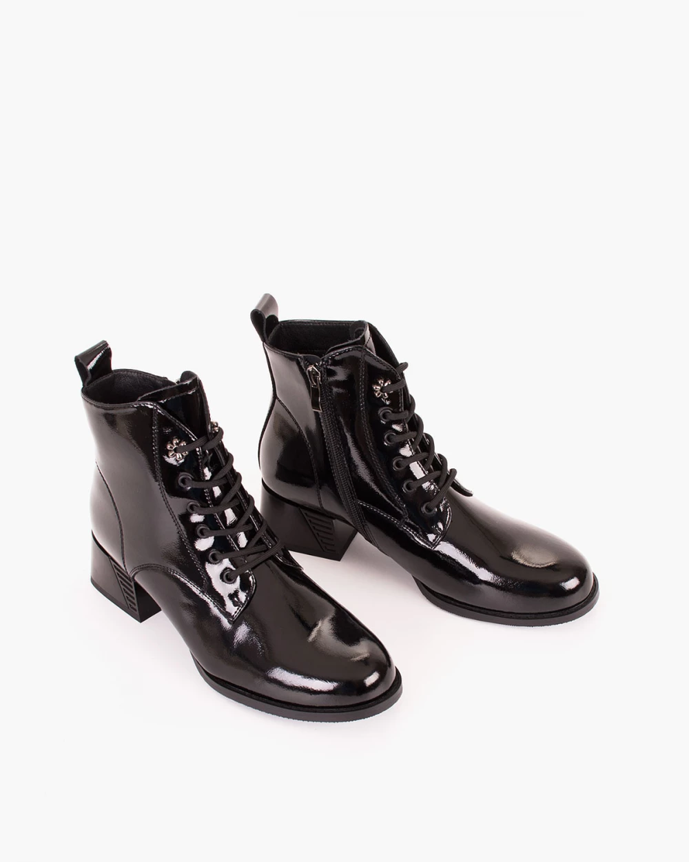 Czarne trzewiki damskie ze skóry lakierowanej na klocku