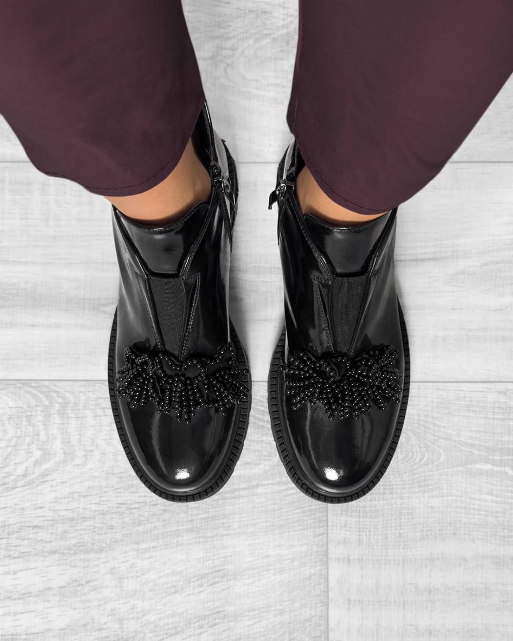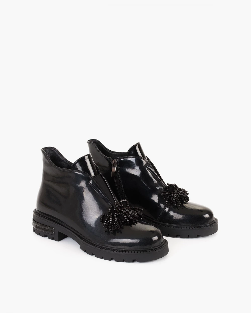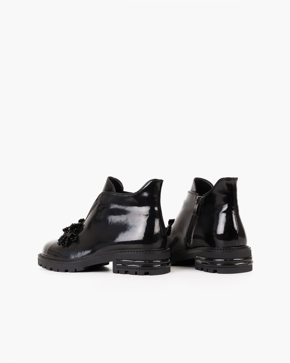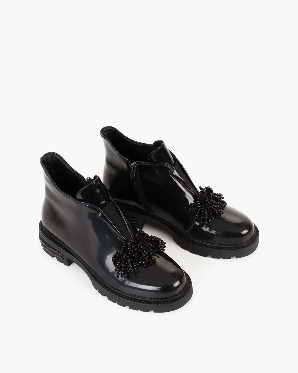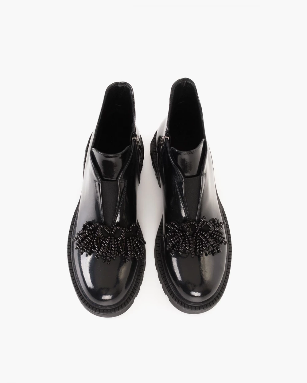 Czarne botki damskie ze skóry lakierowanej z koralikami