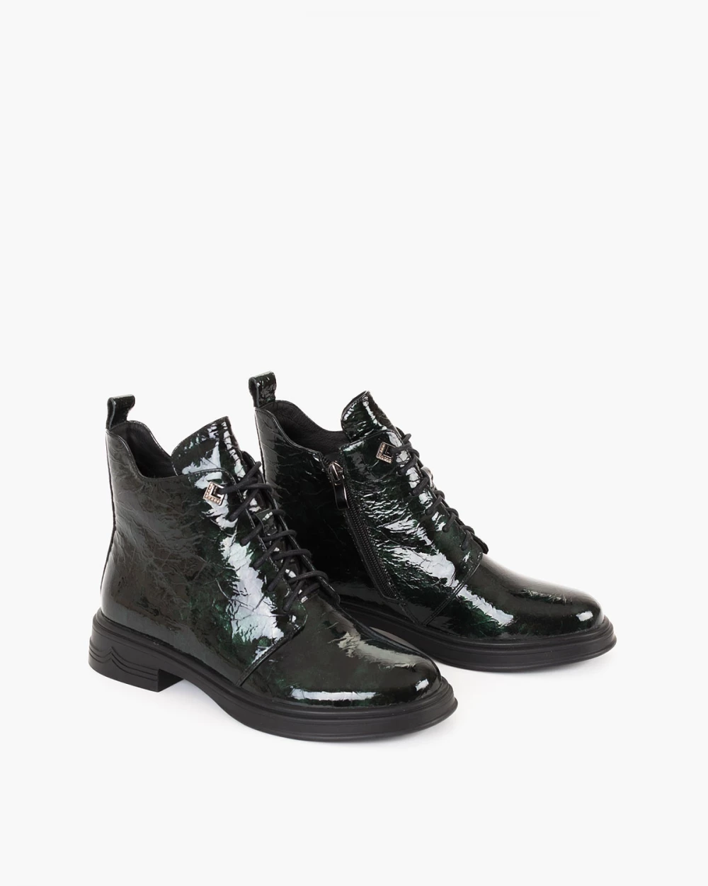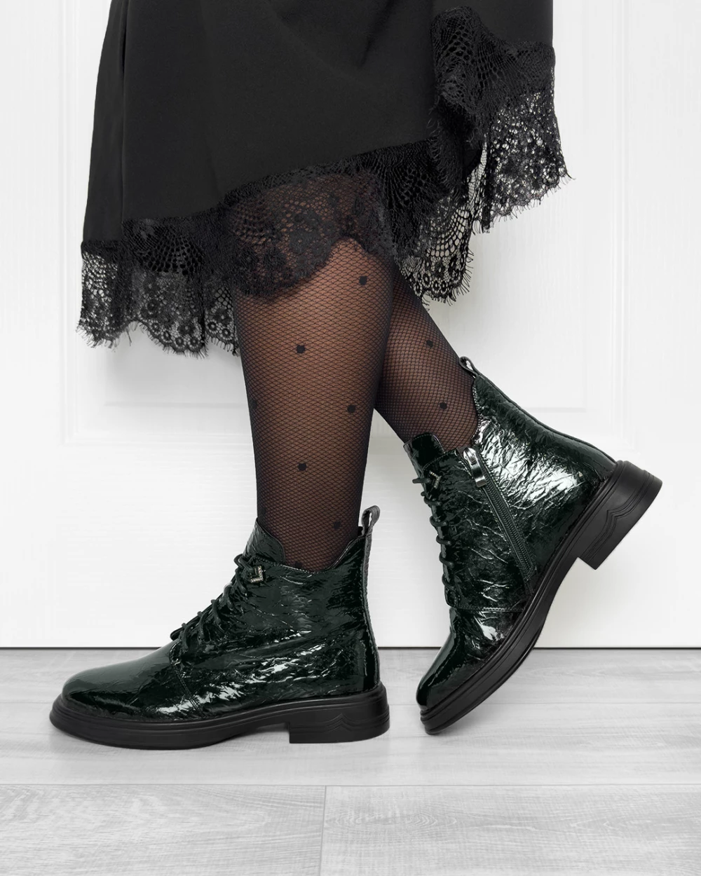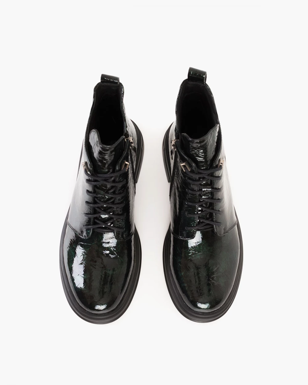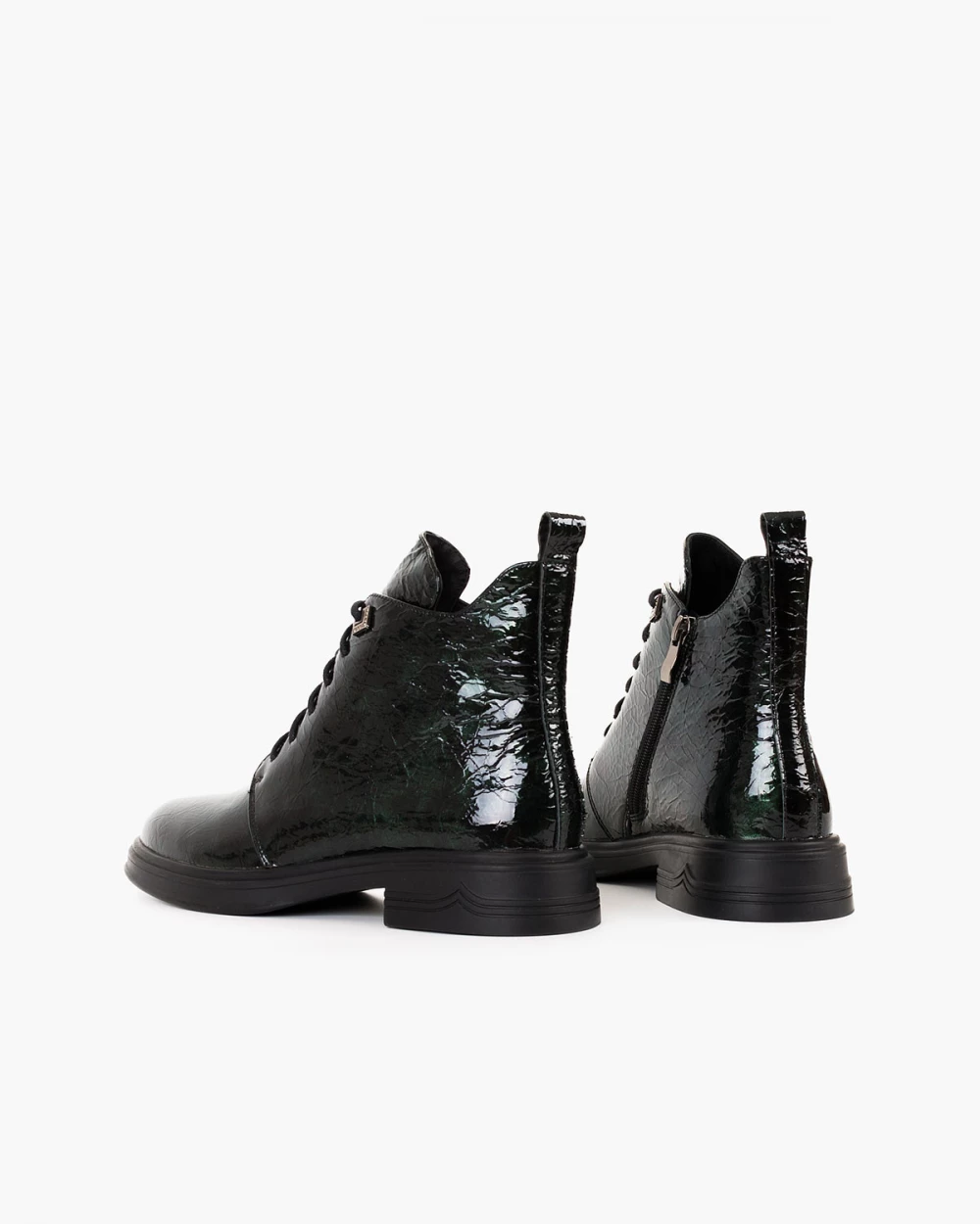 Ciemnozielone trzewiki damskie ze skóry lakierowanej