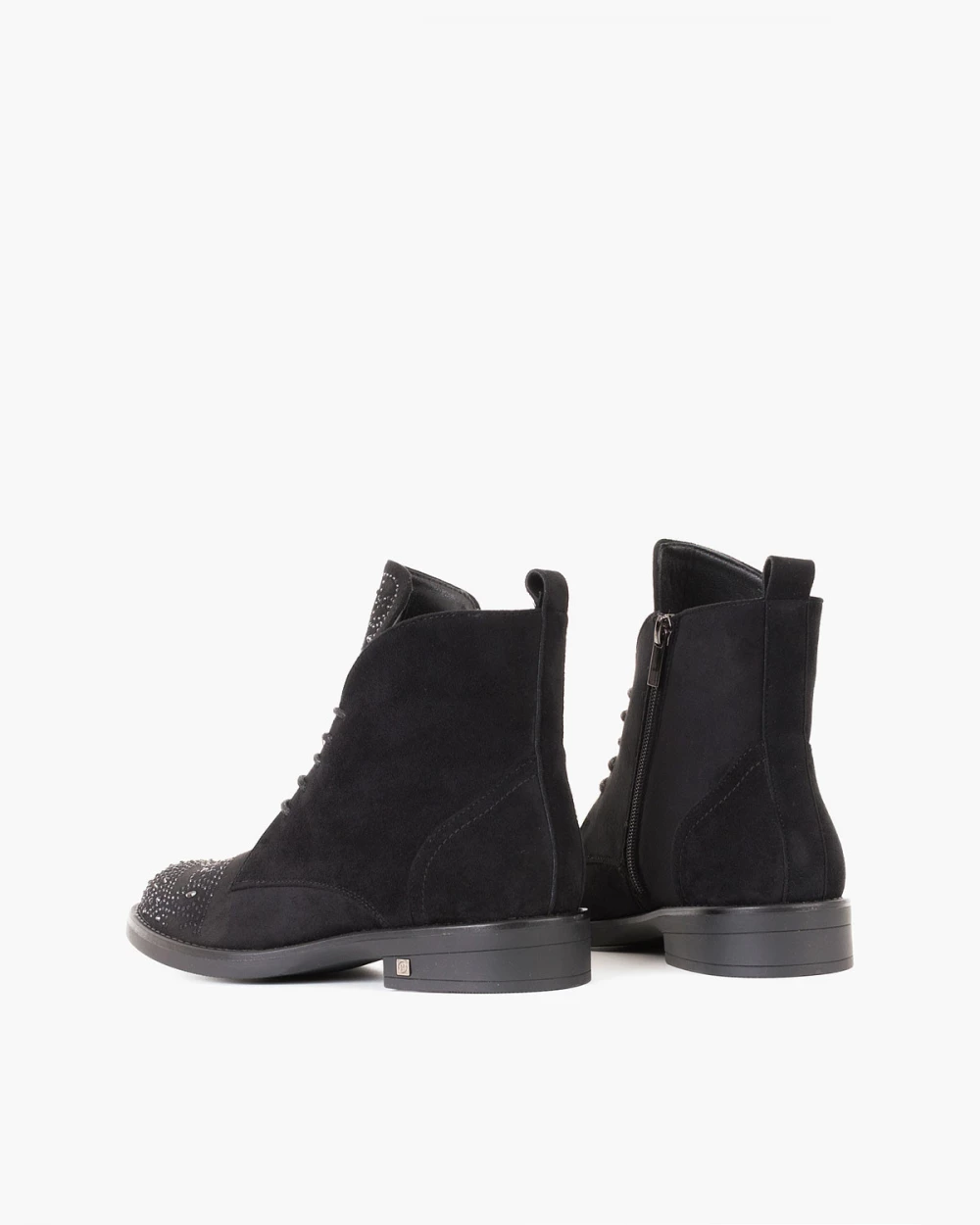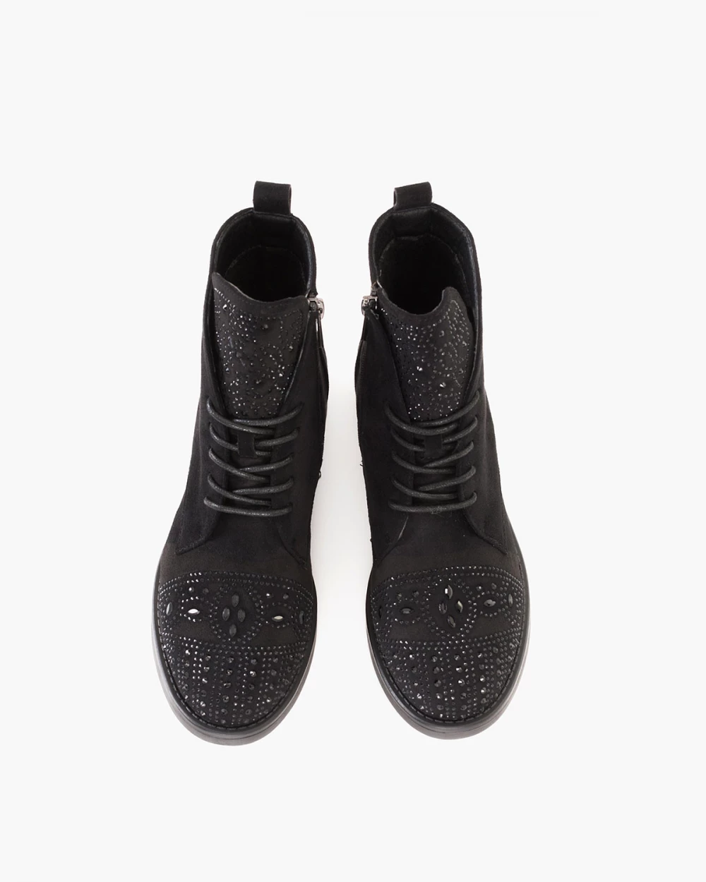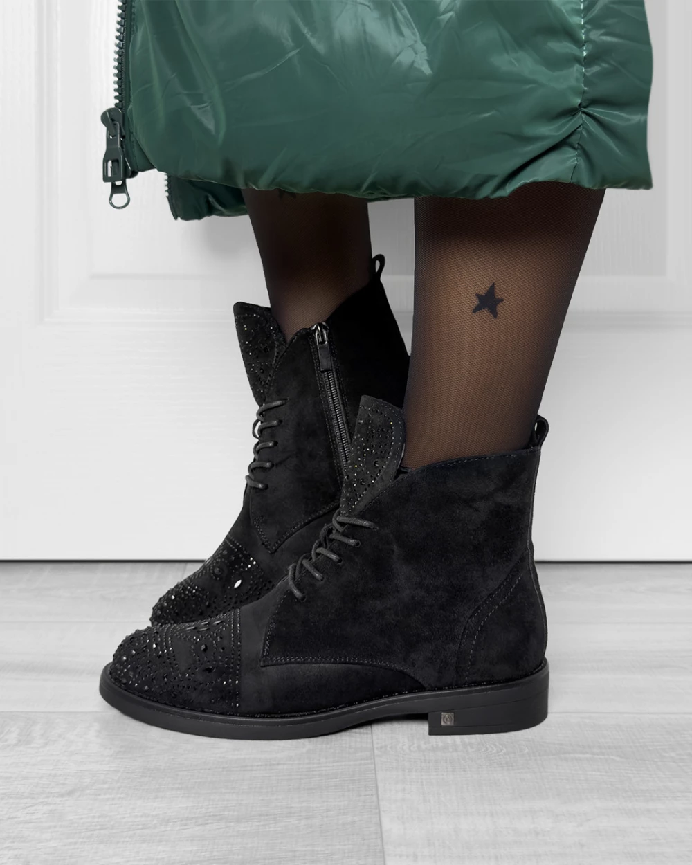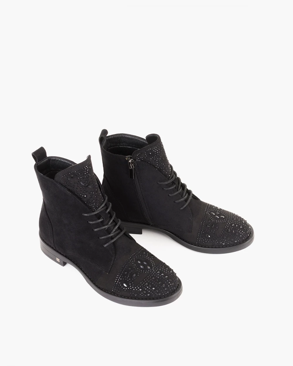 Czarne trzewiki damskie z eko-zamszu z kamieniami