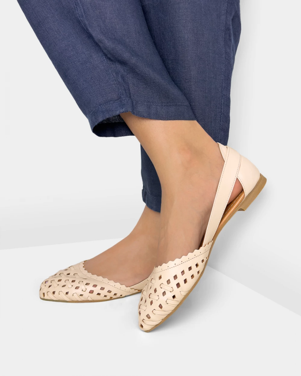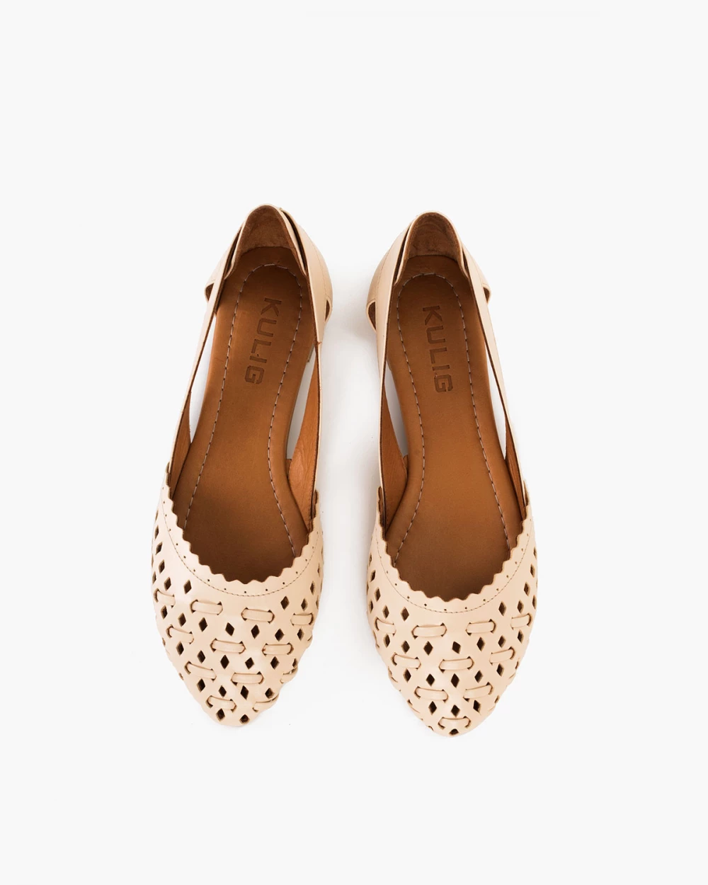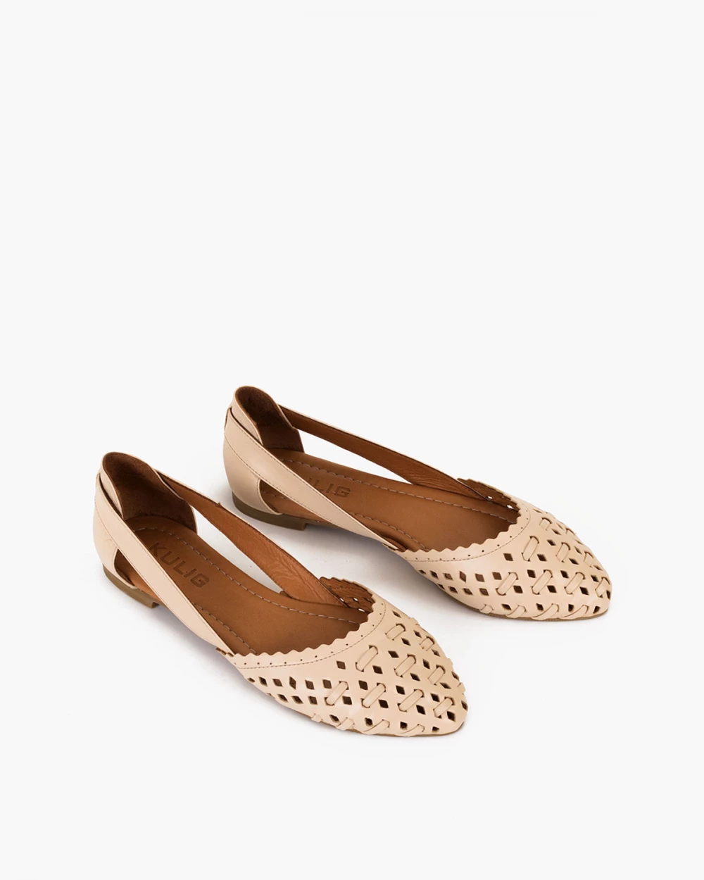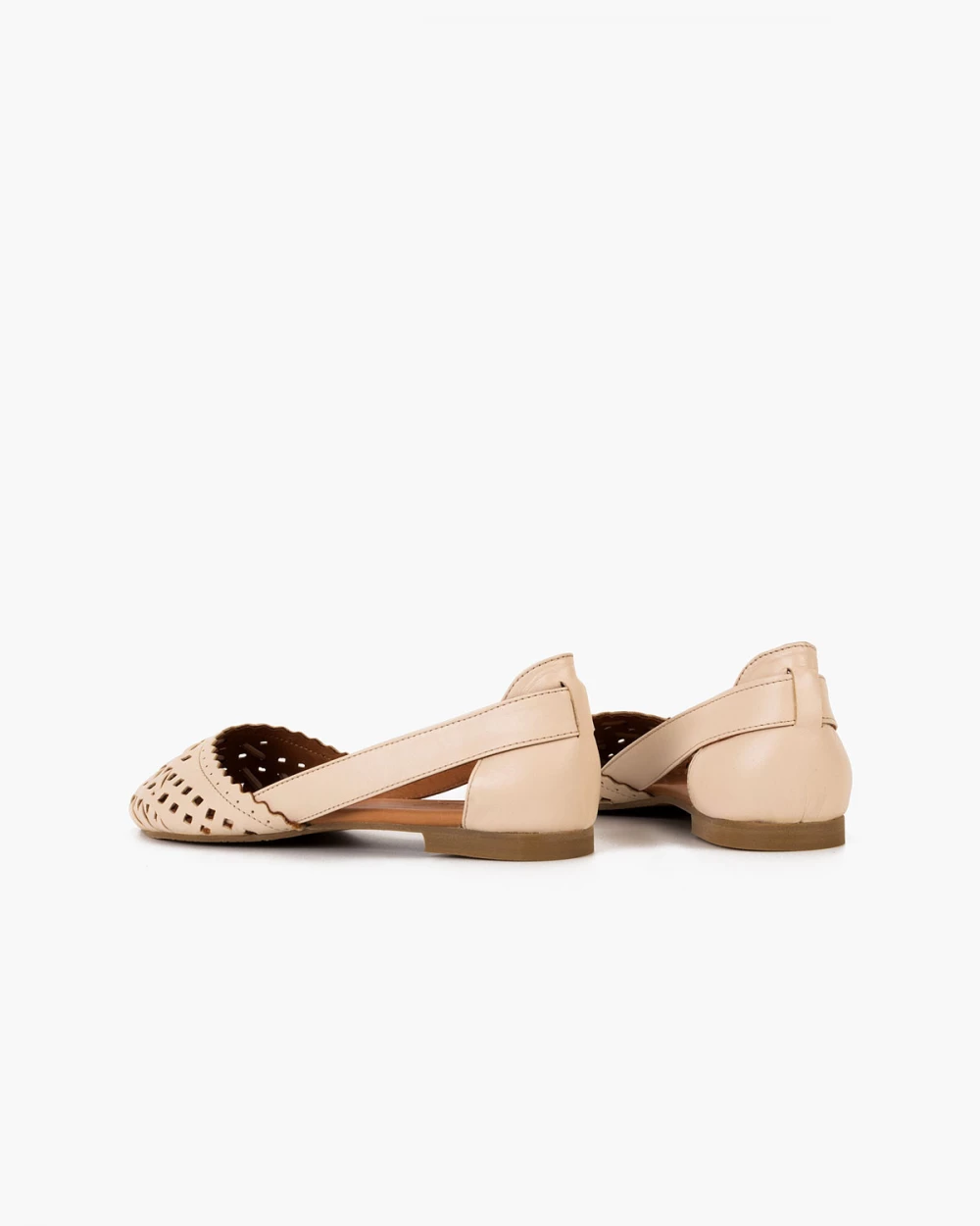 Jasnobeżowe baleriny ażurowe skórzane na niskim obcasie