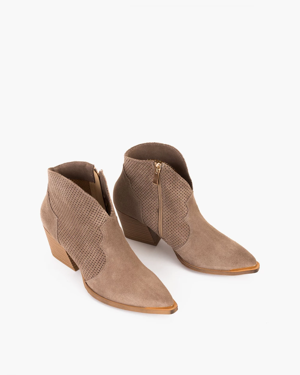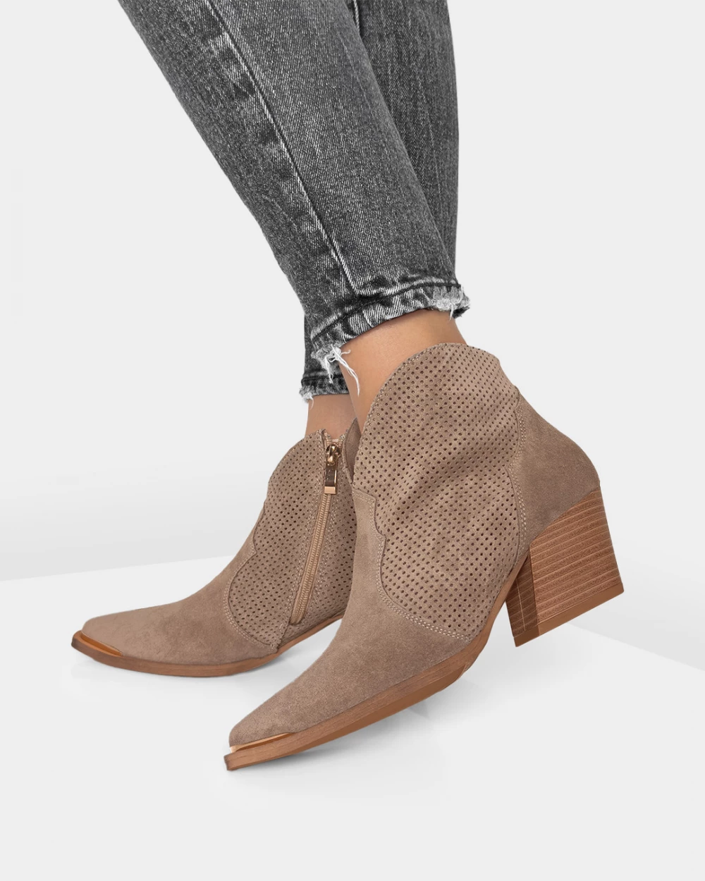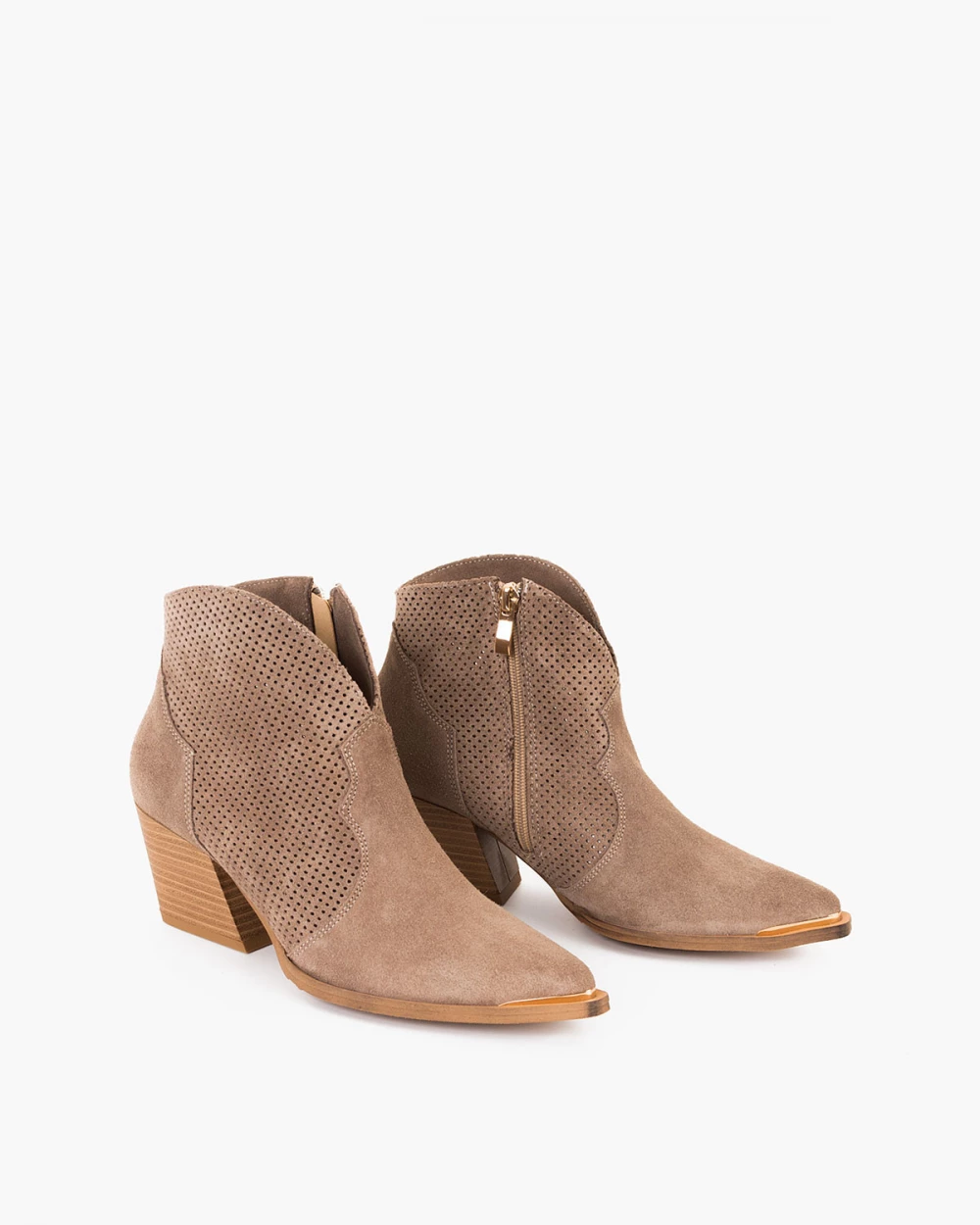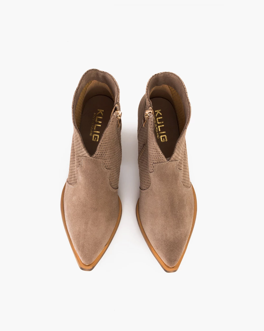 Beżowe kowbojki damskie z naturalnej skóry welurowej na słupku