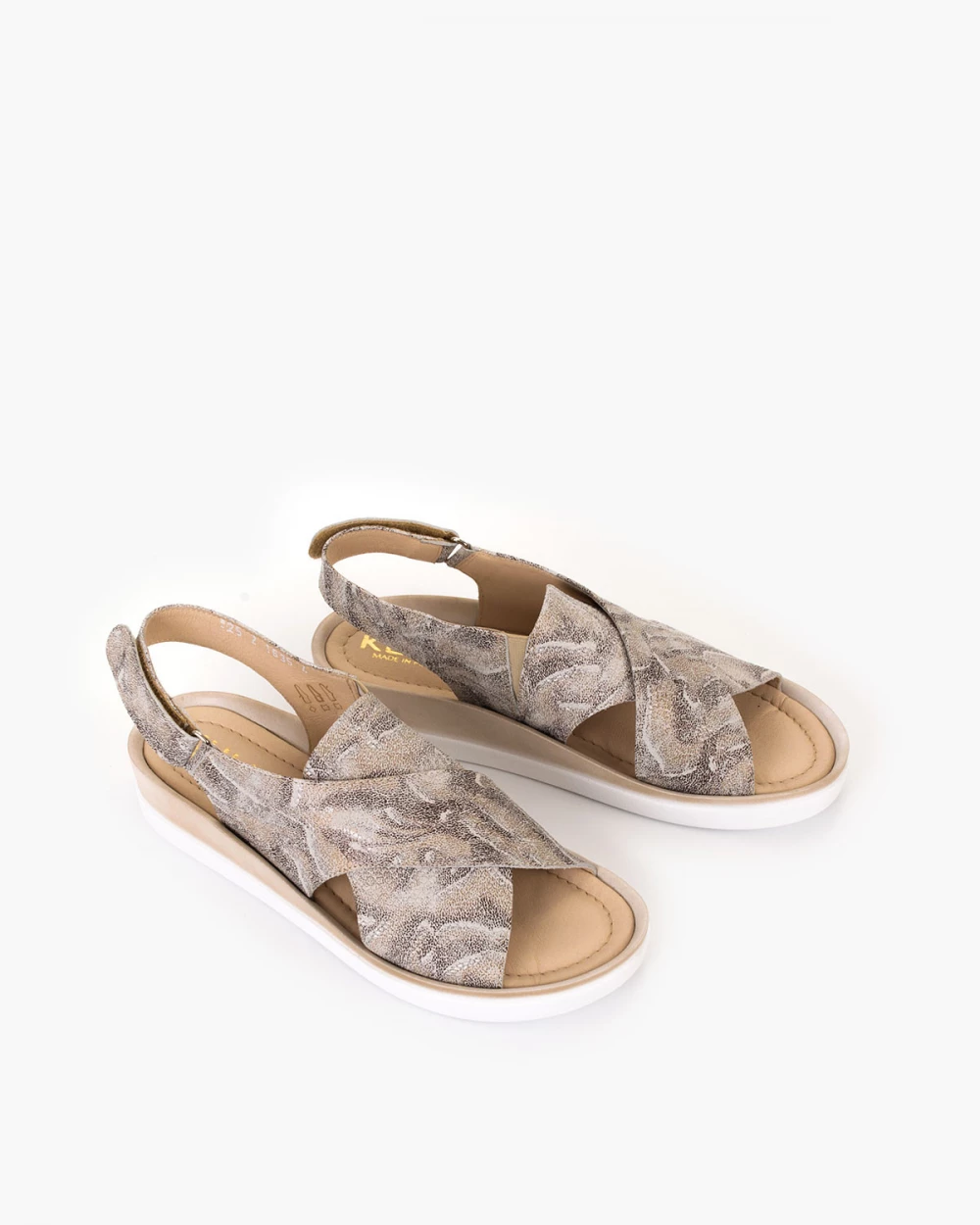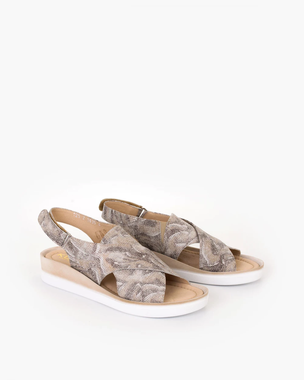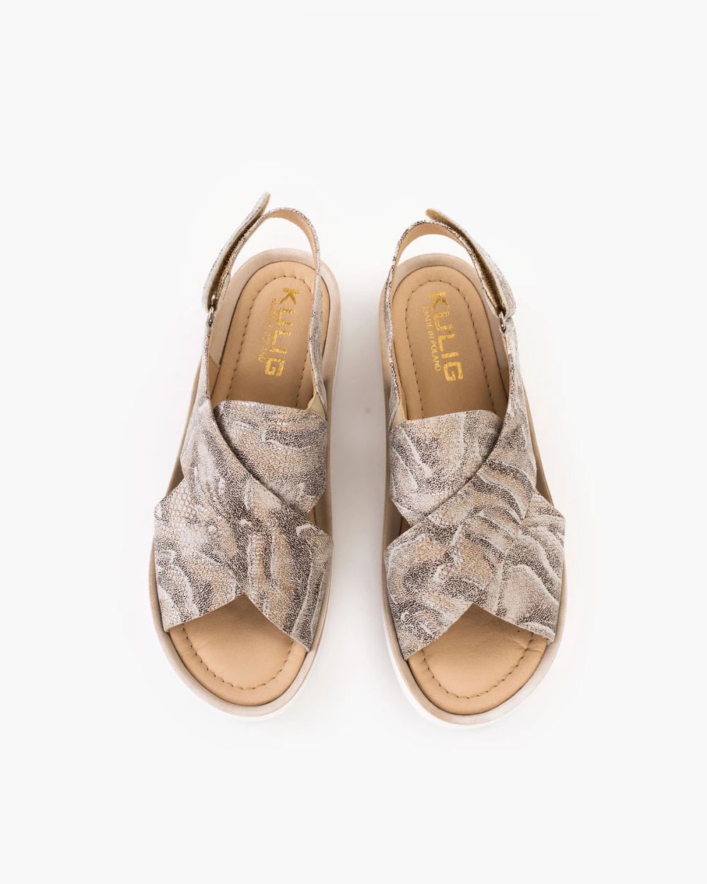 Wielokolorowe sandały skórzane na koturnie z motywem