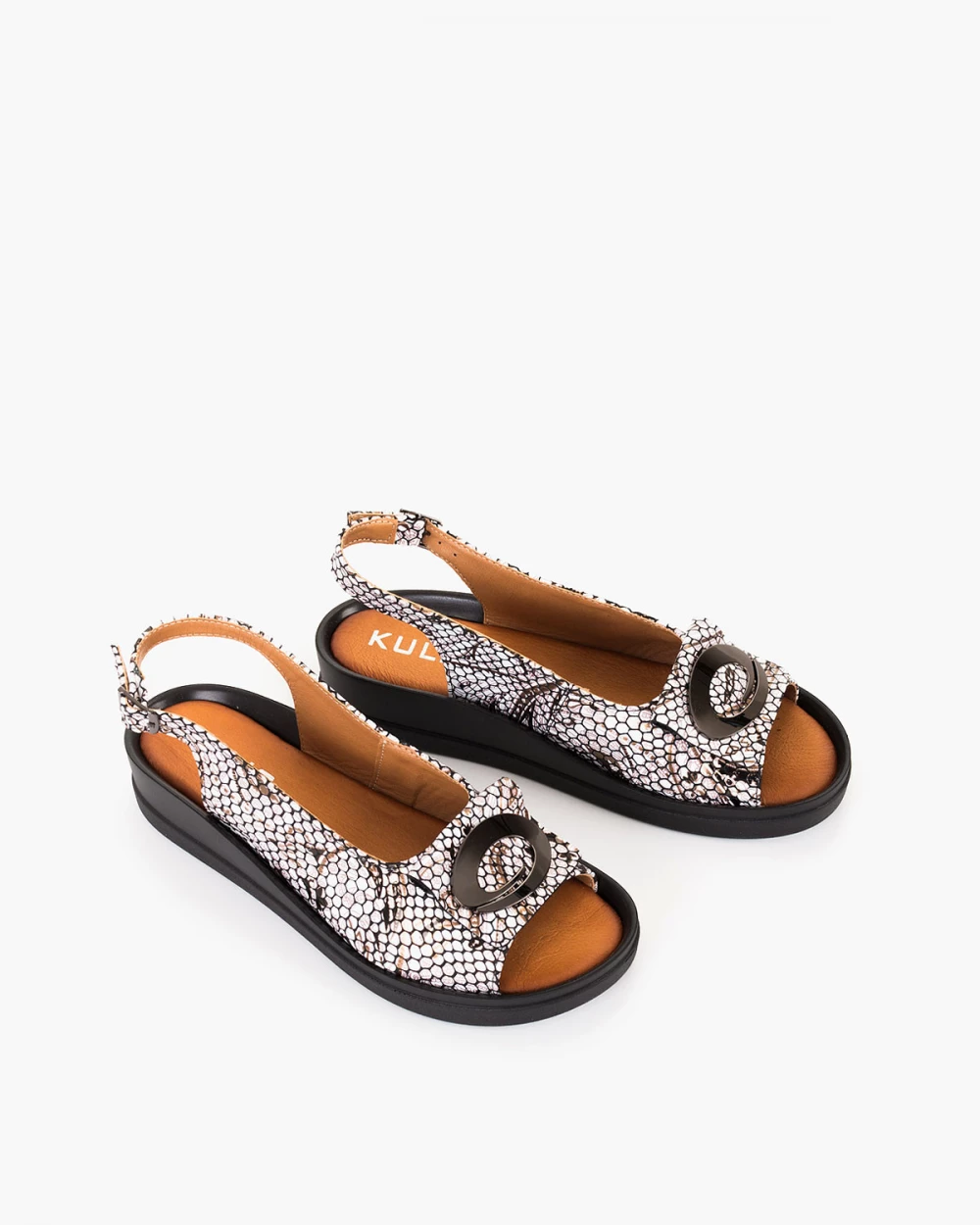 Czarno-białe sandały damskie skórzane na koturnie z motywem