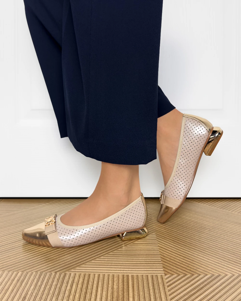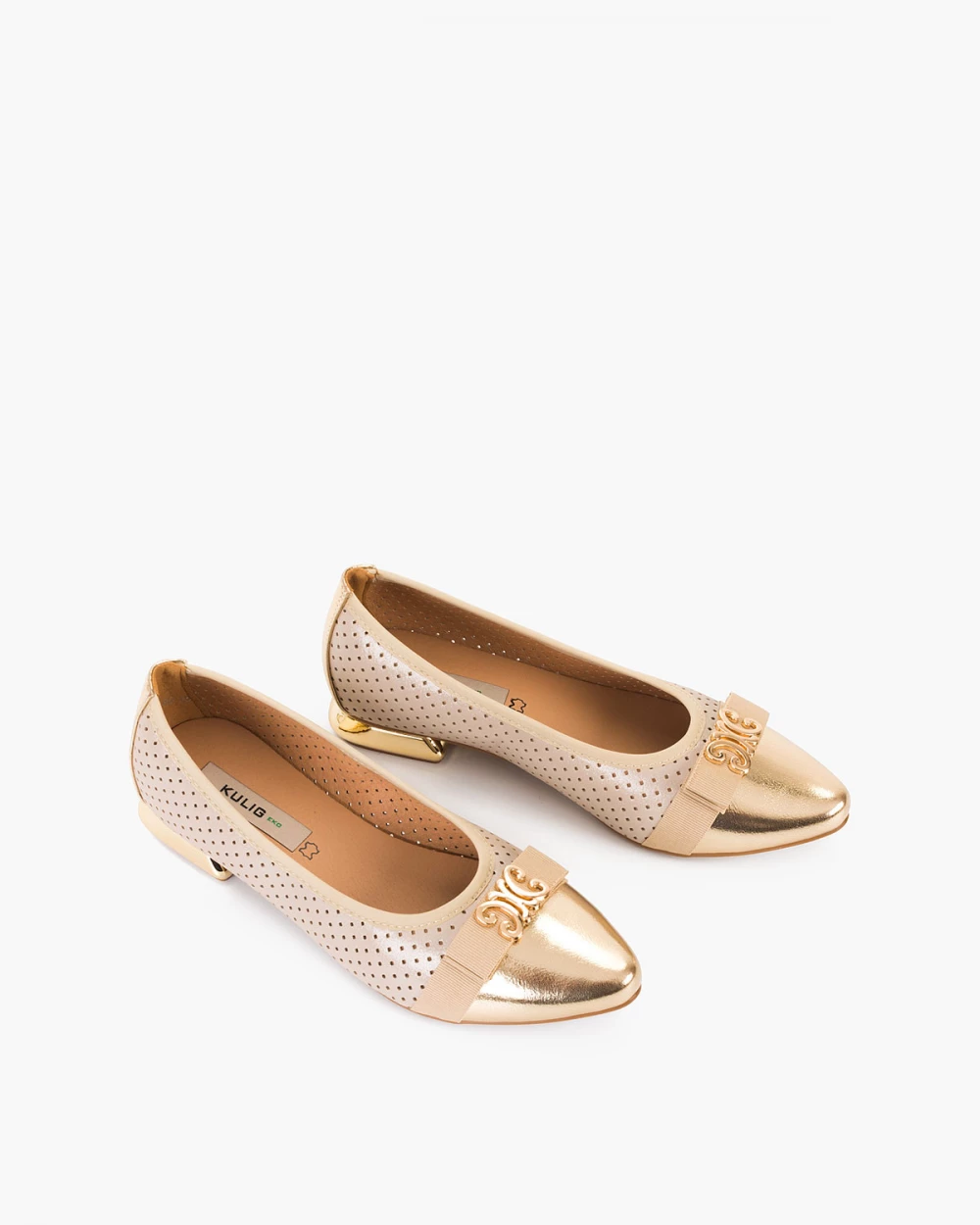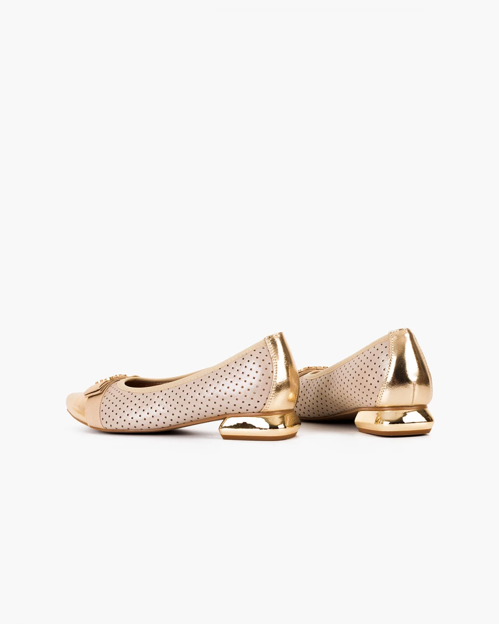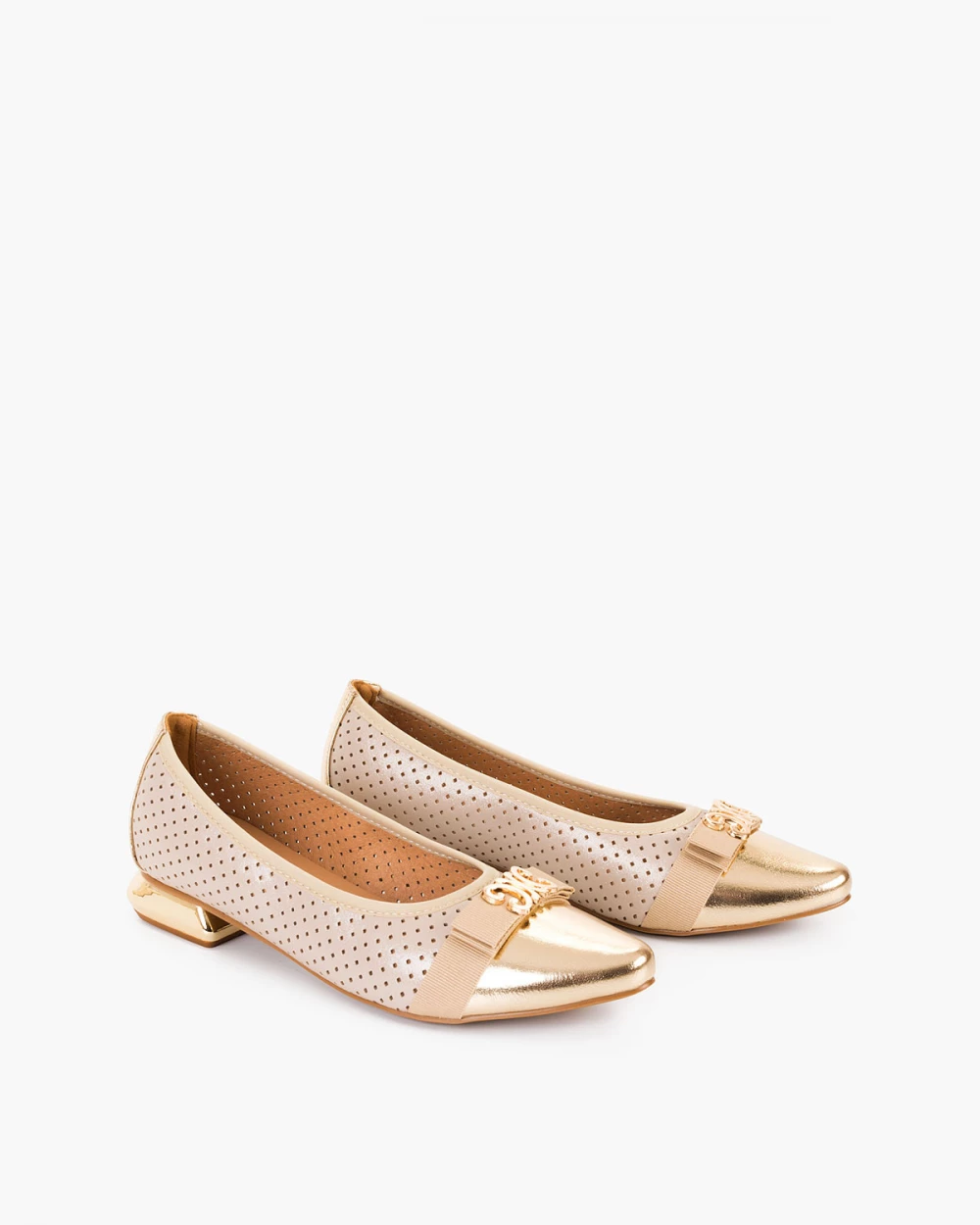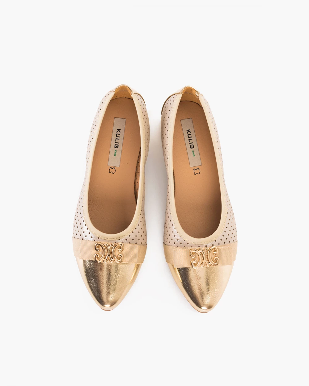 Beżowo-złote baleriny damskie ze skóry ekologicznej na klocku