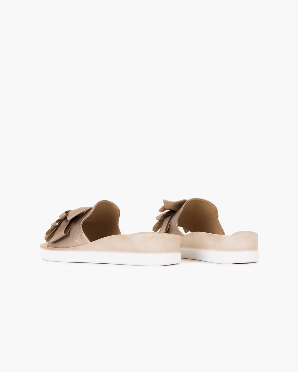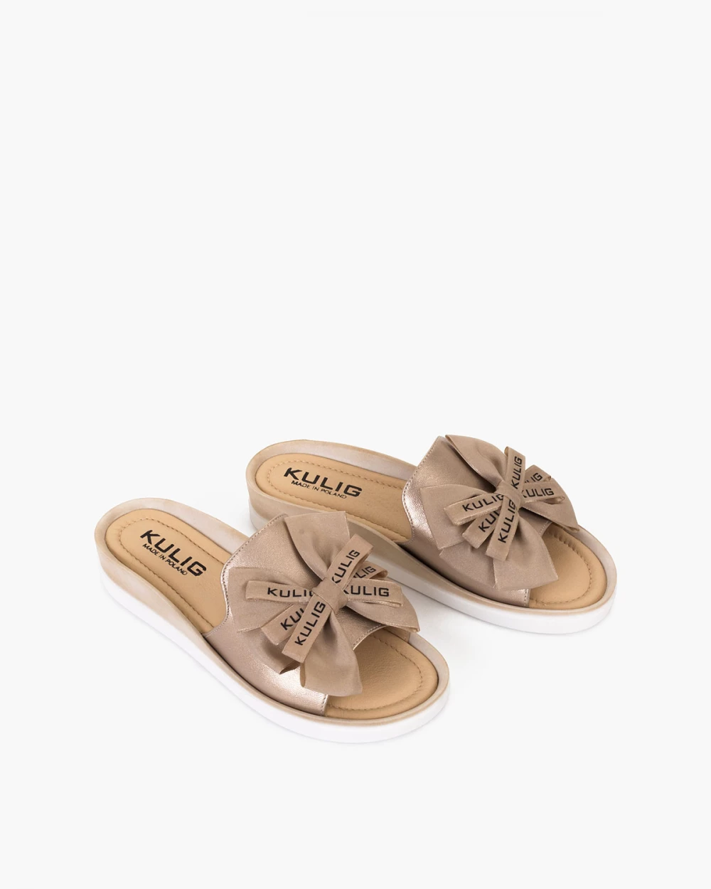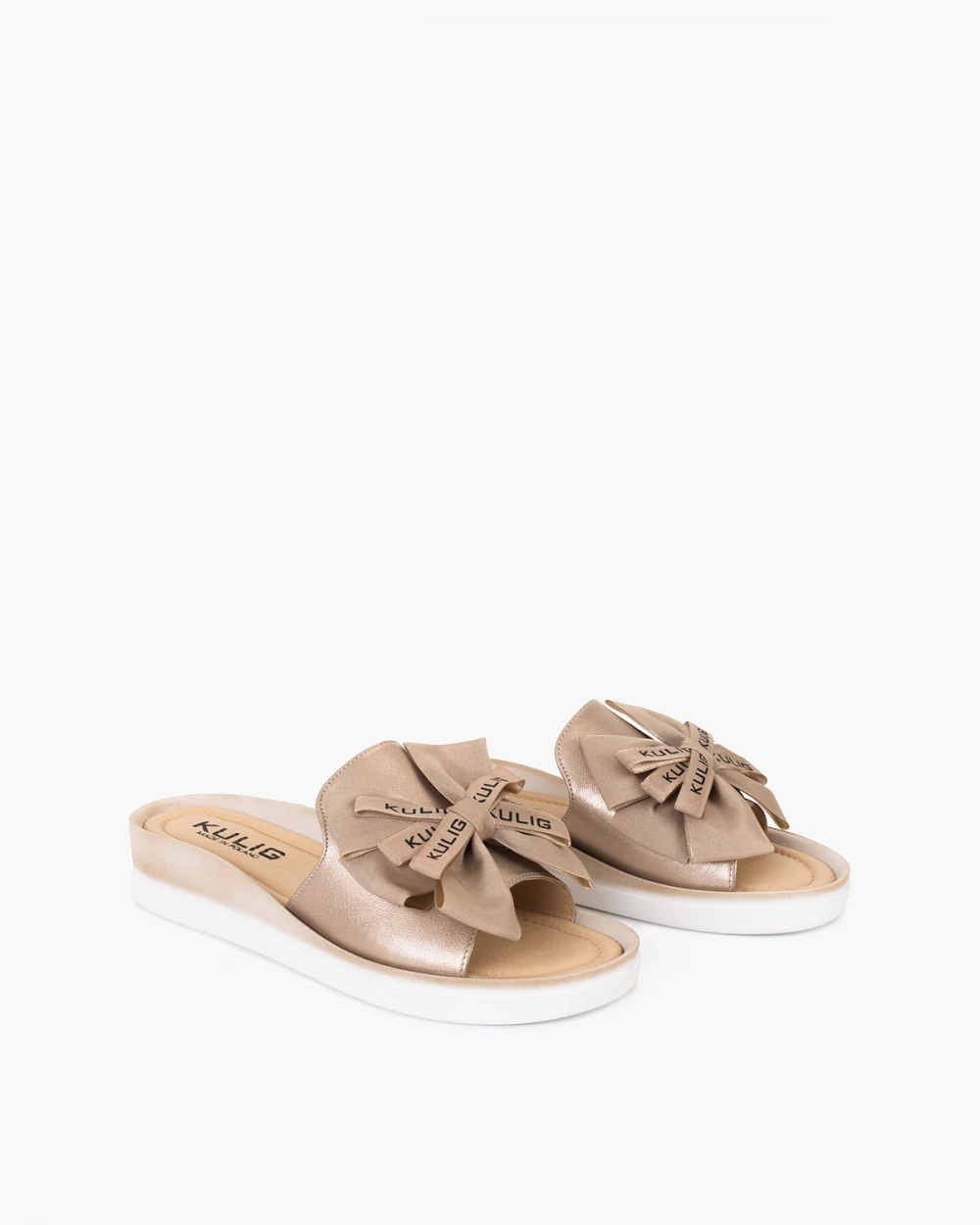 Złote klapki damskie ze skóry naturalnej na koturnie
