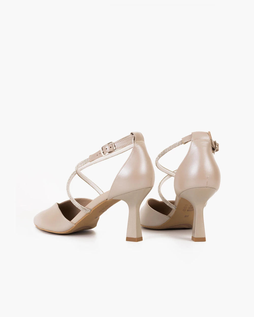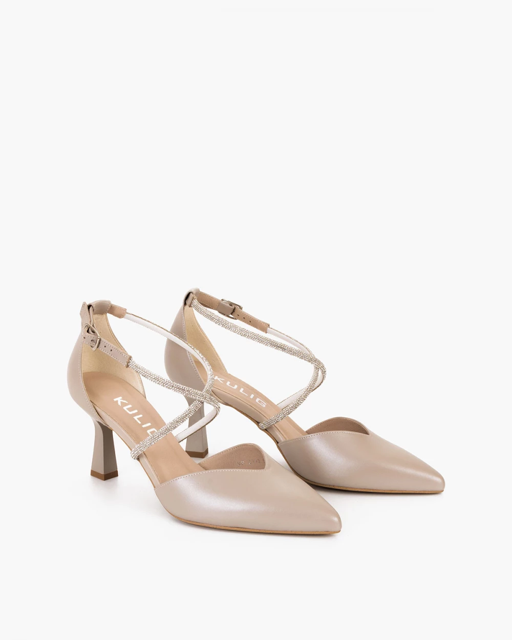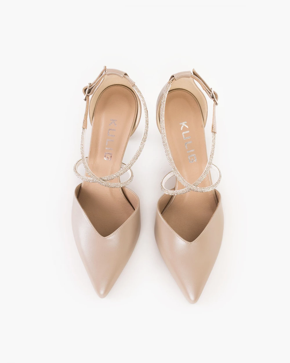 Perłowe czółenka skórzane na szpilce z cyrkoniami