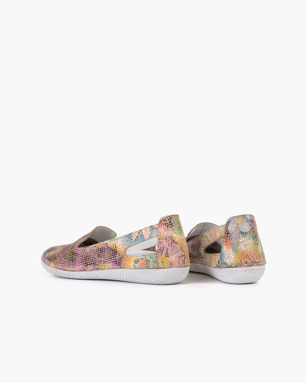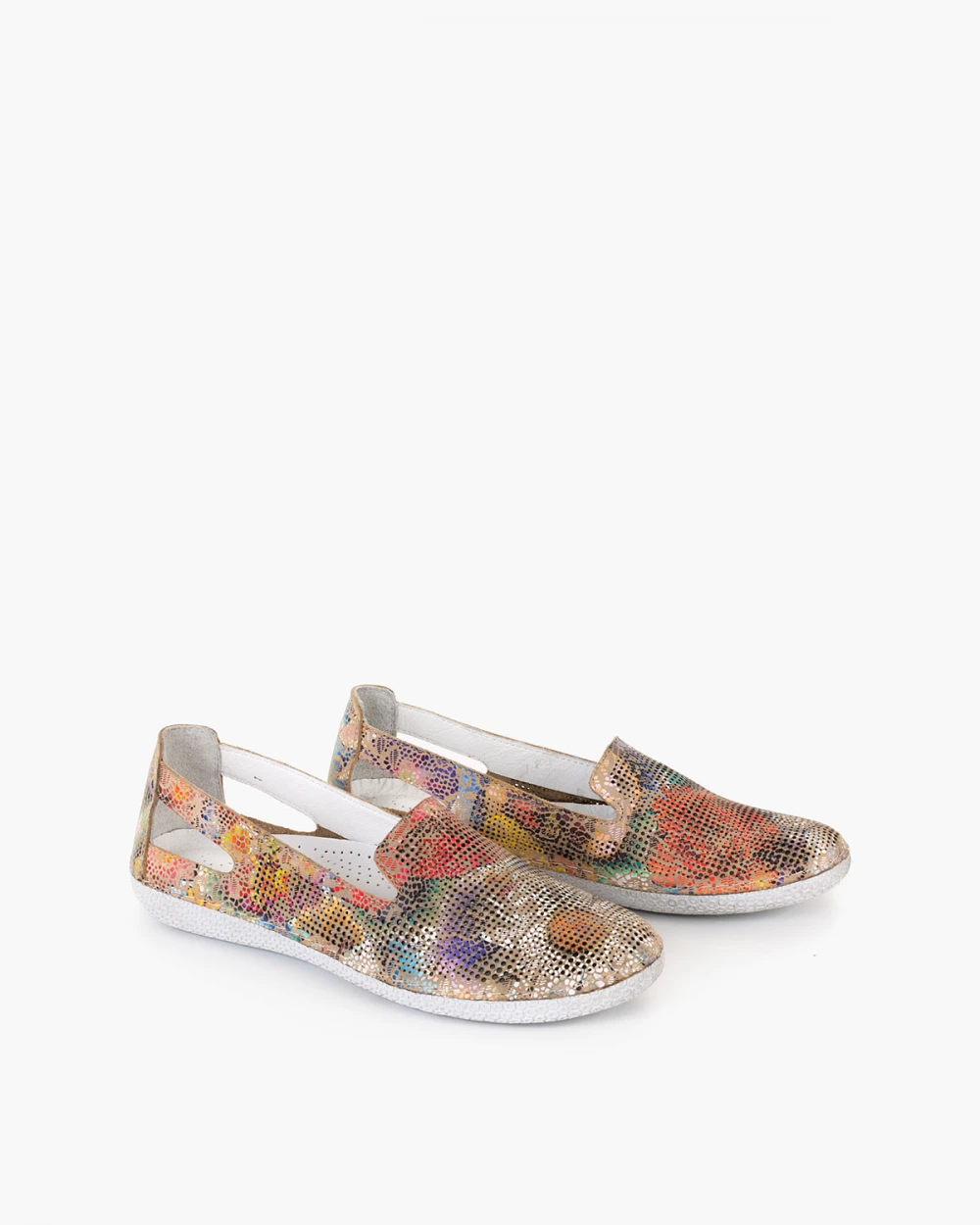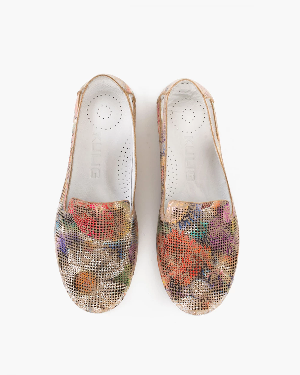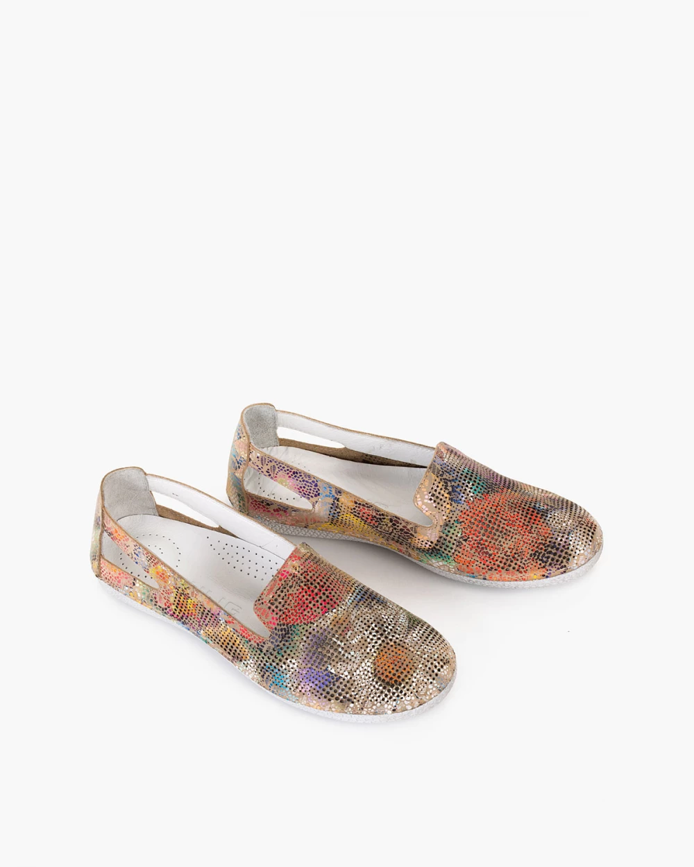 Wielokolorowe mokasyny skórzane z motywem kwiatowym