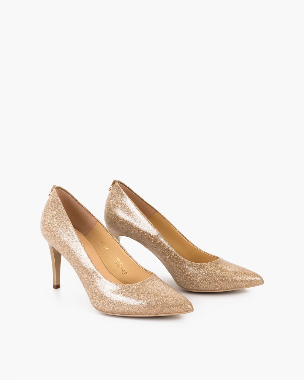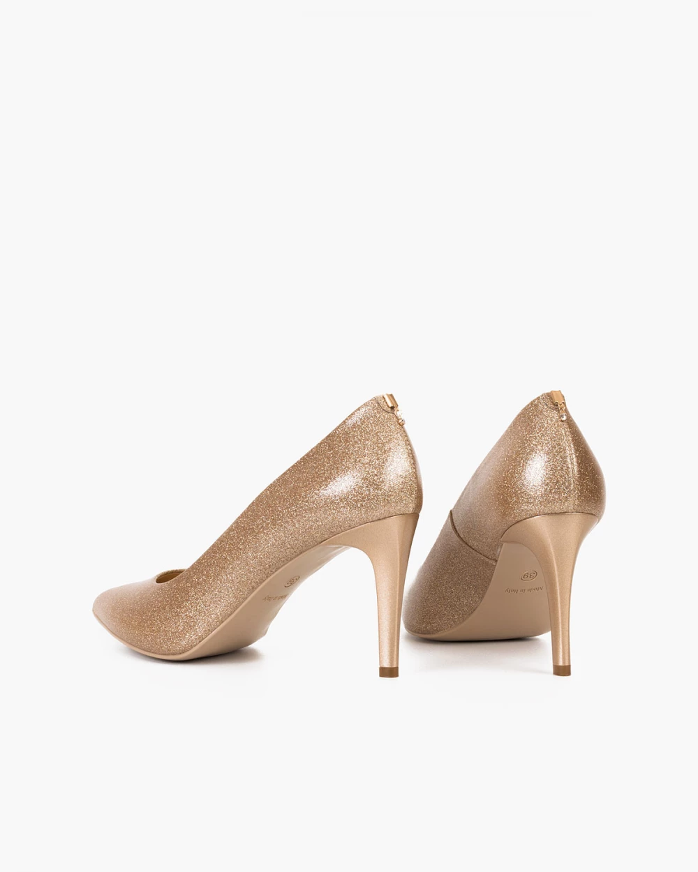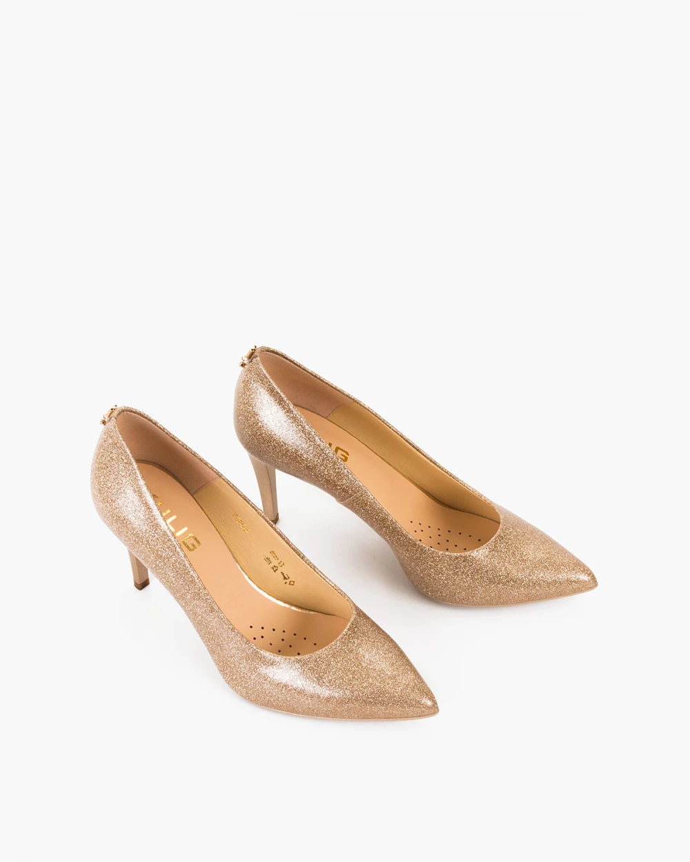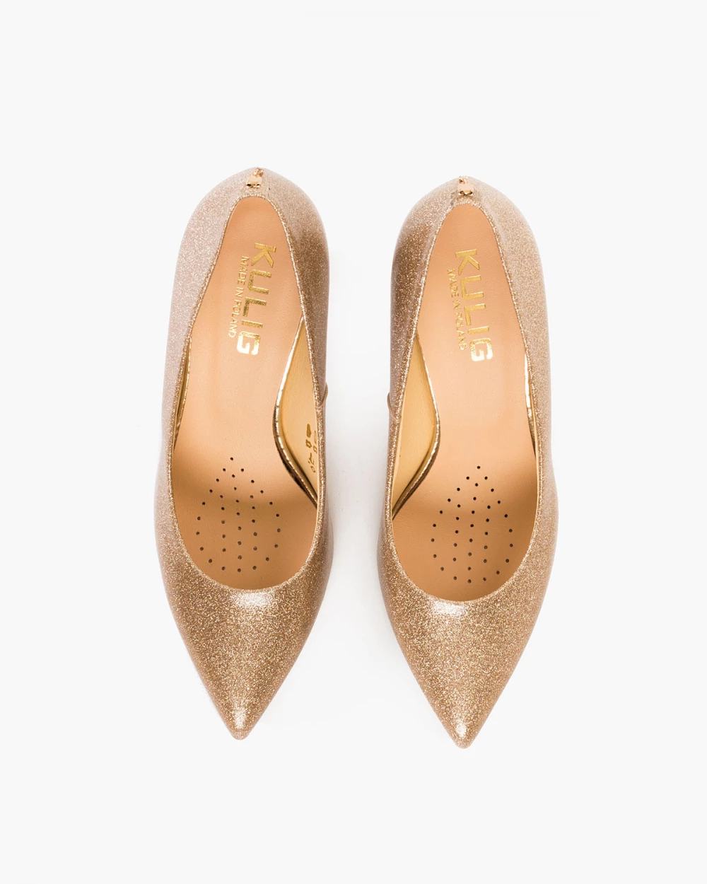 Złote czółenka damskie ze skóry naturalnej na szpilce z brokatem