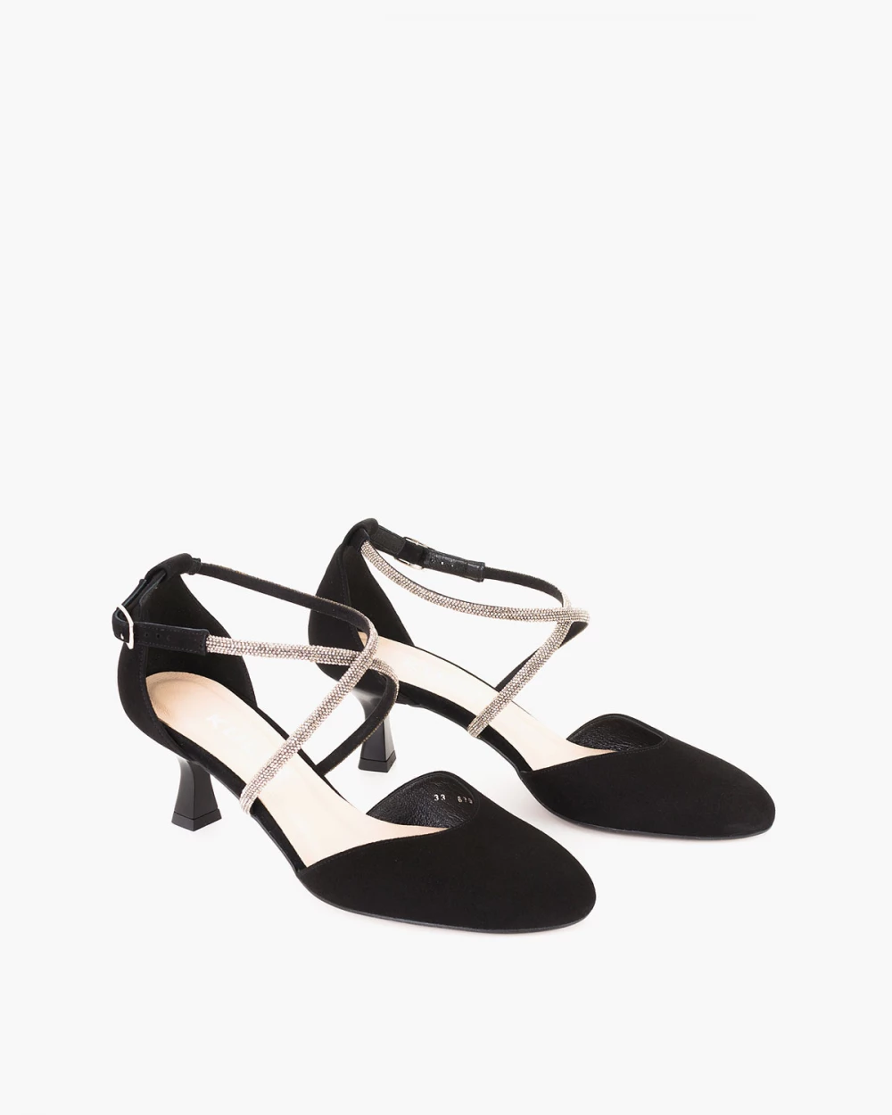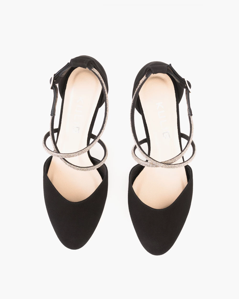 Czarne czółenka damskie zamszowe z cyrkoniami na szpilce