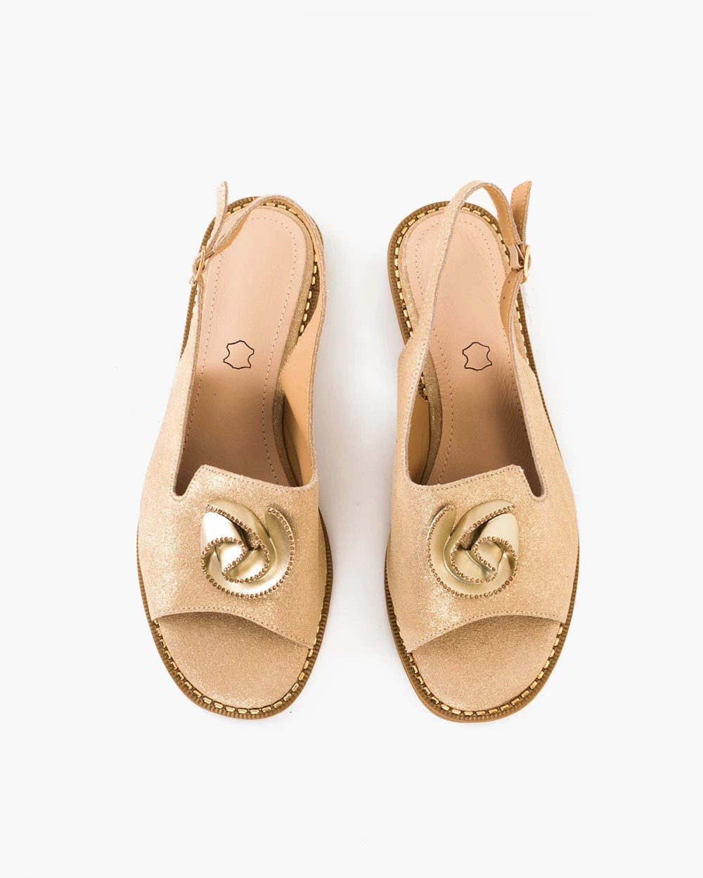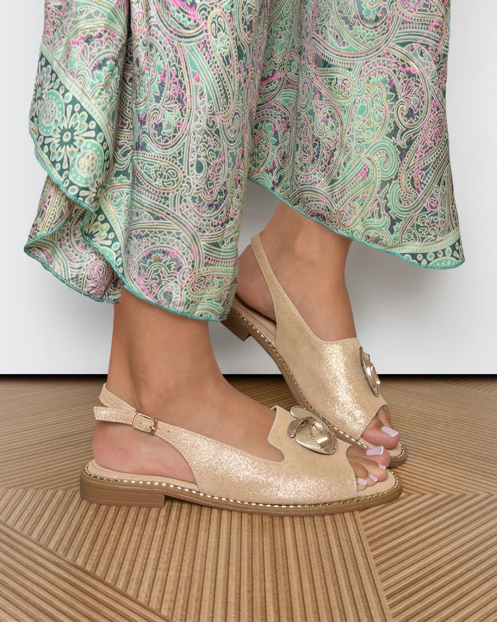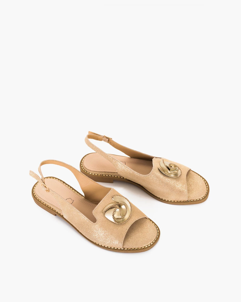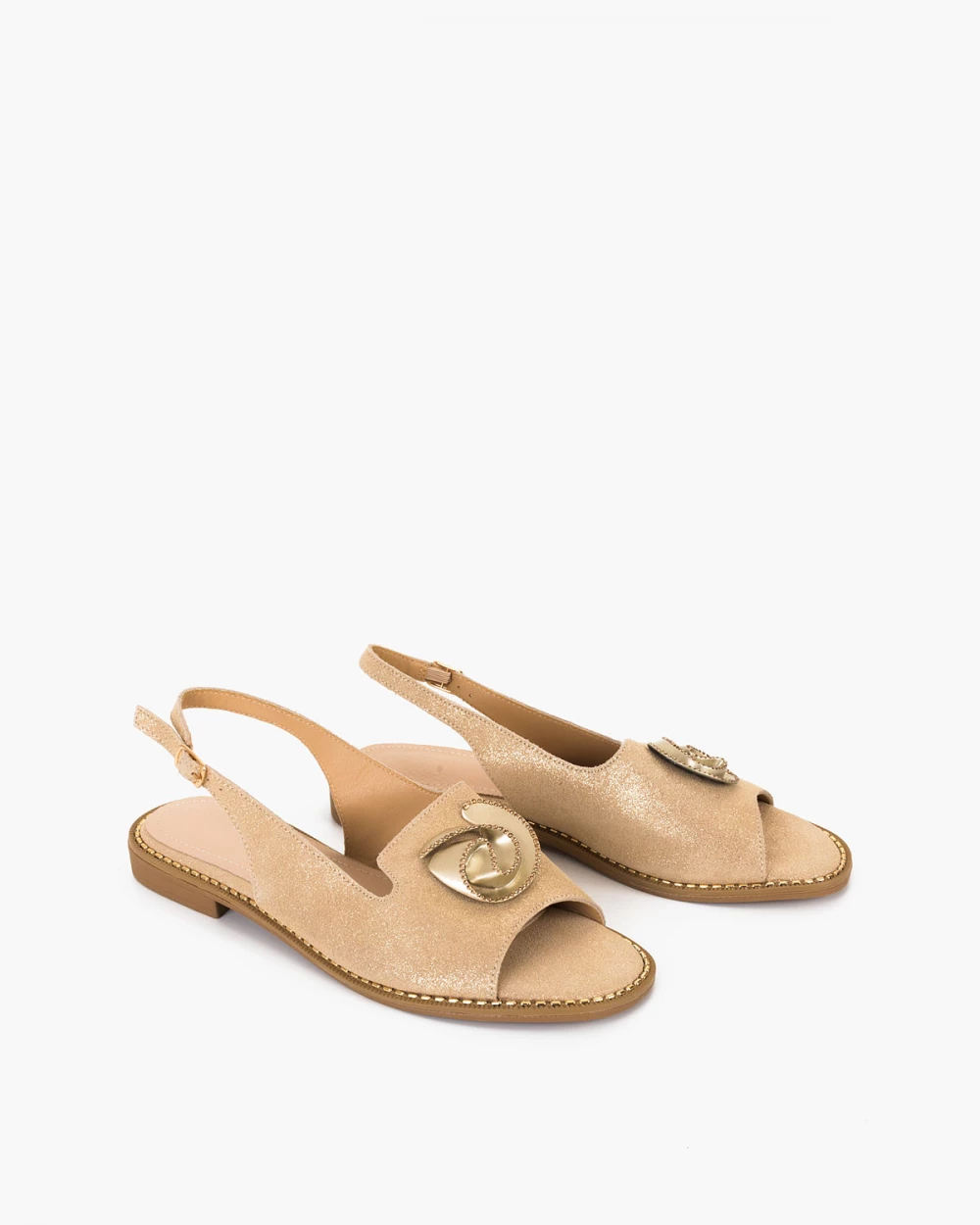 Złote sandały damskie ze skóry nubukowej z różyczką