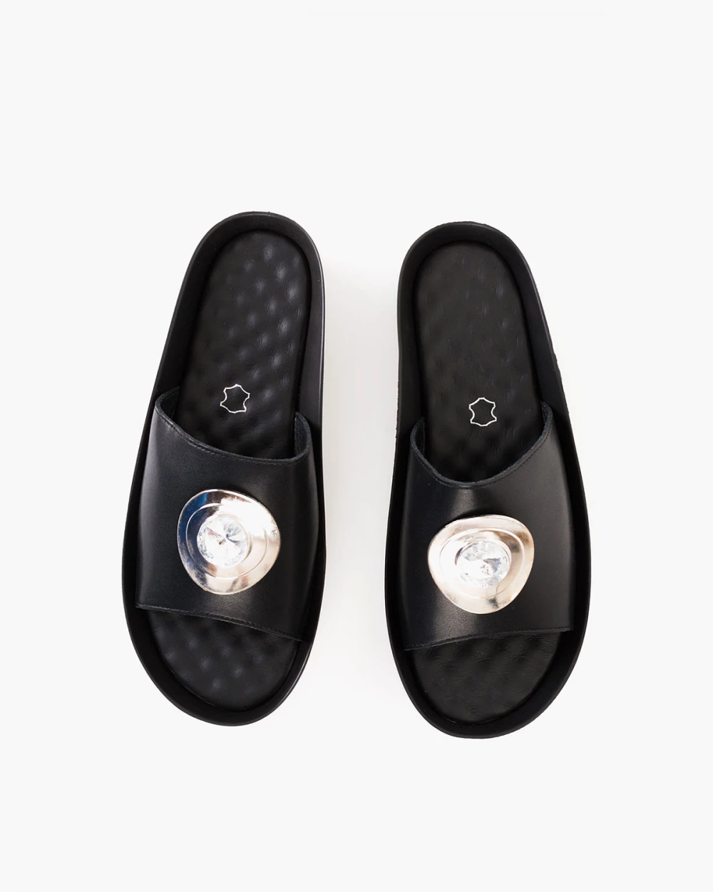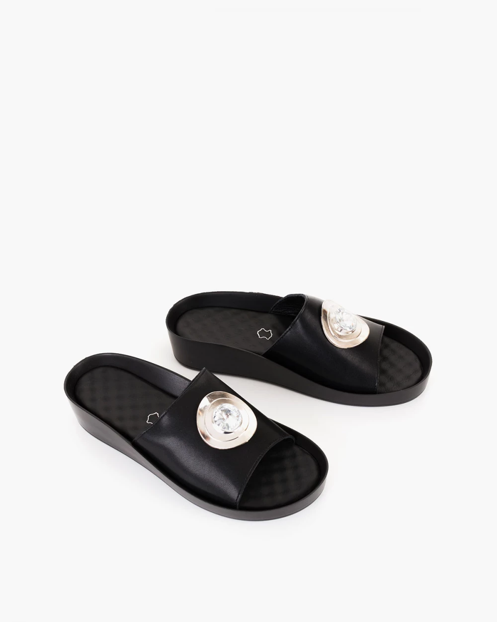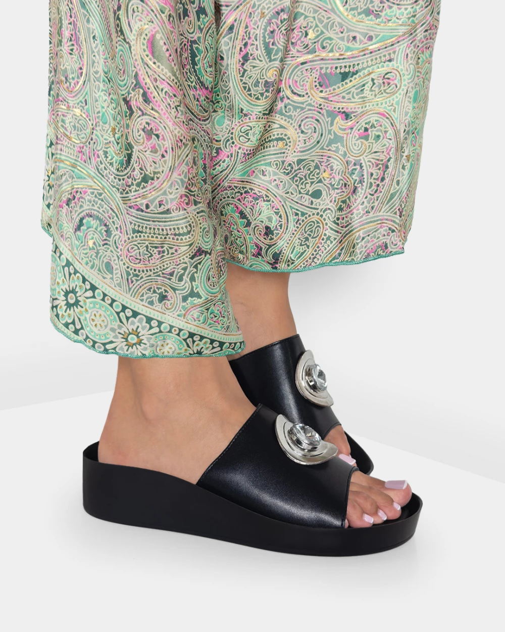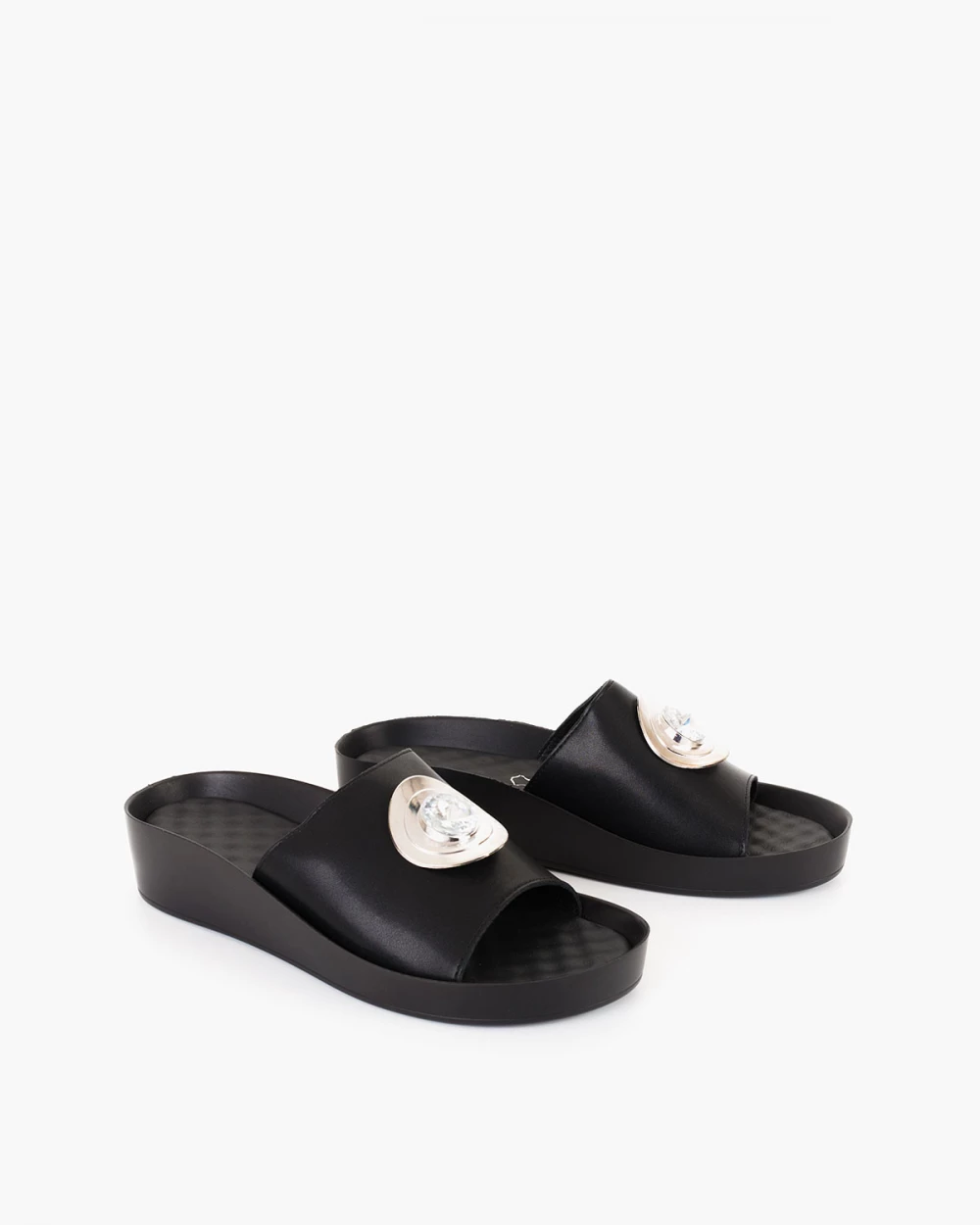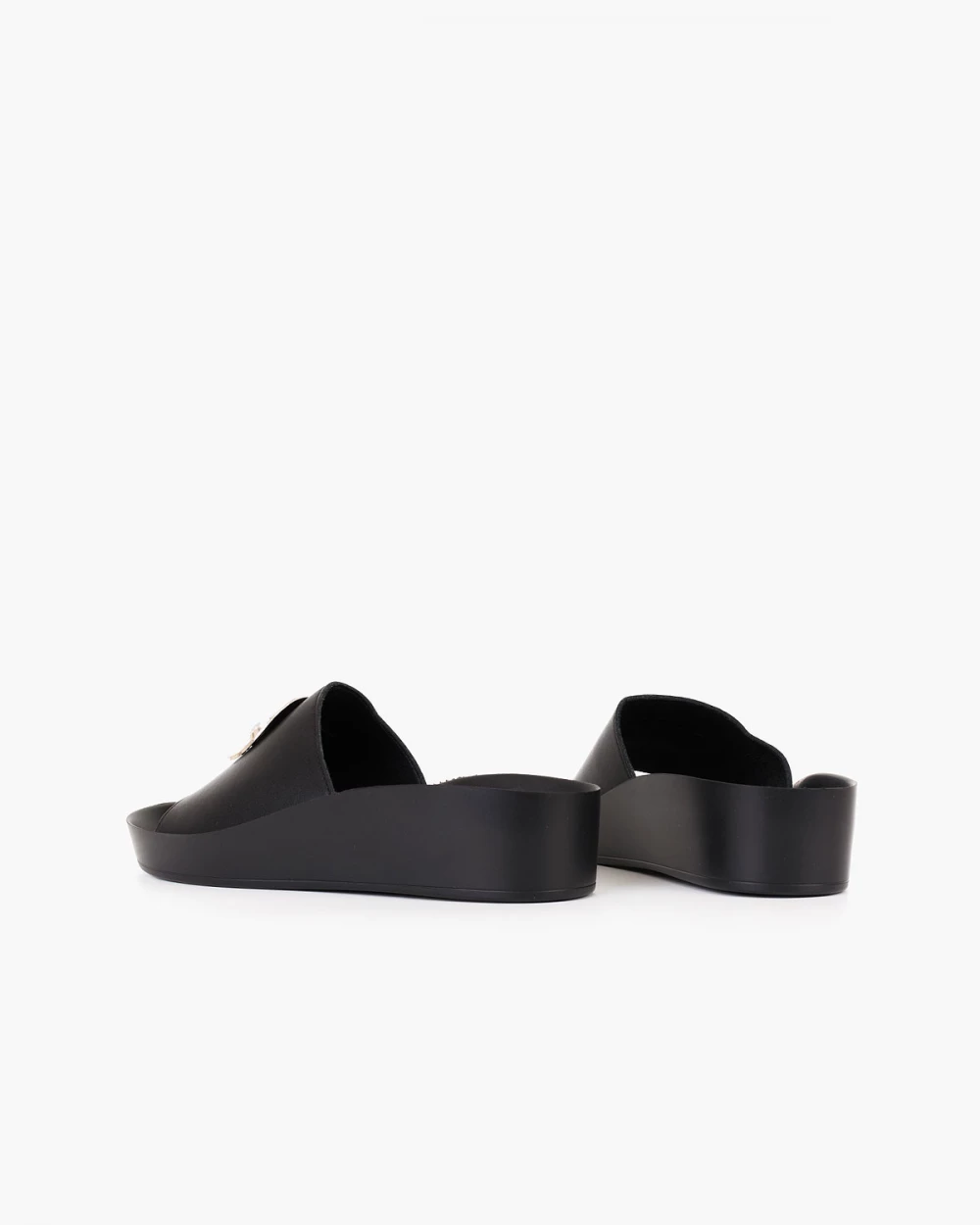 Czarne klapki damskie skórzane na koturnie z kółkiem