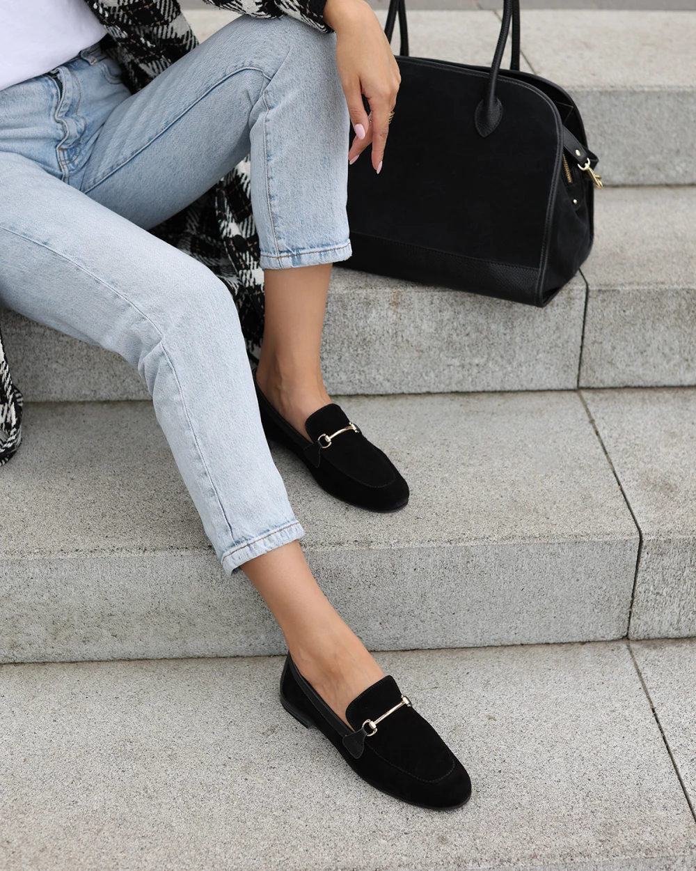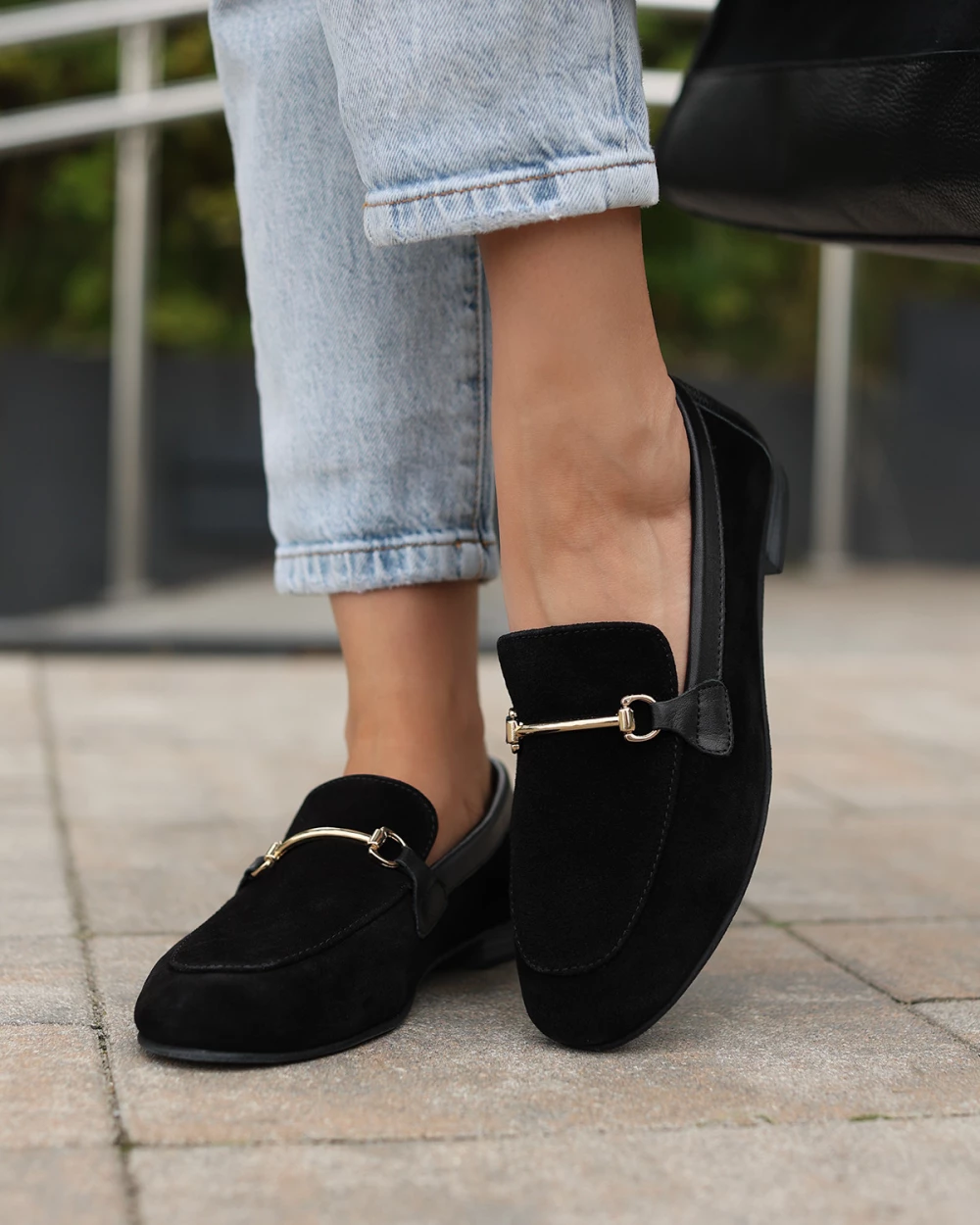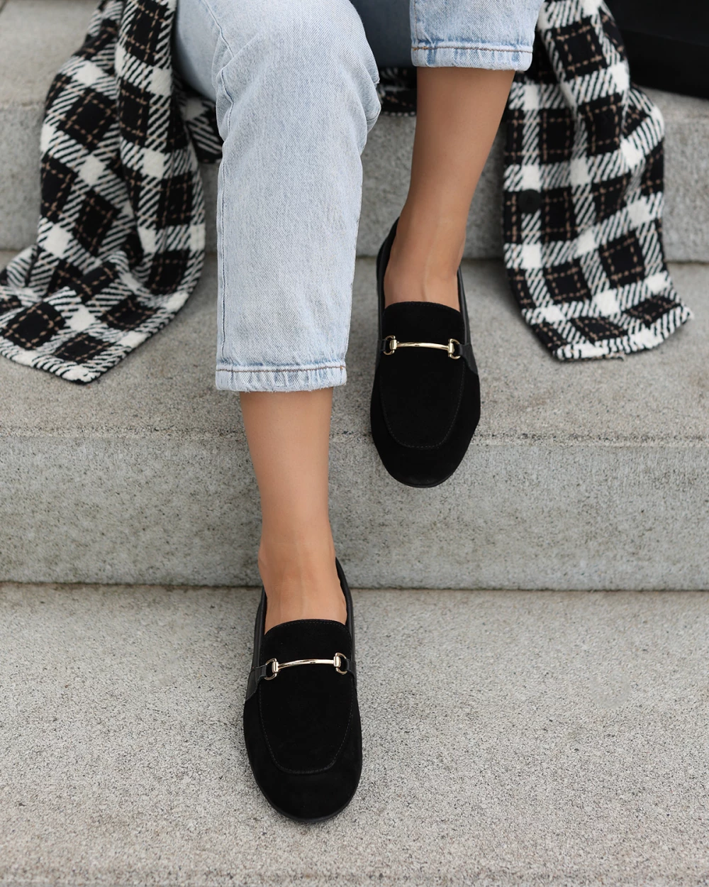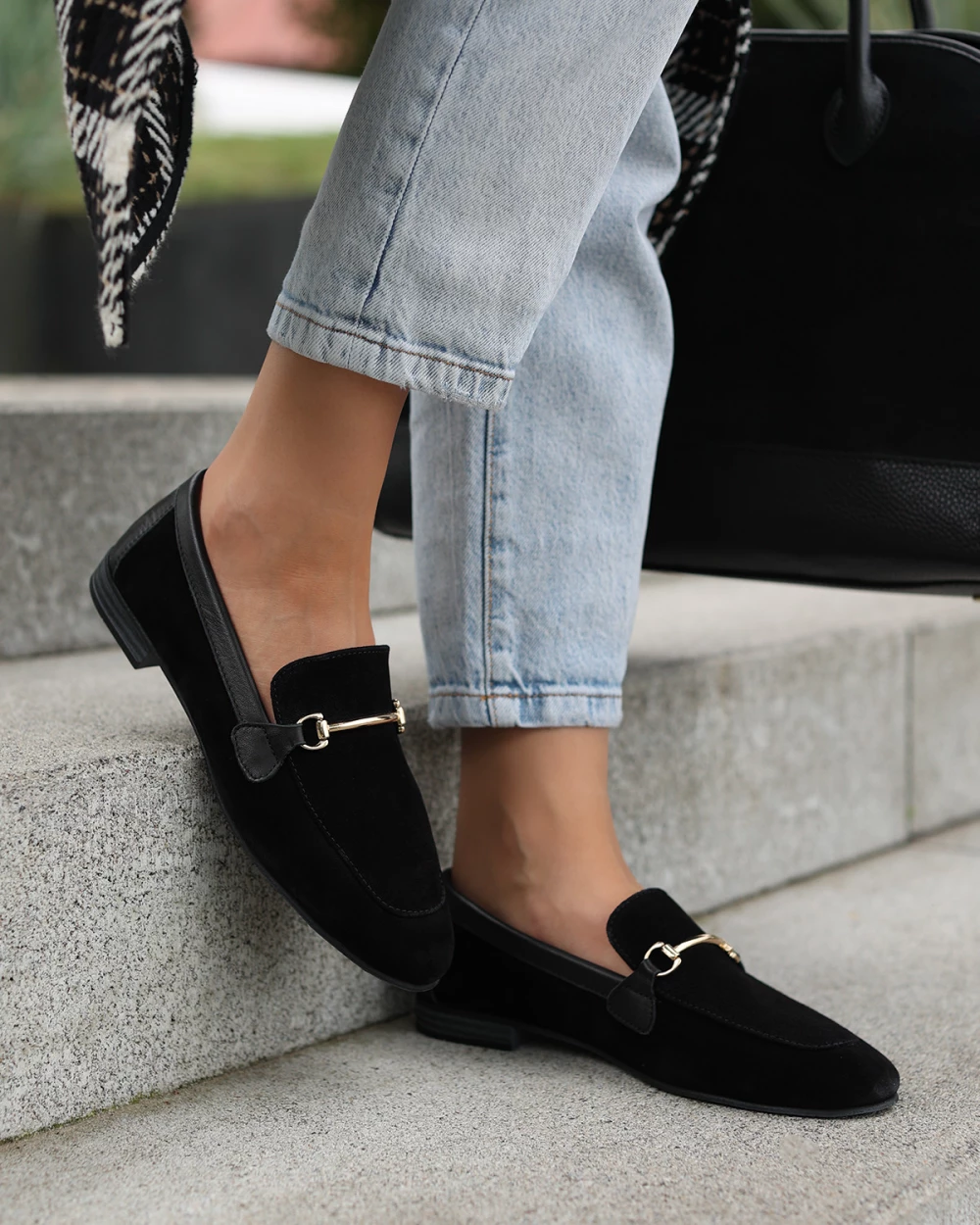 Czarne mokasyny damskie z naturalnej skóry zamszowej z klamrą