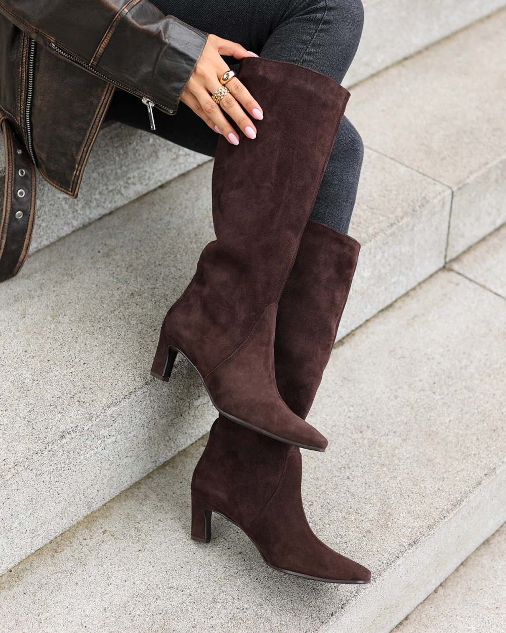 Czekoladowe kozaki damskie ze skóry zamszowej na słupku