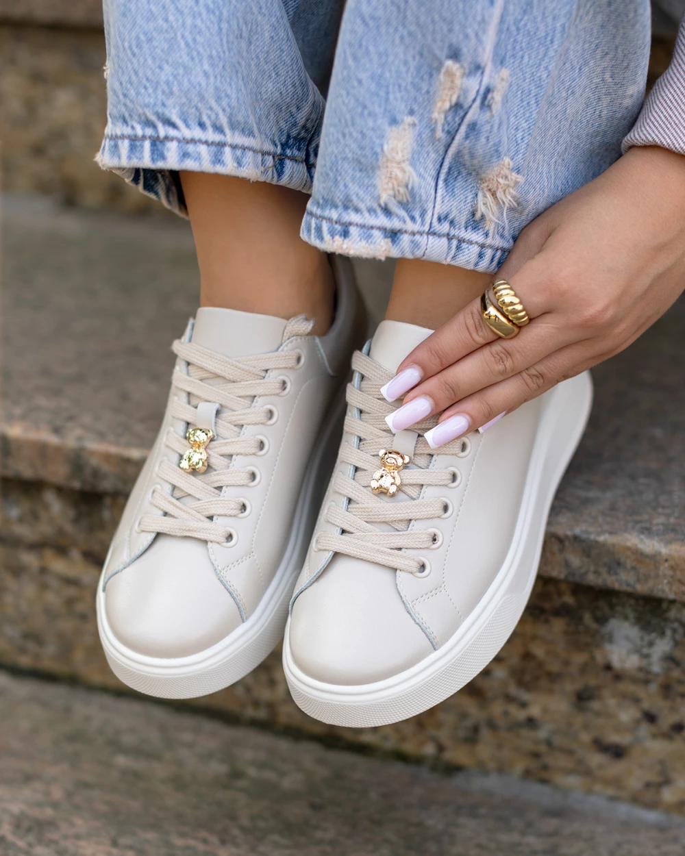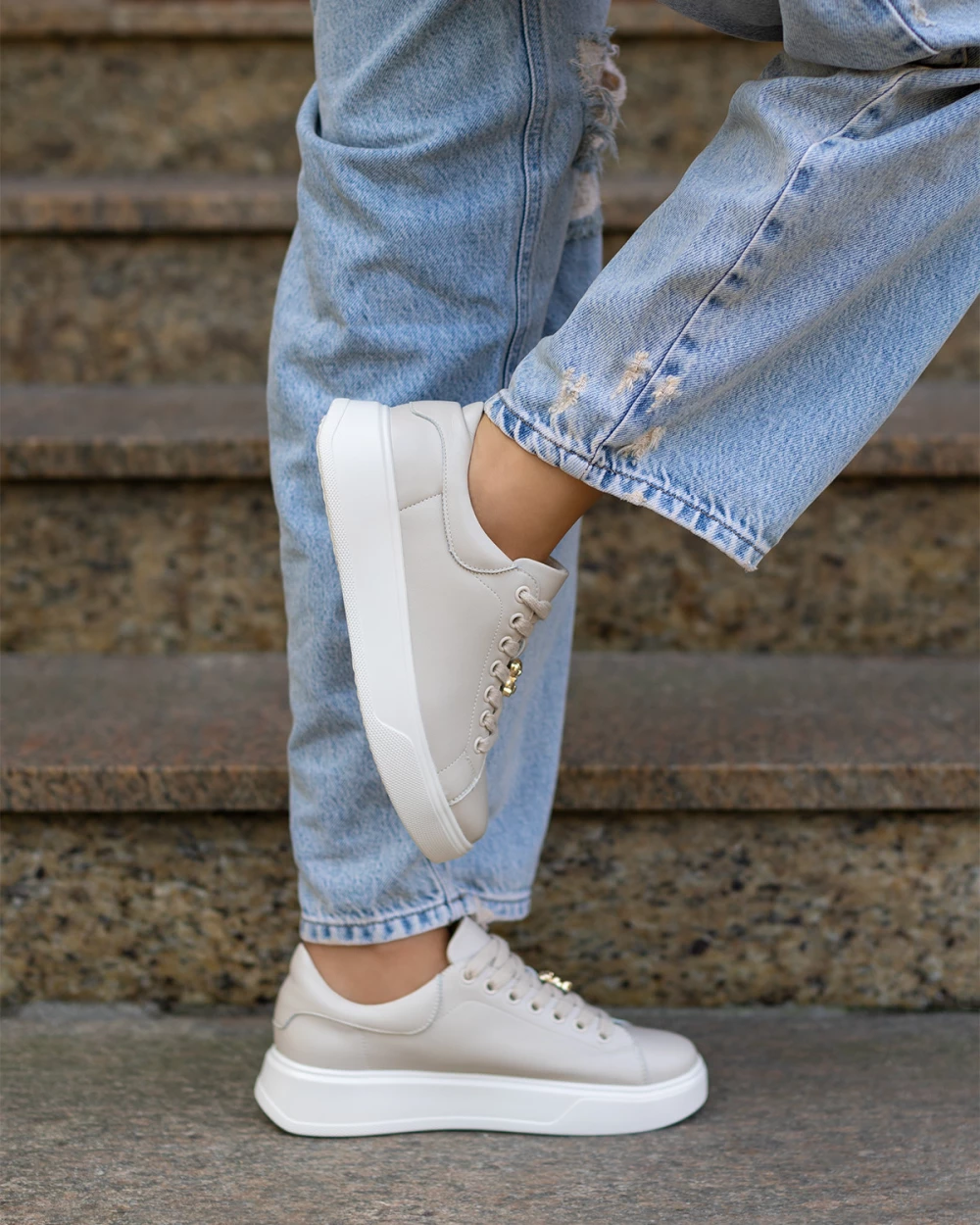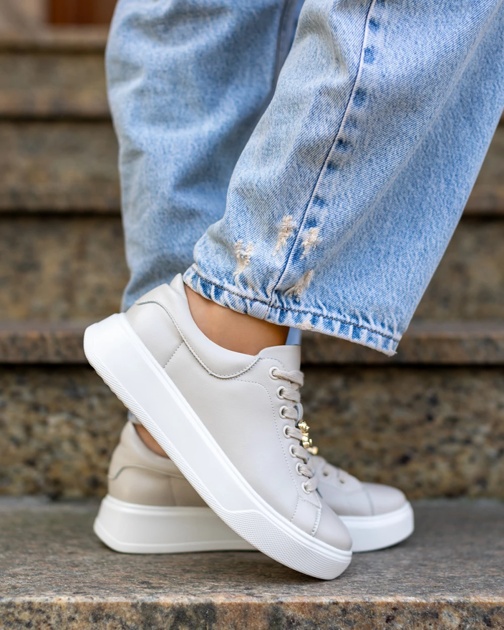 Jasnobeżowe trampki damskie skórzane na platformie