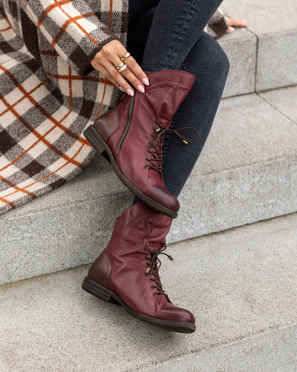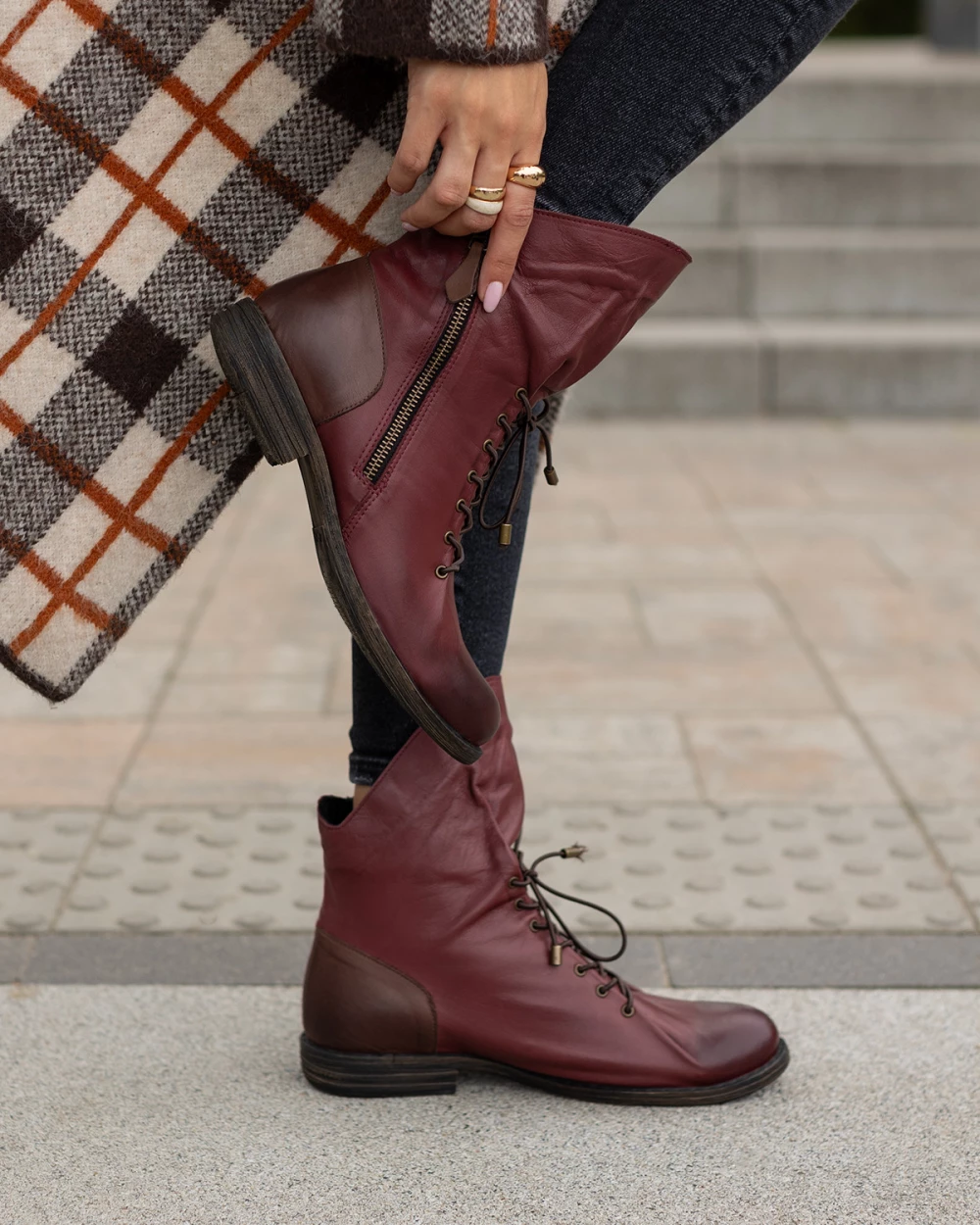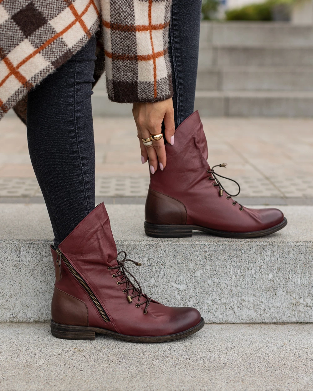Bordowe trzewiki damskie ze skóry naturalnej na niskim obcasie