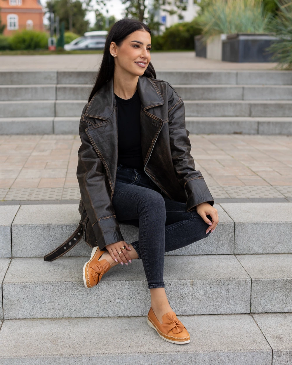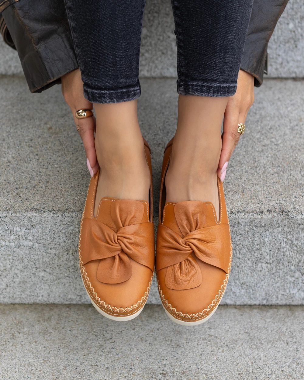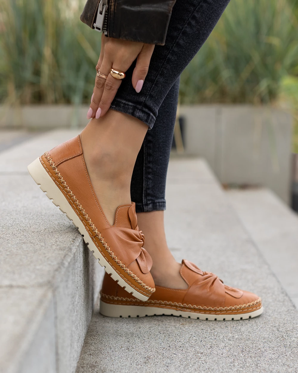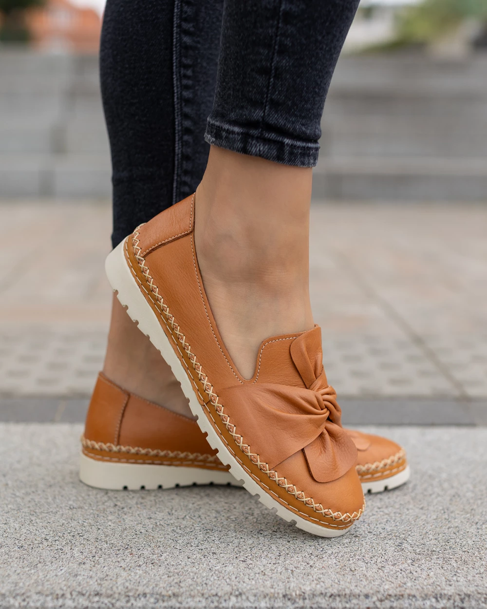 Rude półbuty damskie ze skóry licowej z kokardą