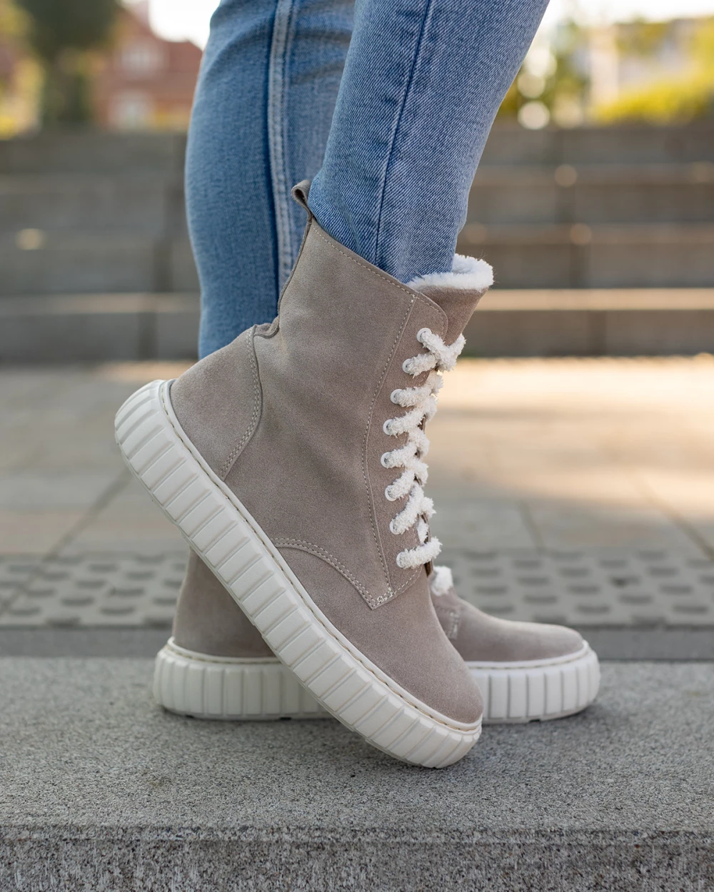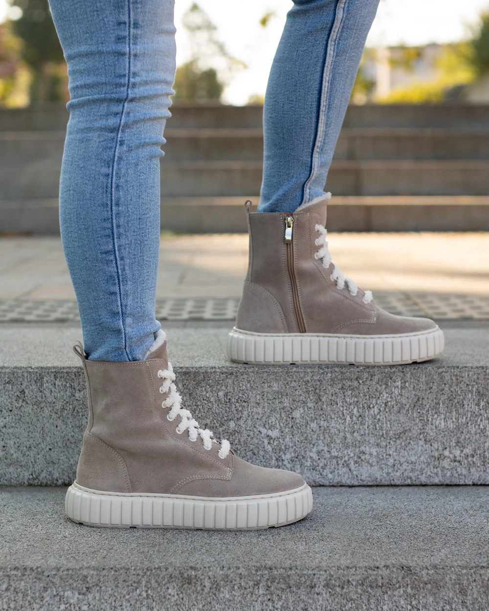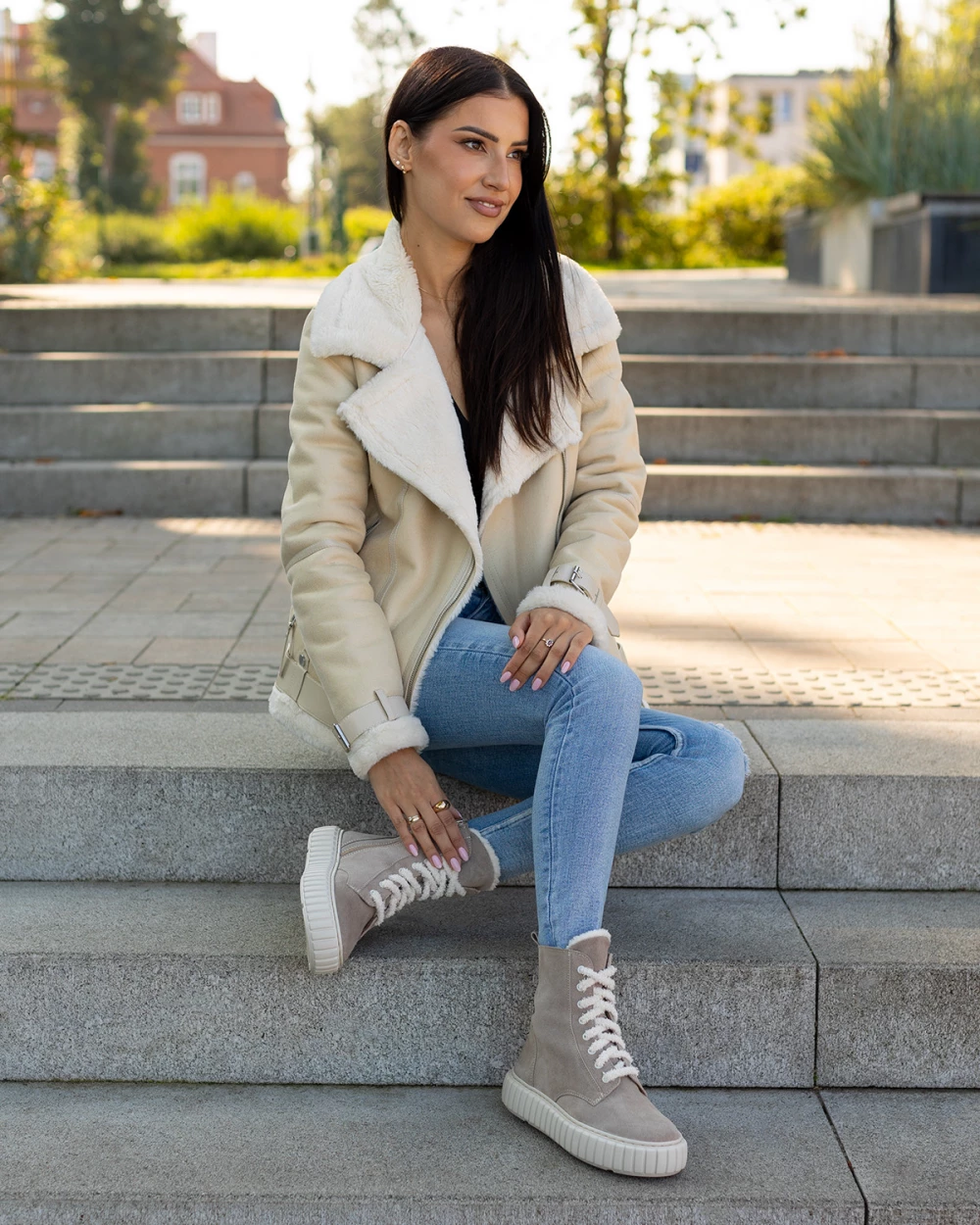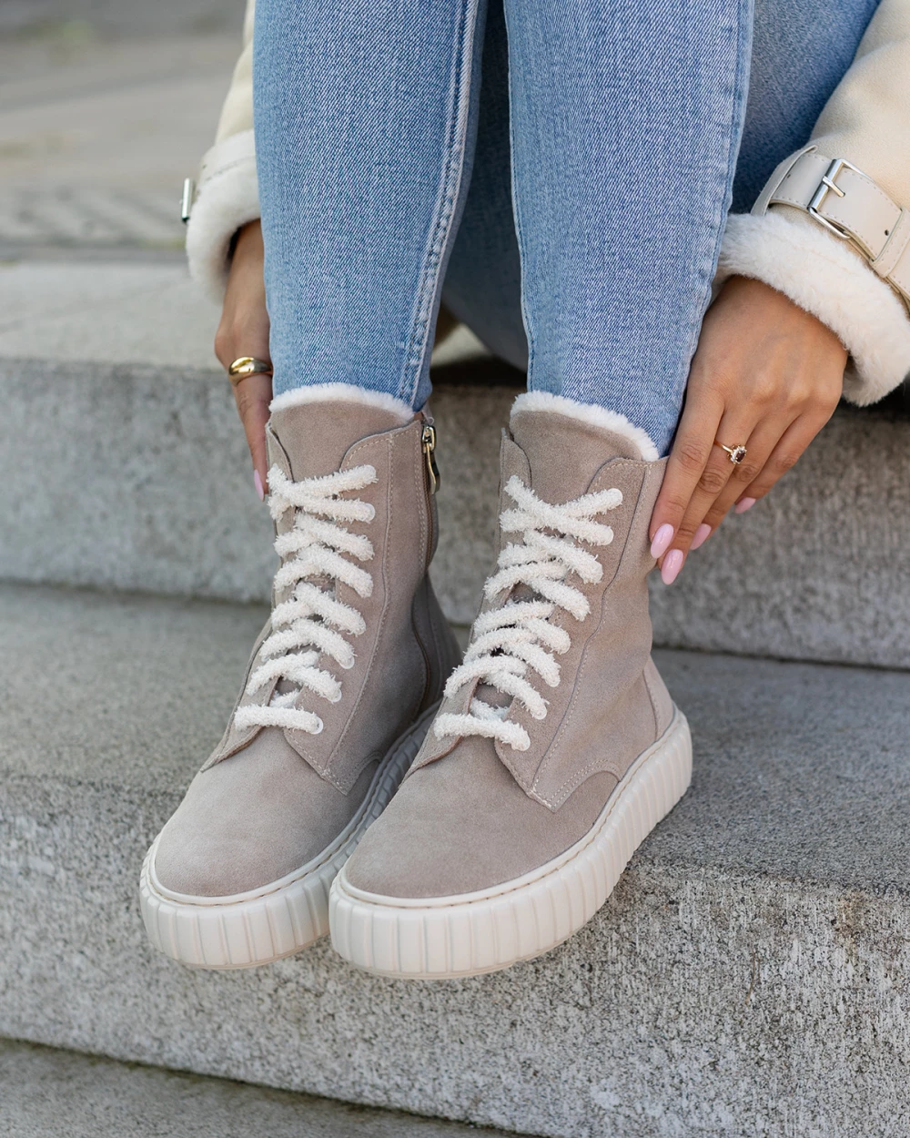 Beżowe trzewiki damskie ze skóry welurowej na platformie