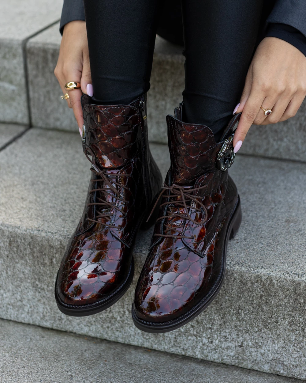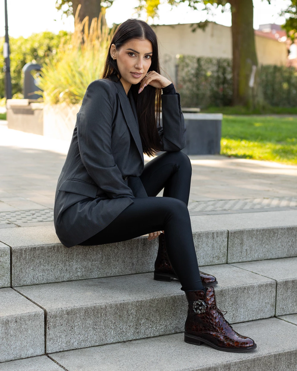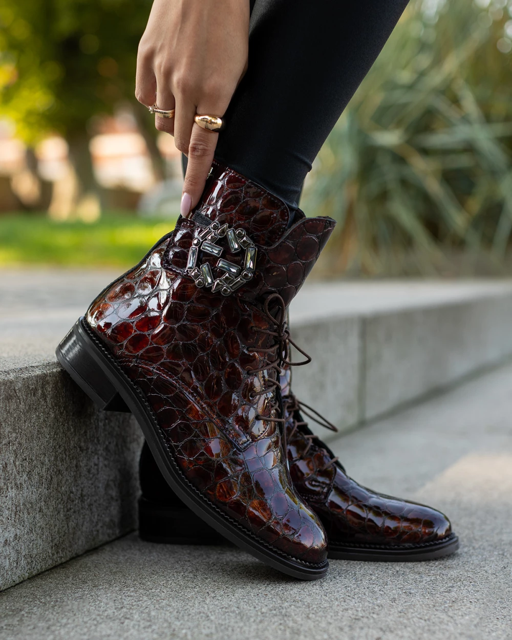 Brązowo-czarne trzewiki damskie ze skóry lakierowanej