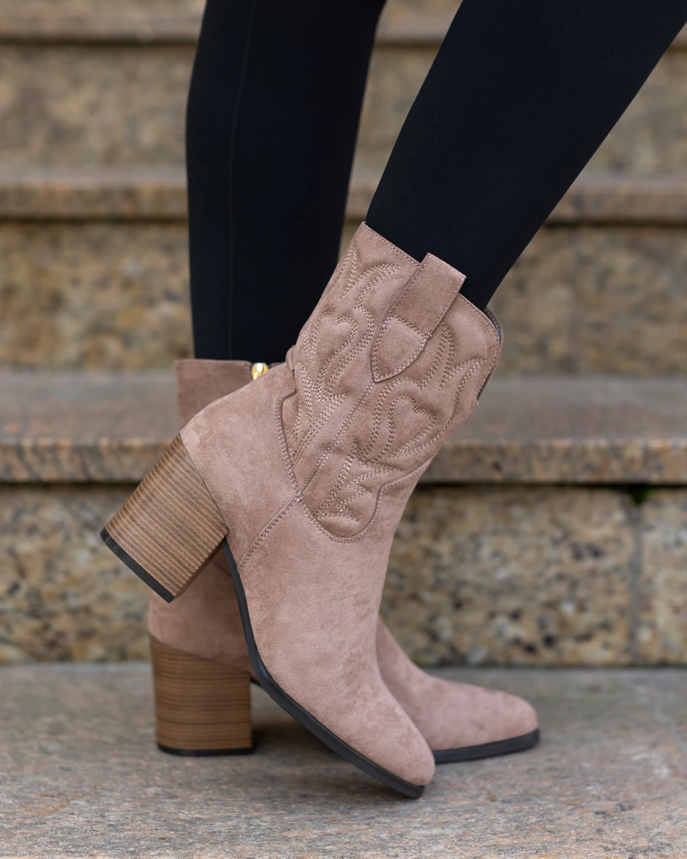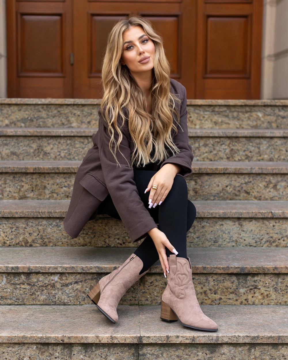 Beżowe kowbojki damskie z eko-zamszu na słupku