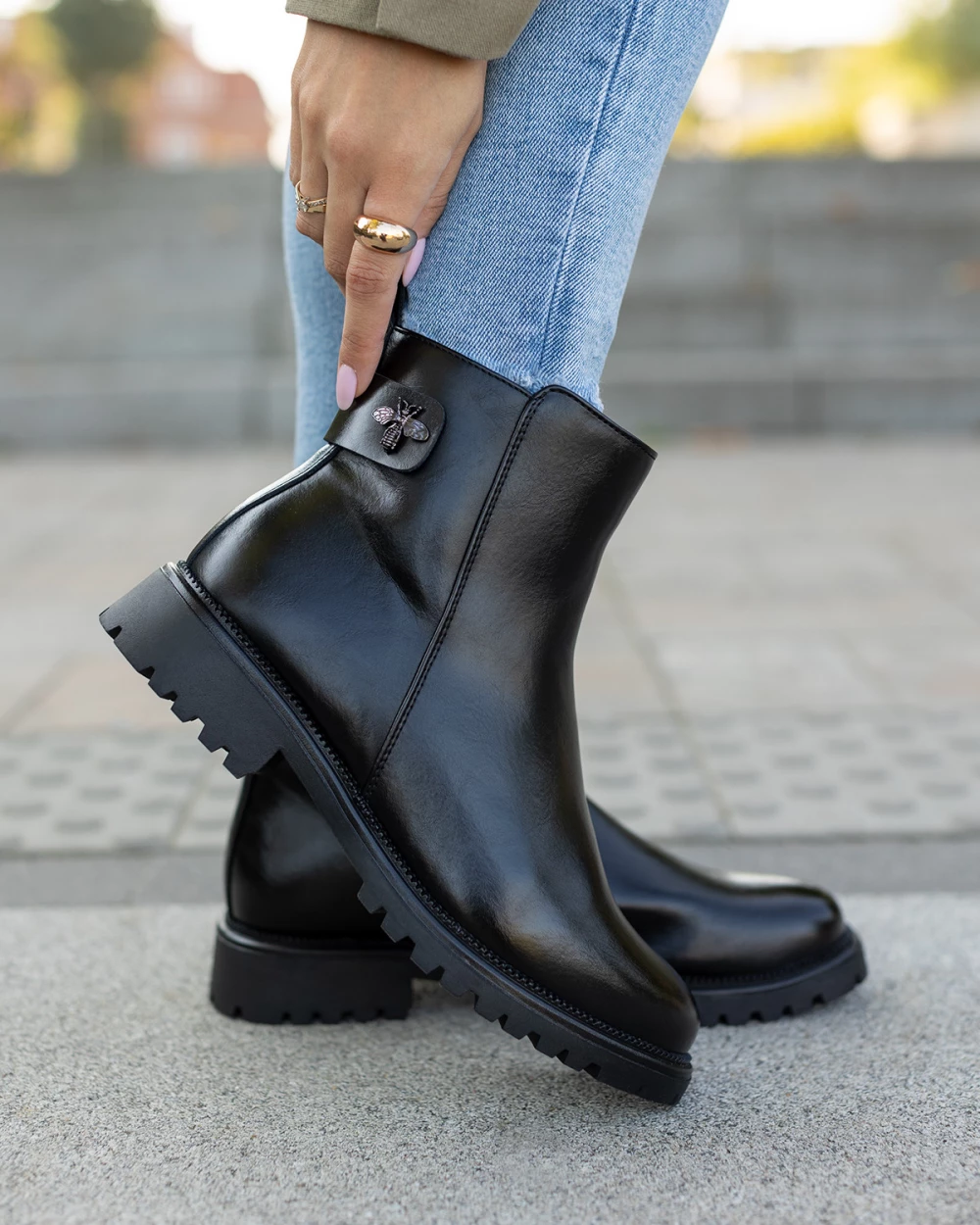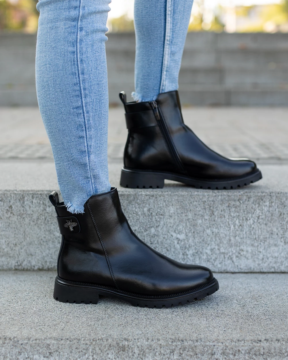Czarne botki ze skóry ekologicznej na niskim obcasie