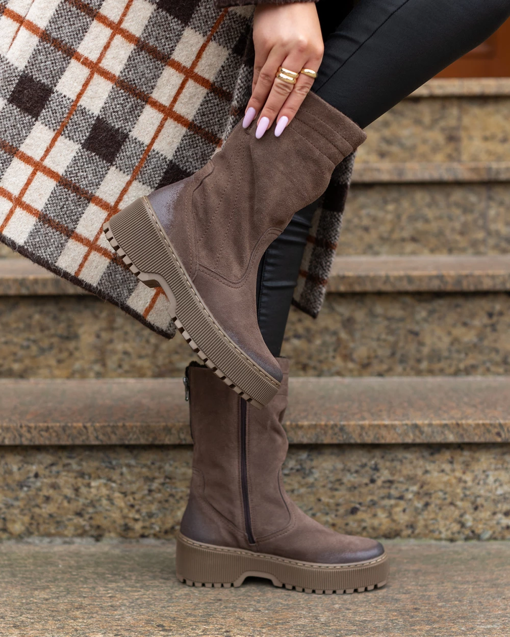 Brązowe botki damskie ze skóry welurowej na obcasie