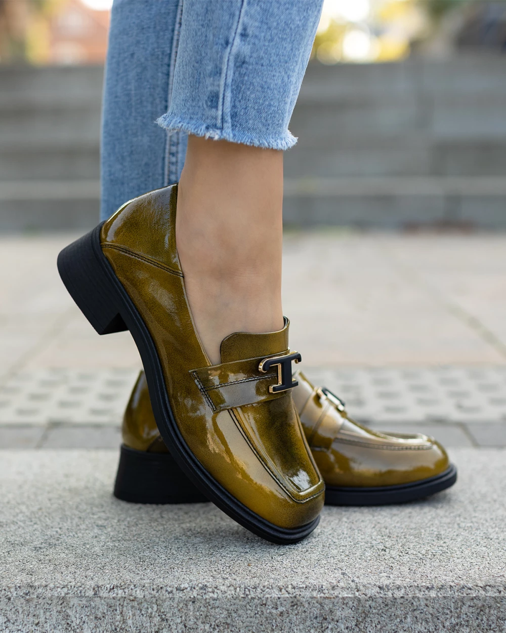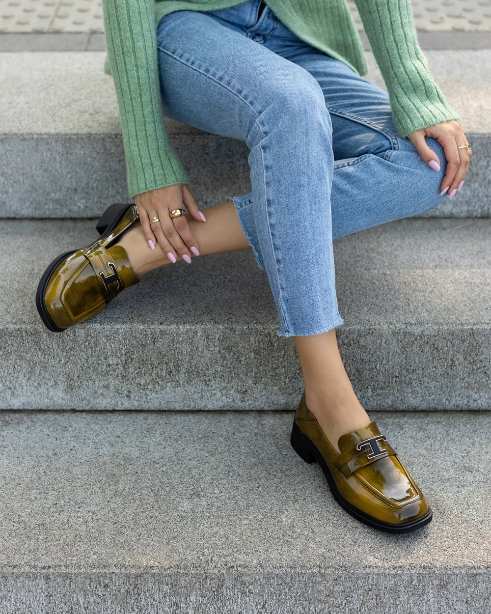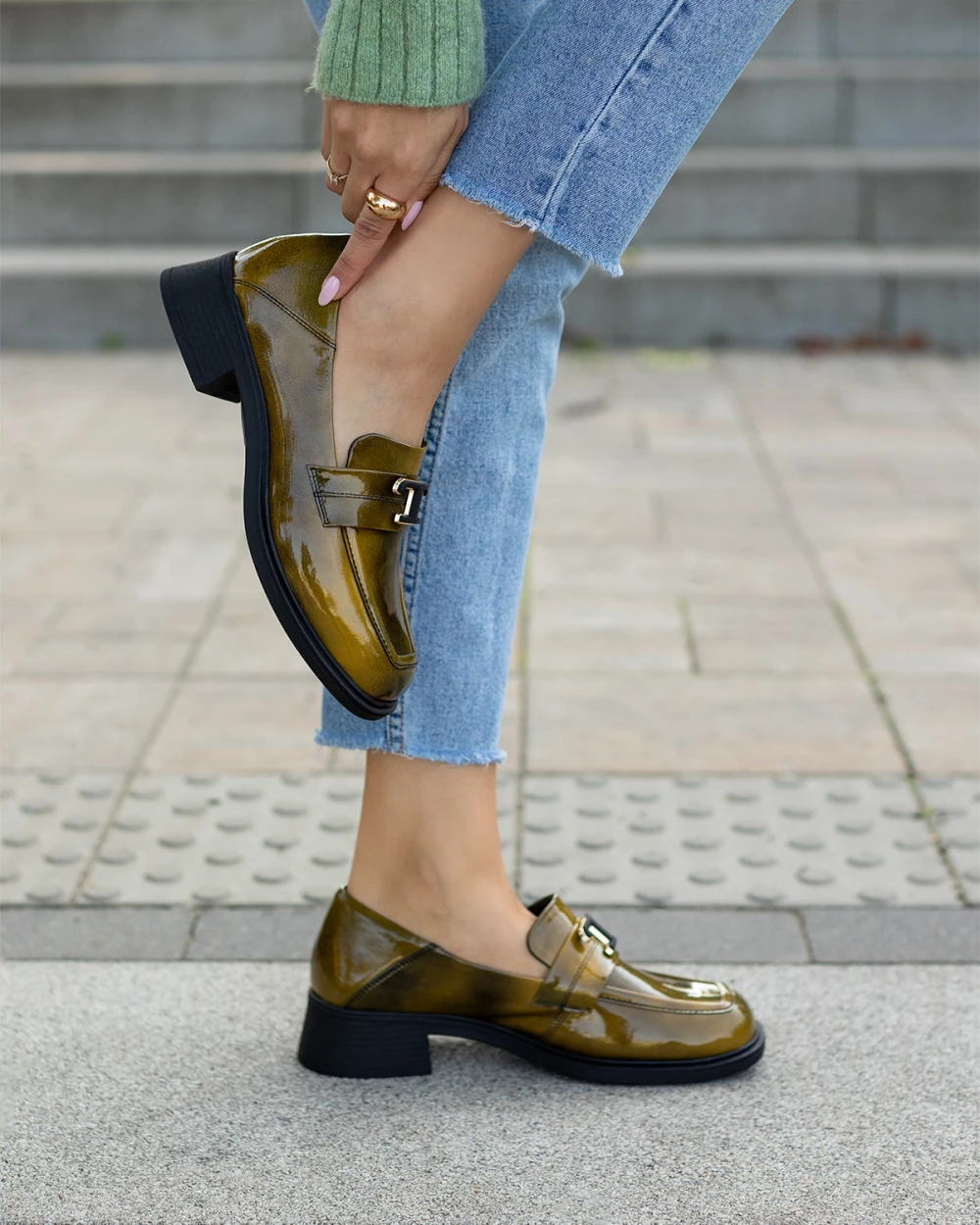 Oliwkowe mokasyny damskie ze skóry lakierowanej na klocku