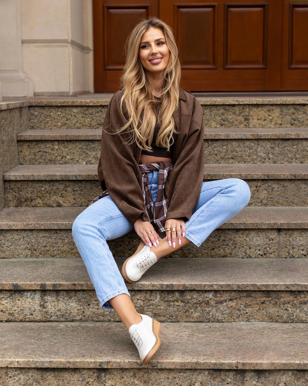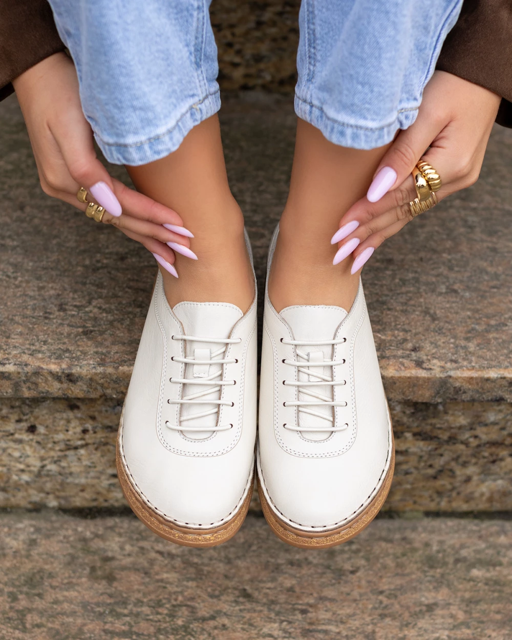 Jasnobeżowe półbuty damskie skórzane na koturnie