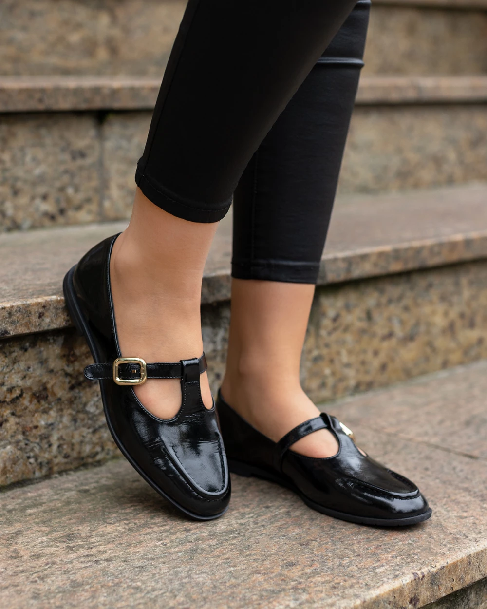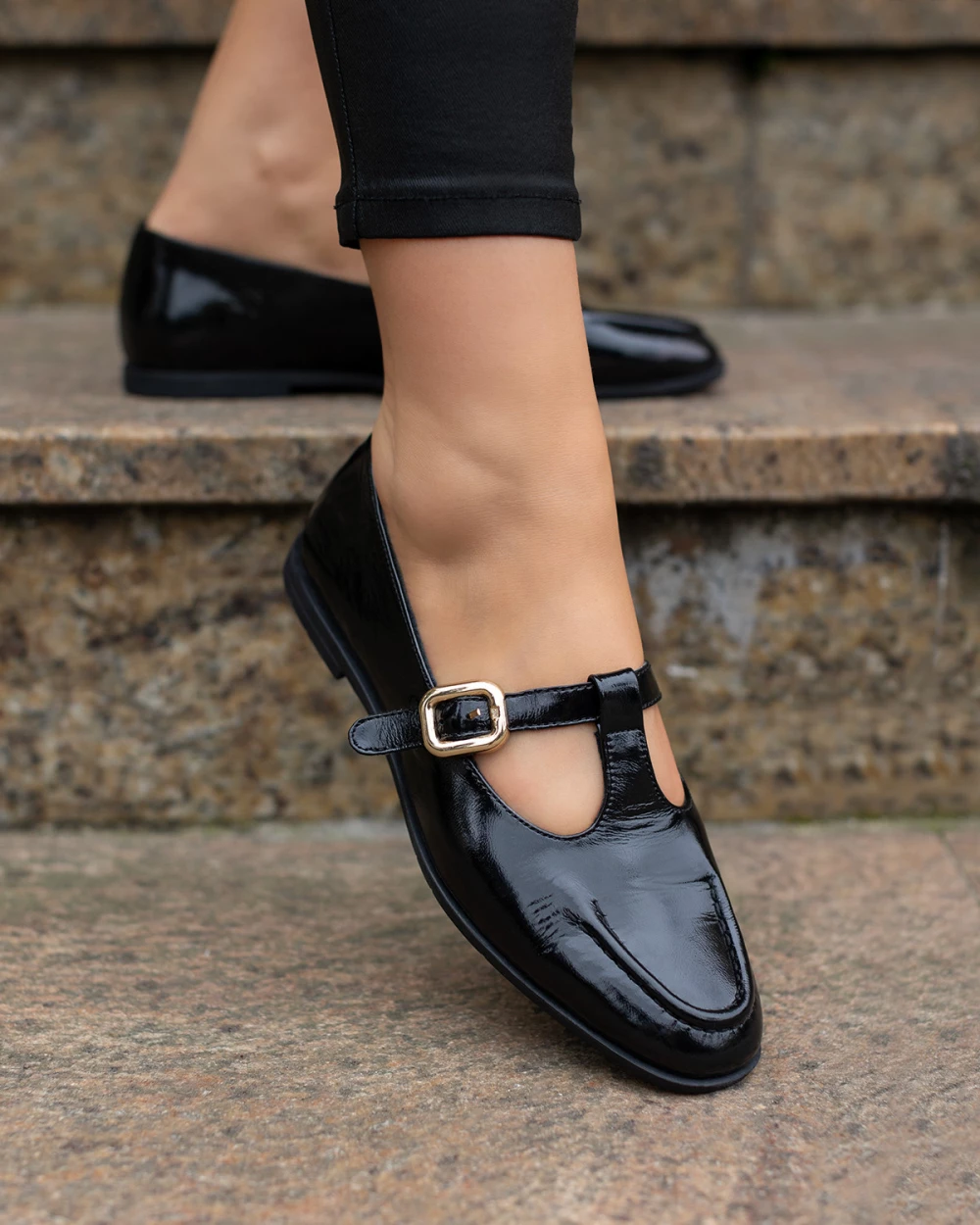 Czarne półbuty damskie ze skóry lakierowanej ze sprzączką