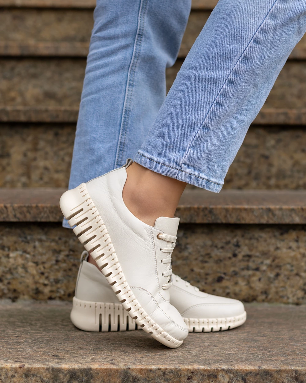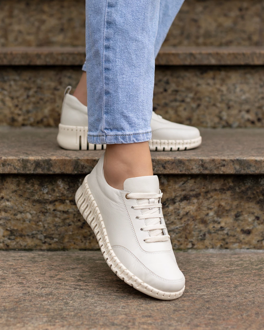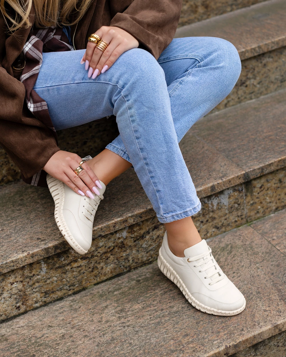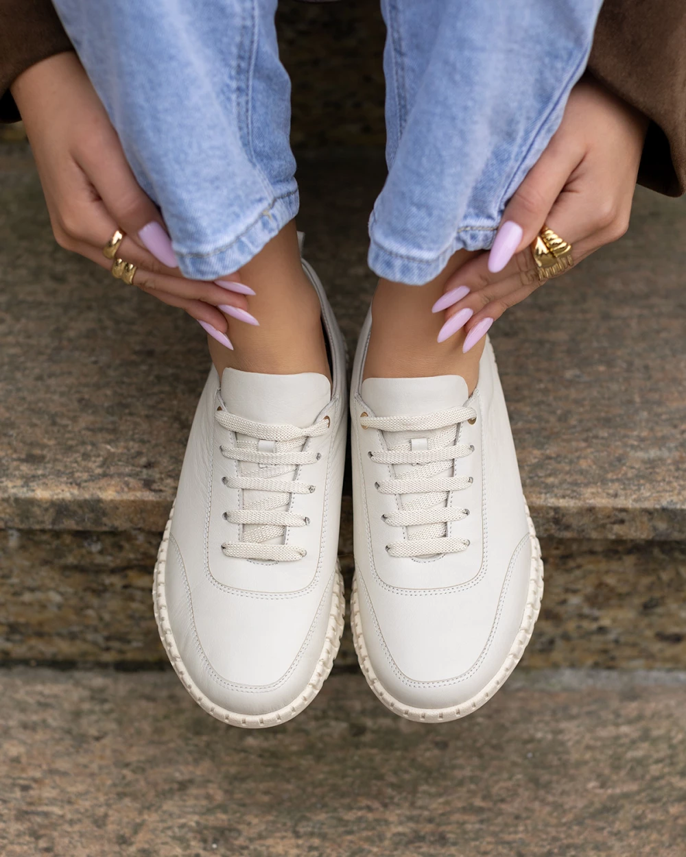Jasnobeżowe półbuty damskie ze skóry licowej na koturnie