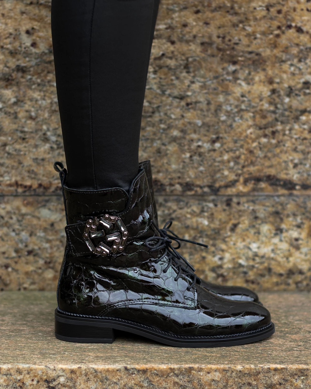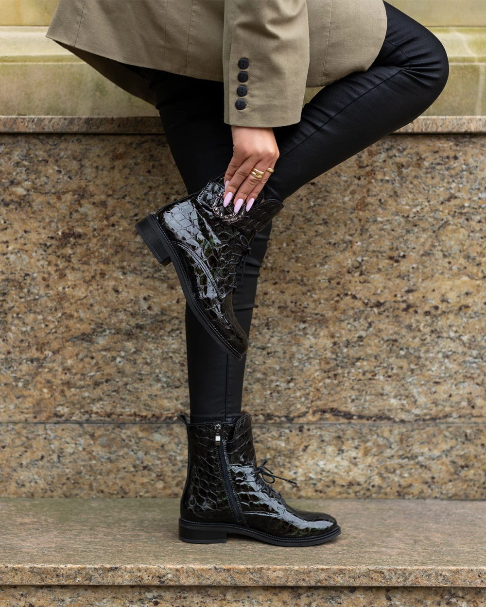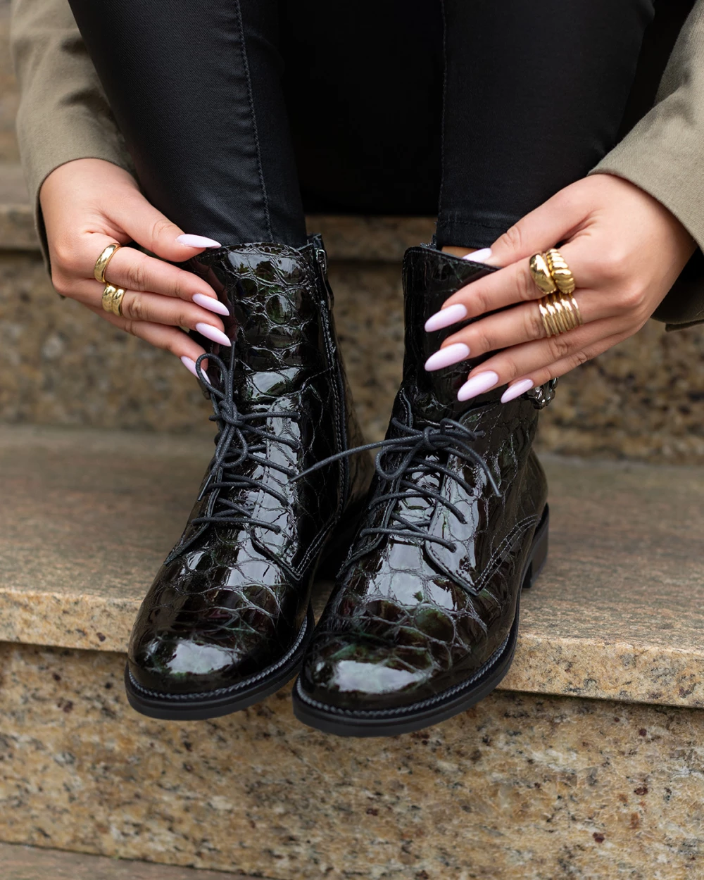 Ciemnozielone botki damskie sznurowane ze skóry lakierowanej