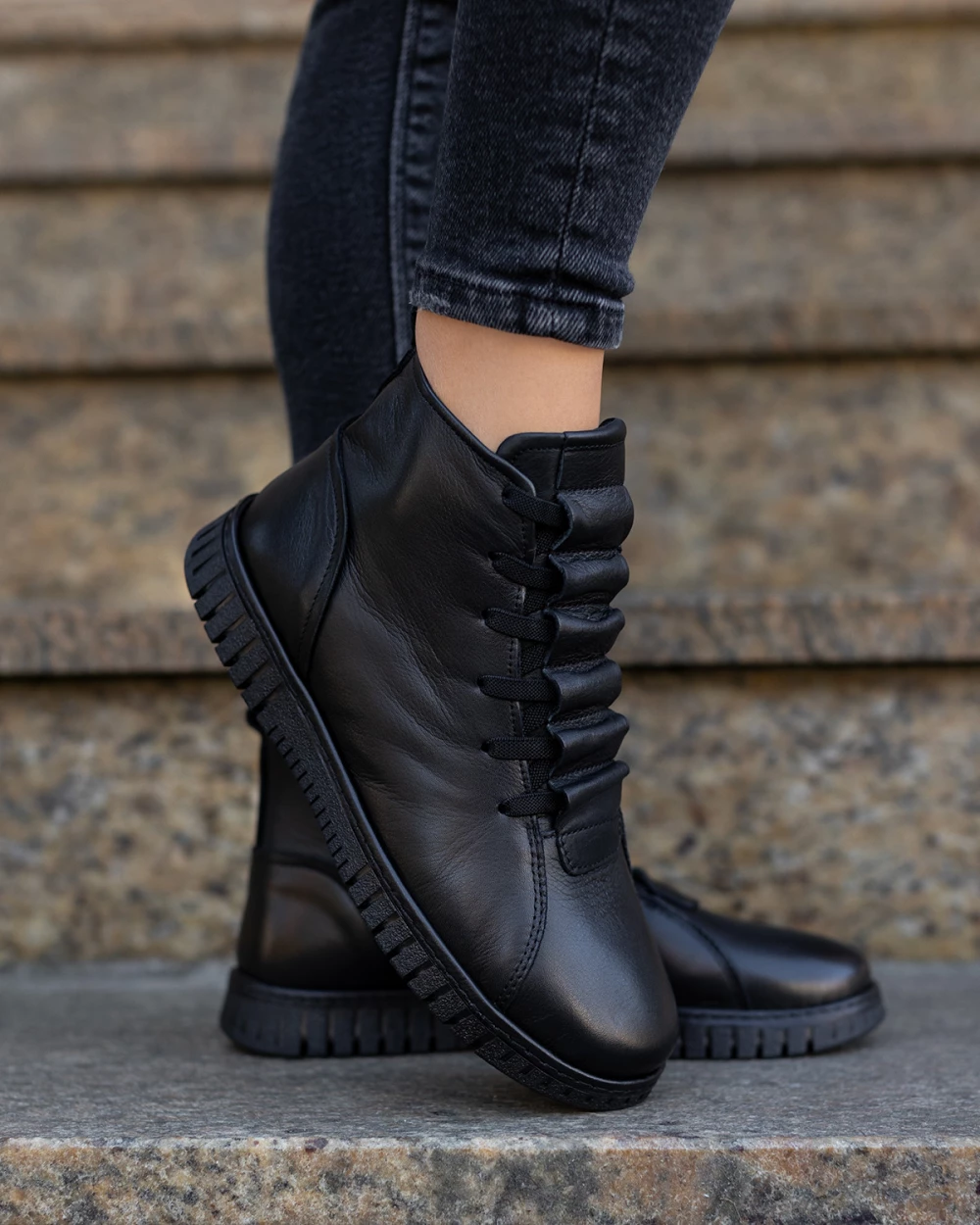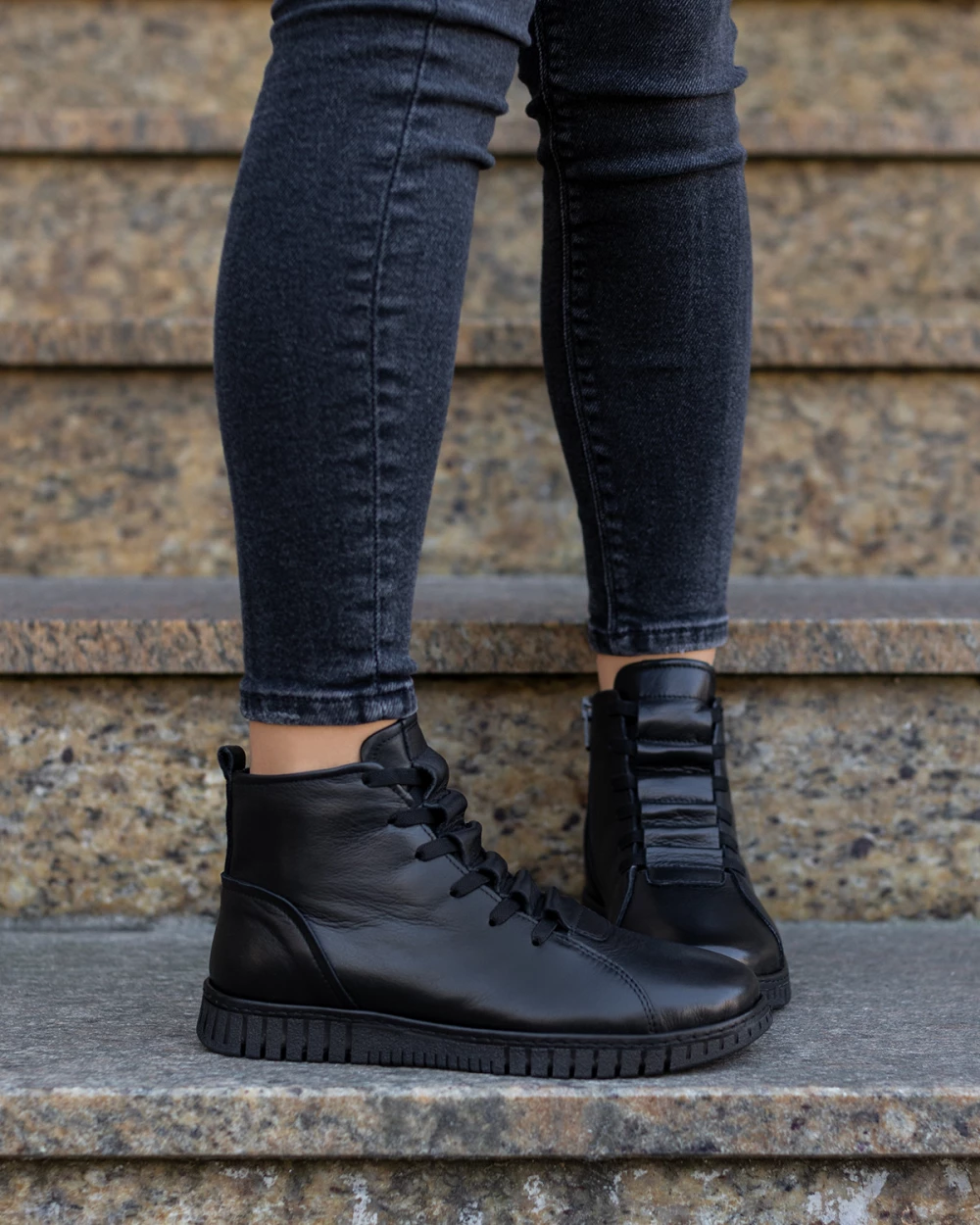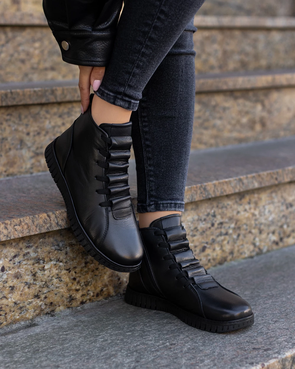 Czarne botki damskie sznurowane ze skóry licowej