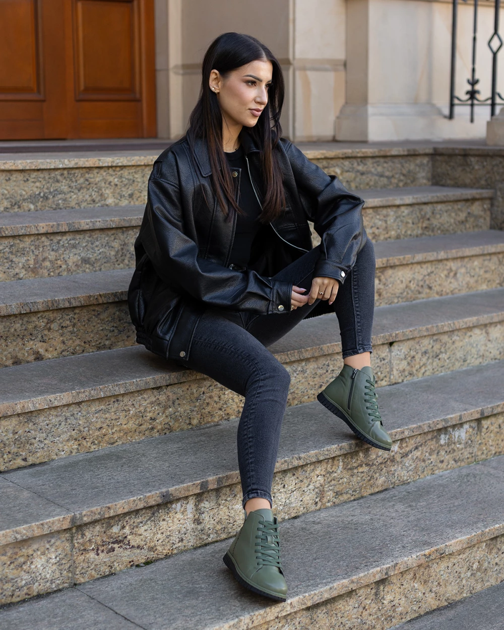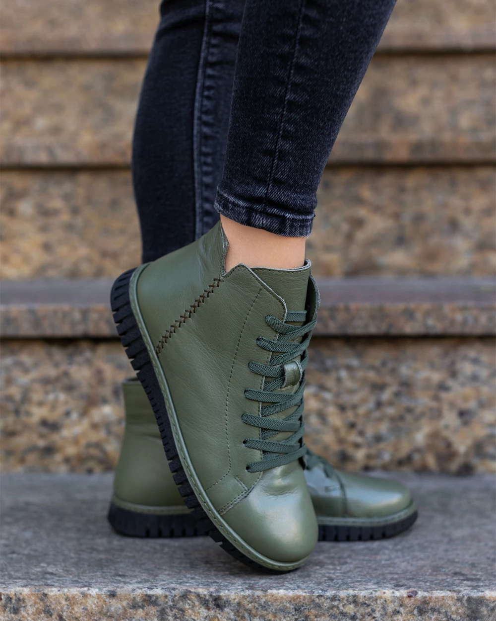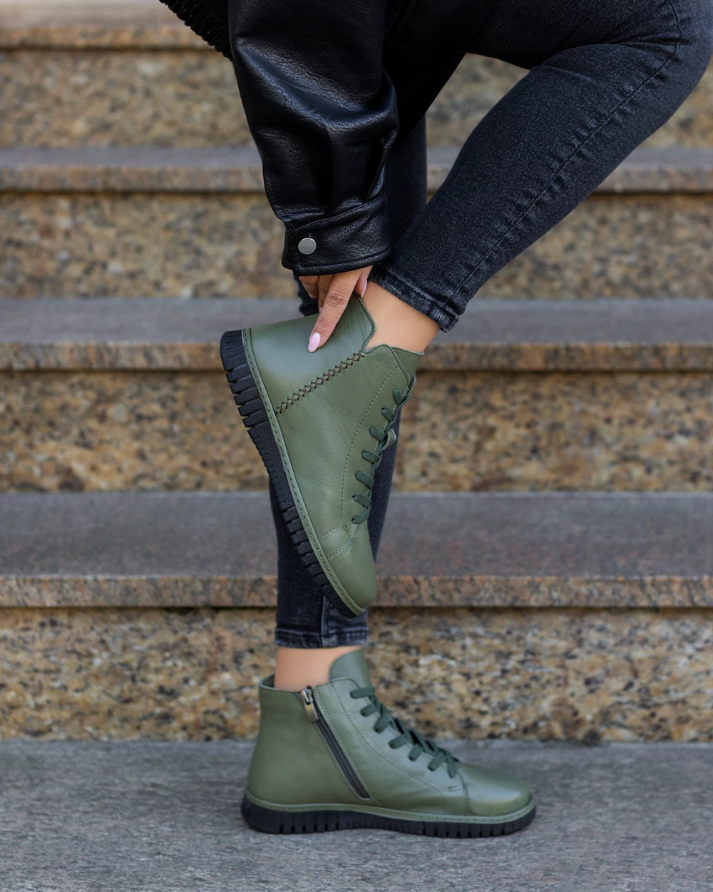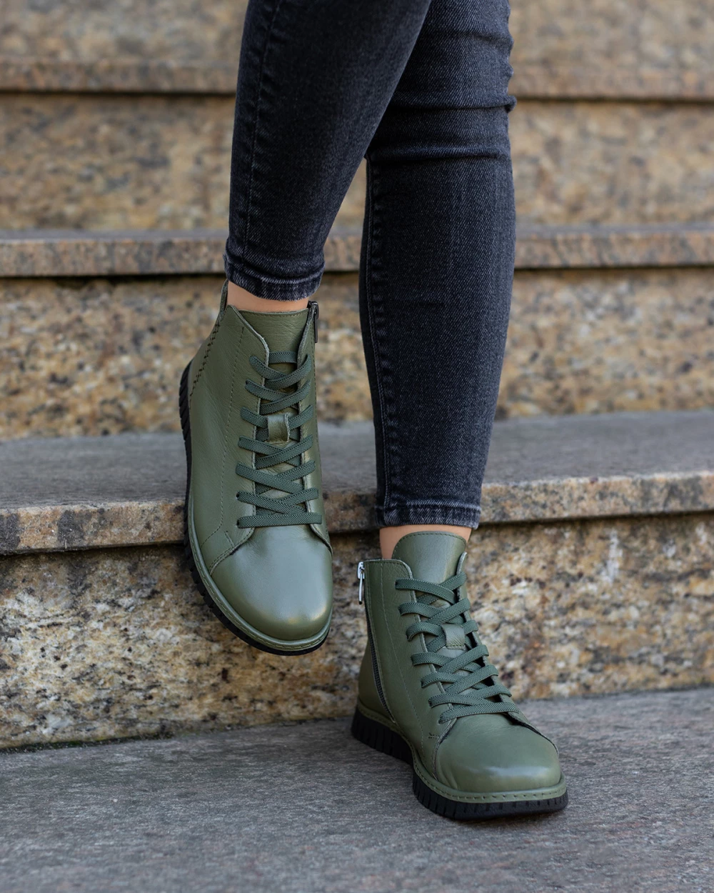Zielone botki damskie sznurowane z naturalnej skóry licowej