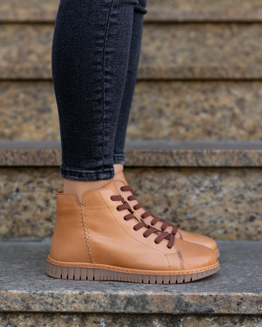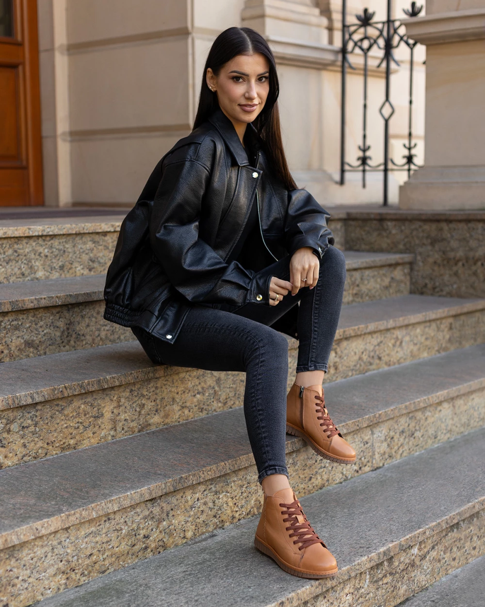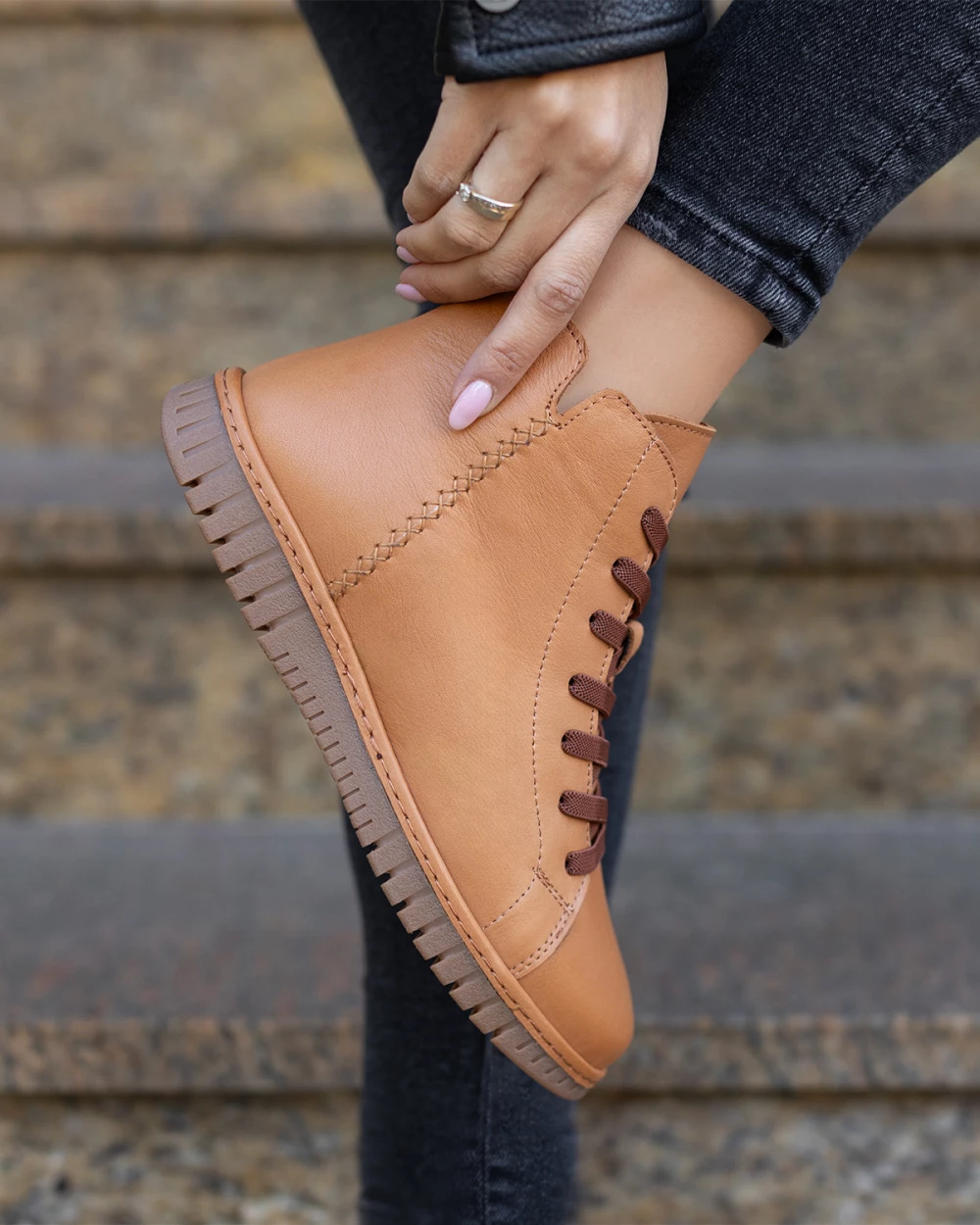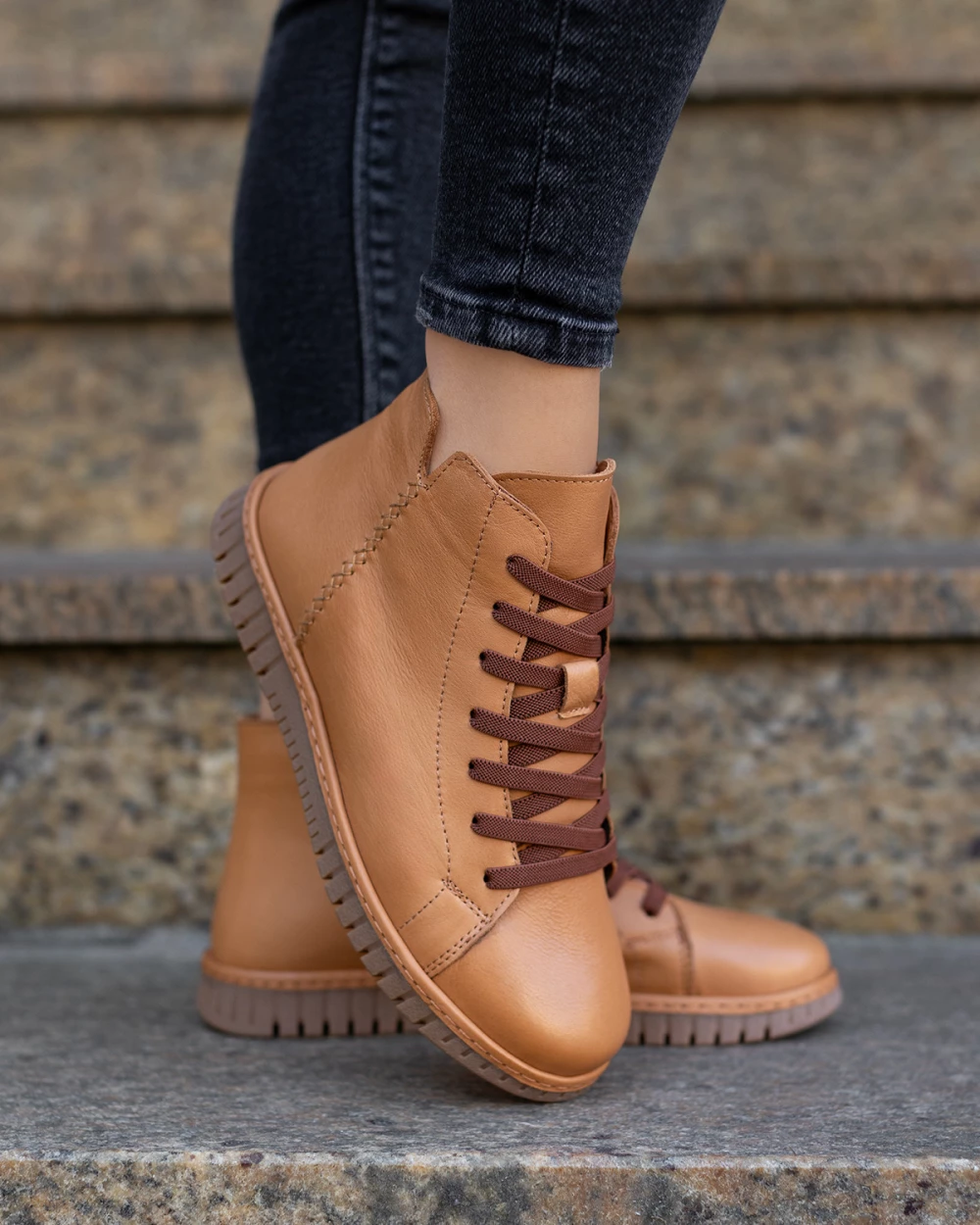 Brązowe trzewiki damskie skórzane na płaskim obcasie
