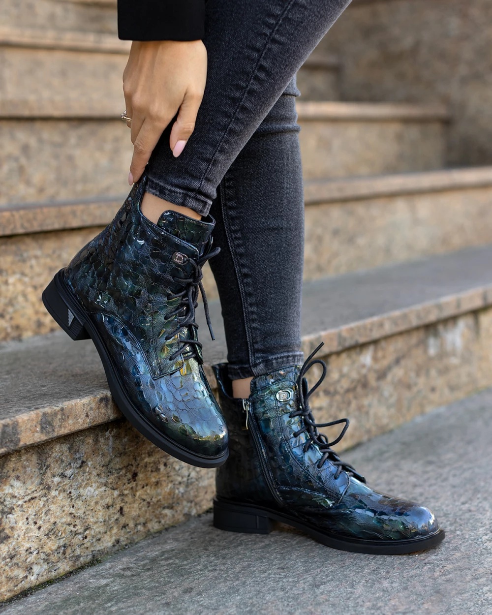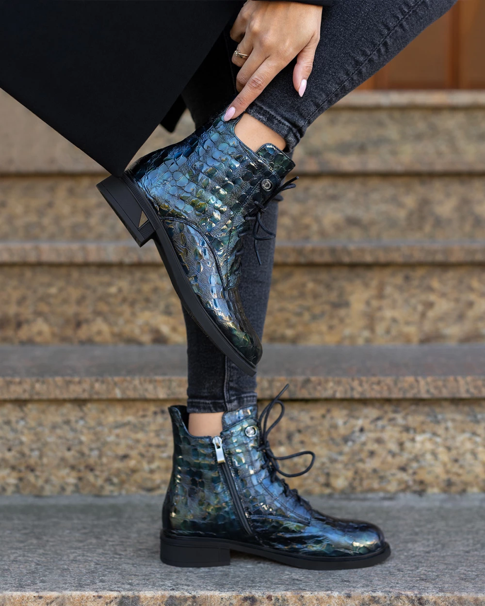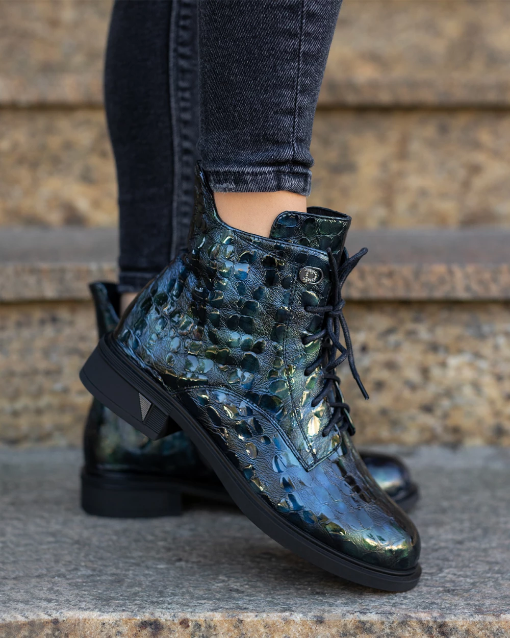 Ciemnozielone trzewiki damskie ze skóry lakierowanej z motywem