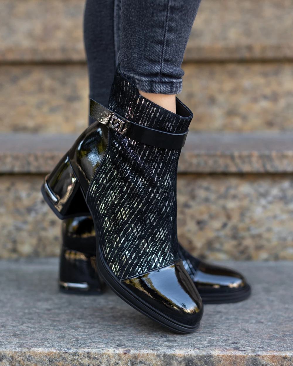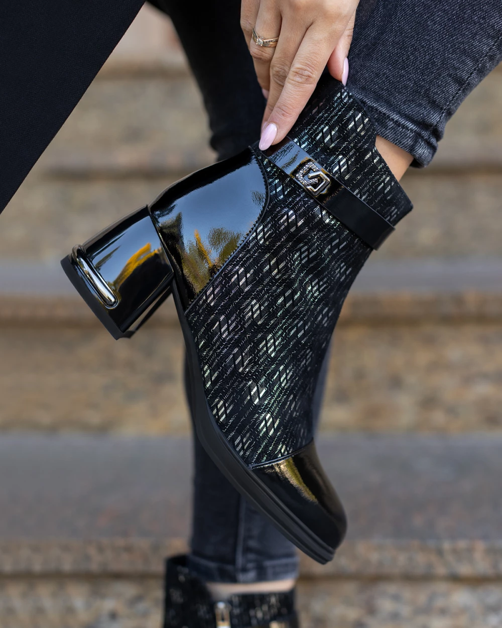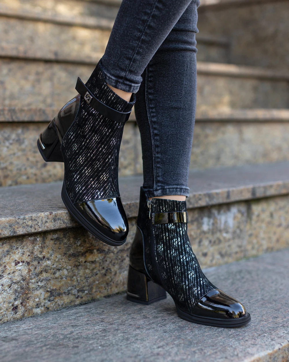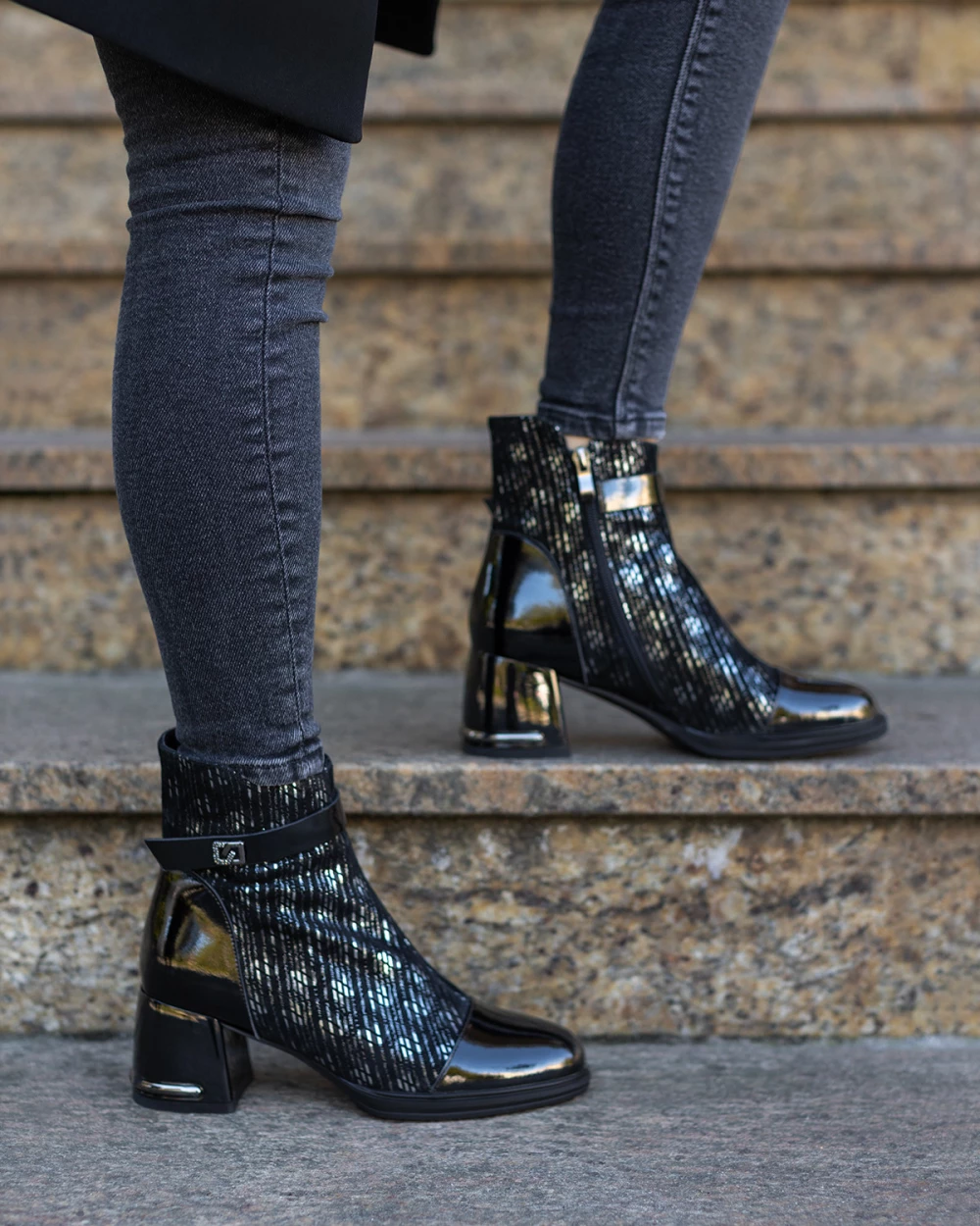 Czarne botki damskie ze skóry naturalnej na słupku z motywem