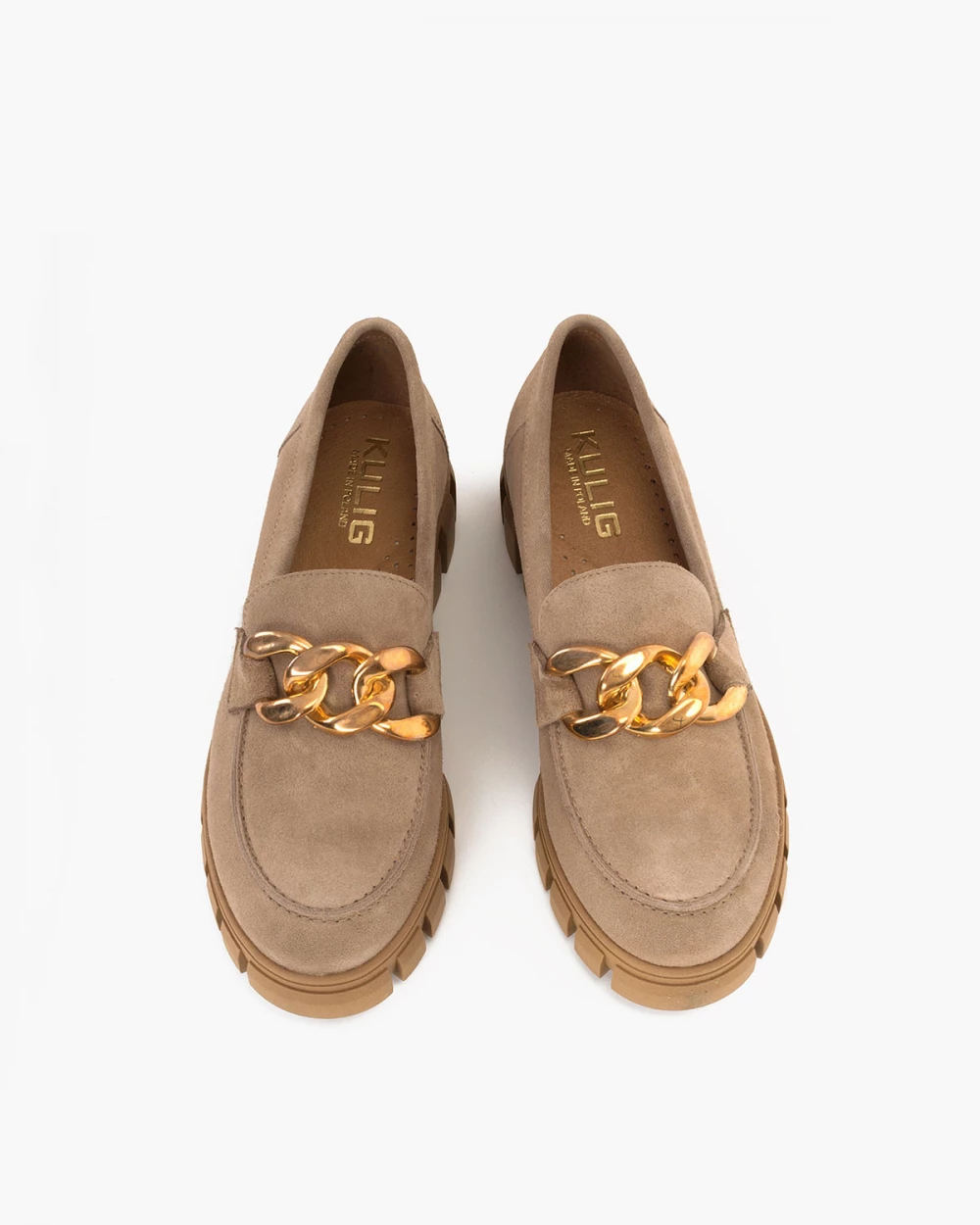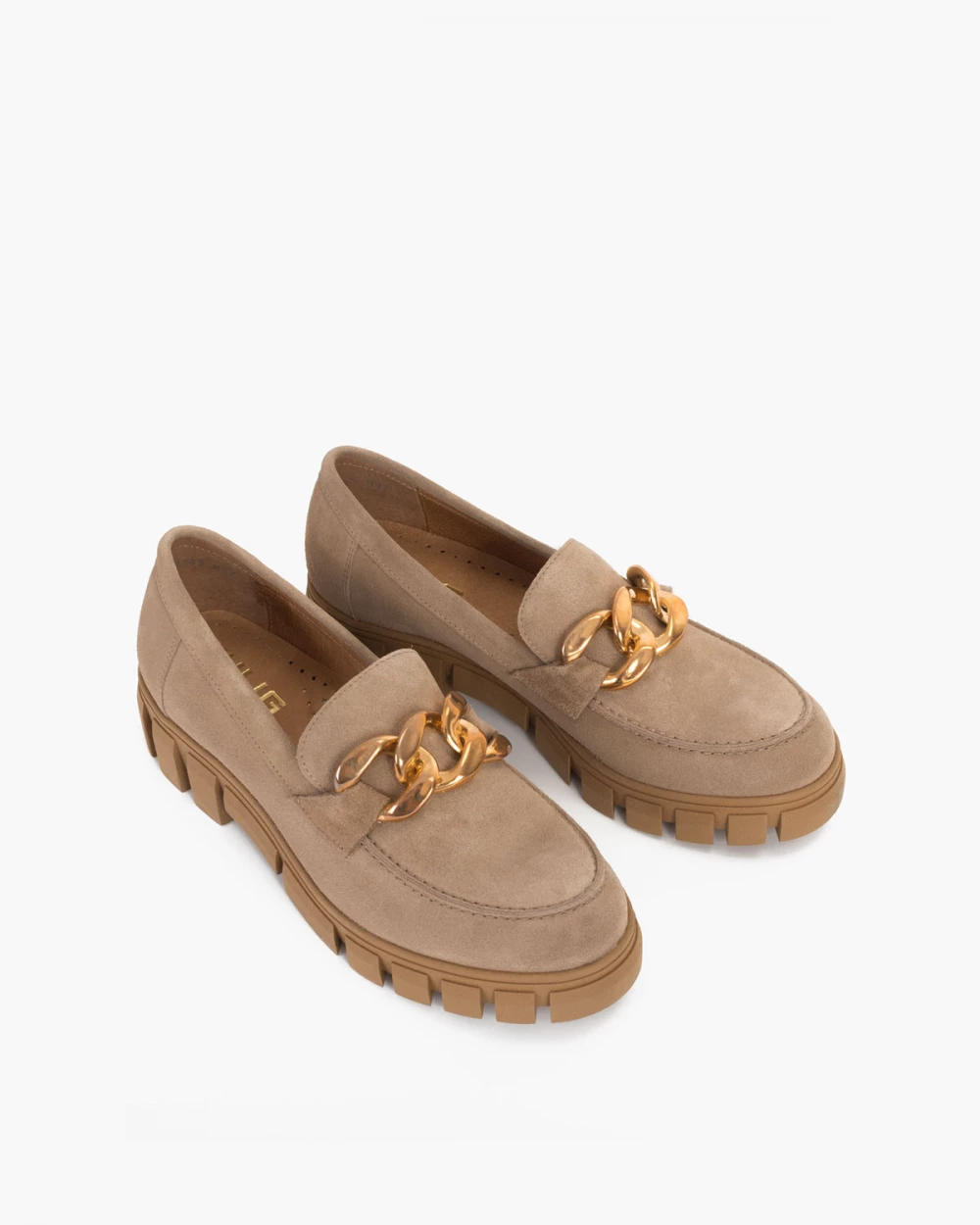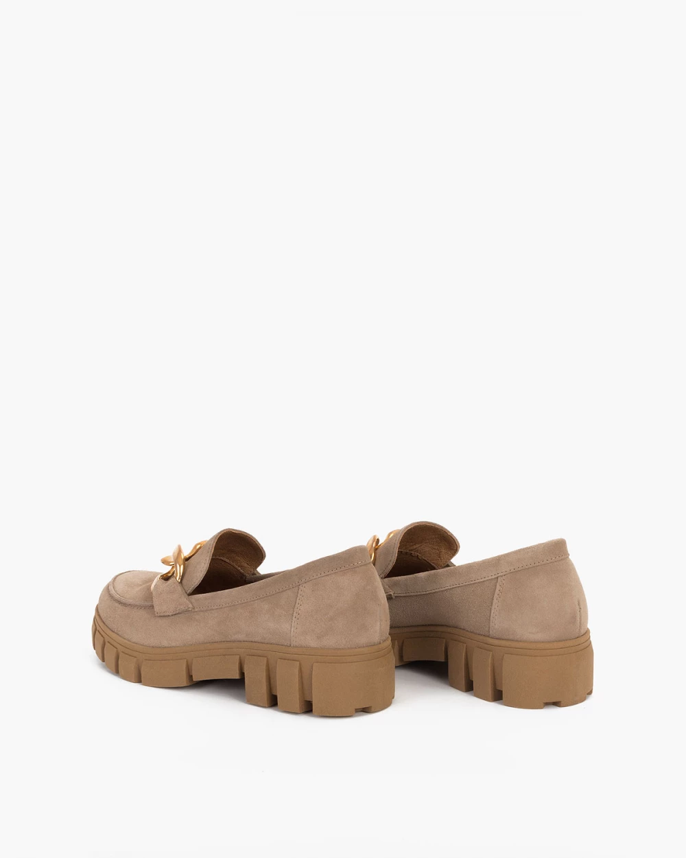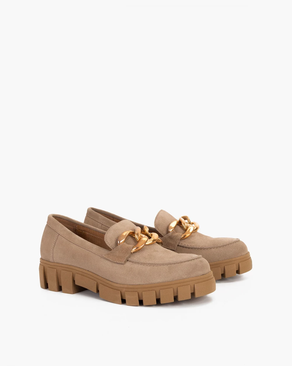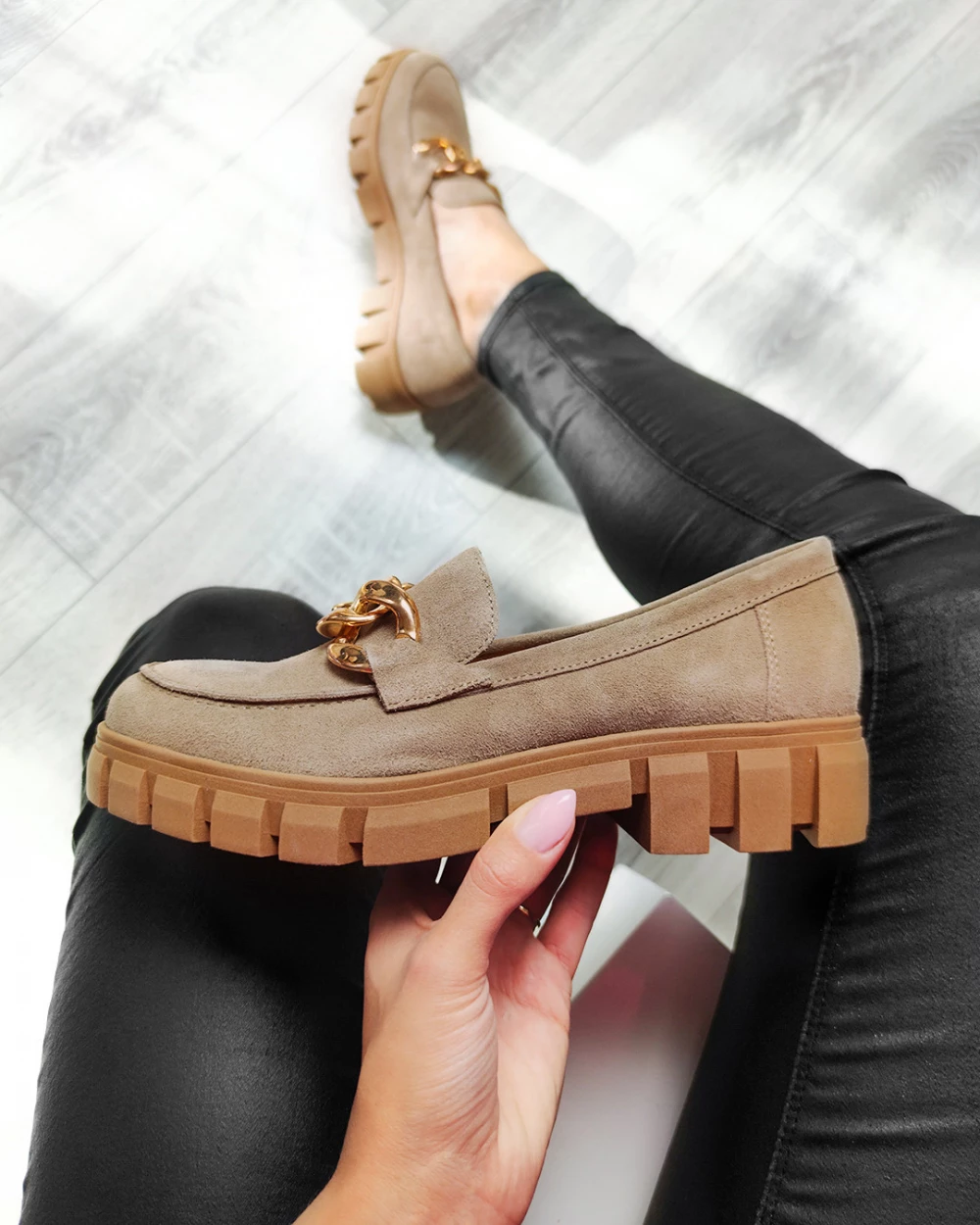Beżowe mokasyny damskie welurowe z łańcuchem