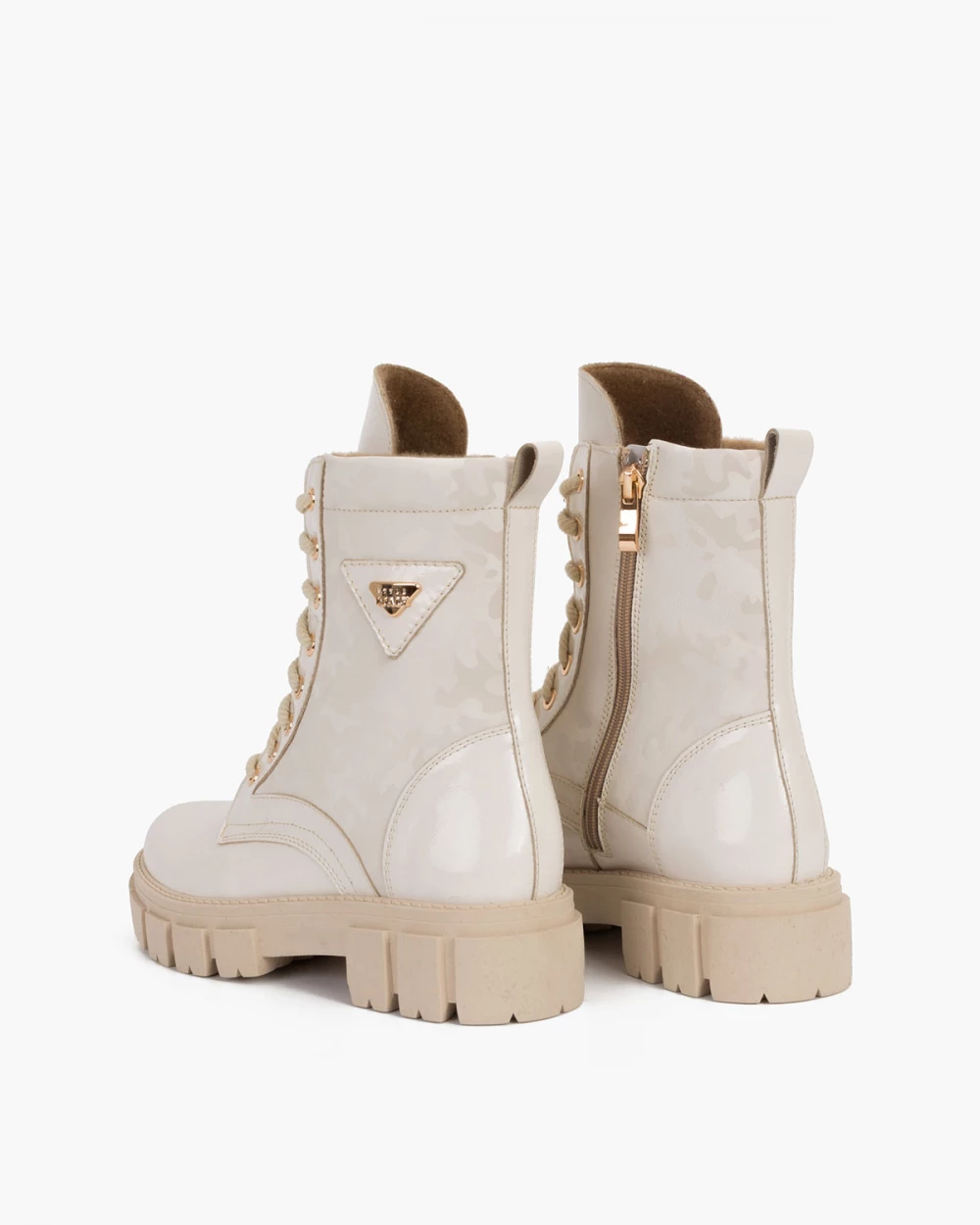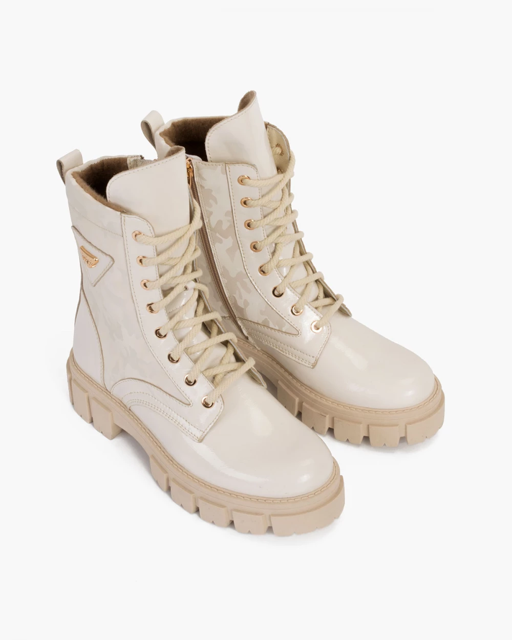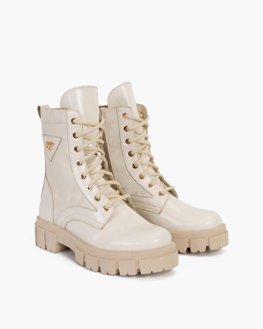 Jasnobeżowe trzewiki damskie lakierowane z motywem moro