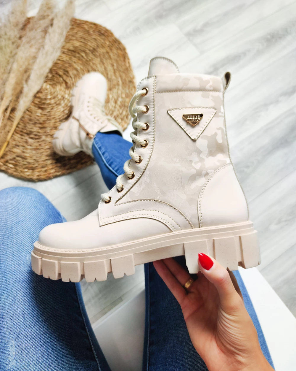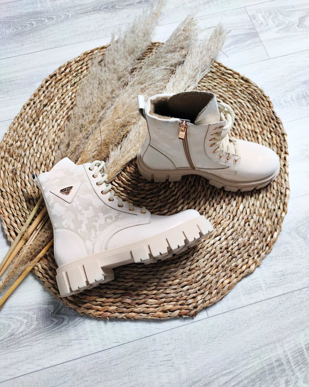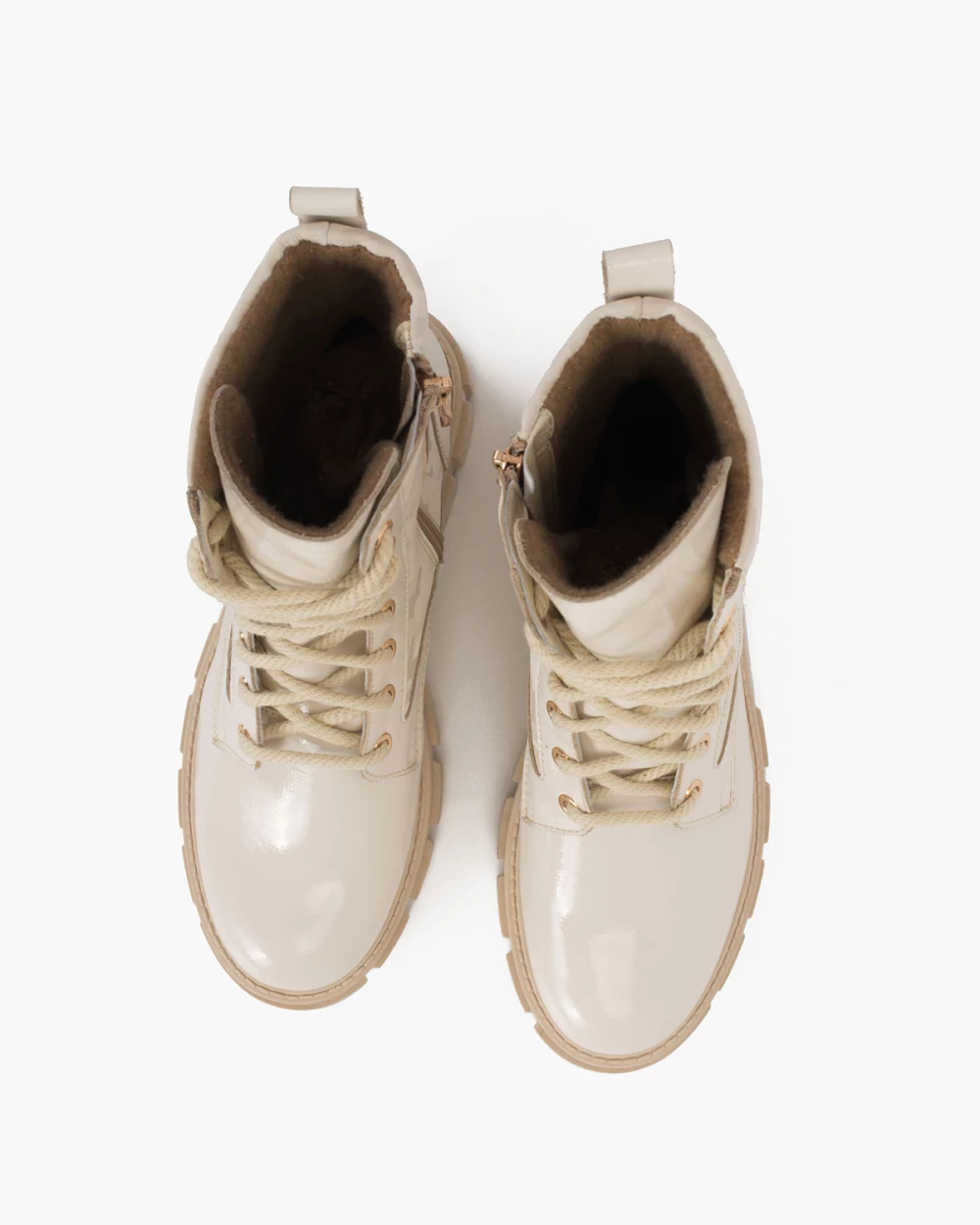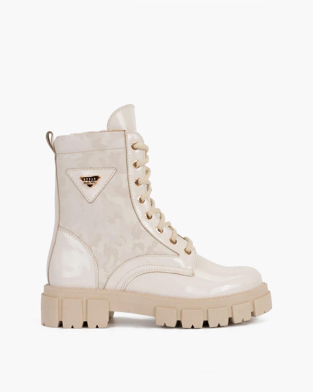 Jasnobeżowe trzewiki damskie lakierowane z motywem moro