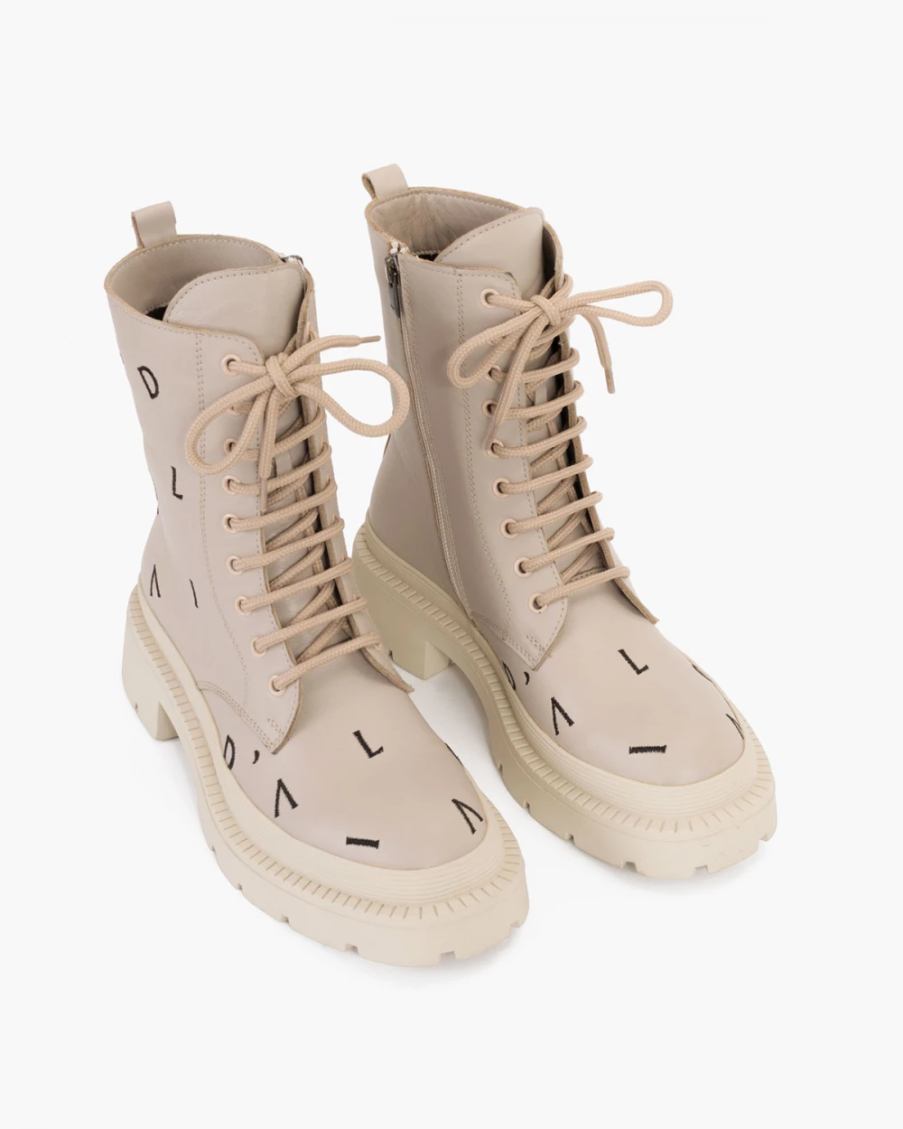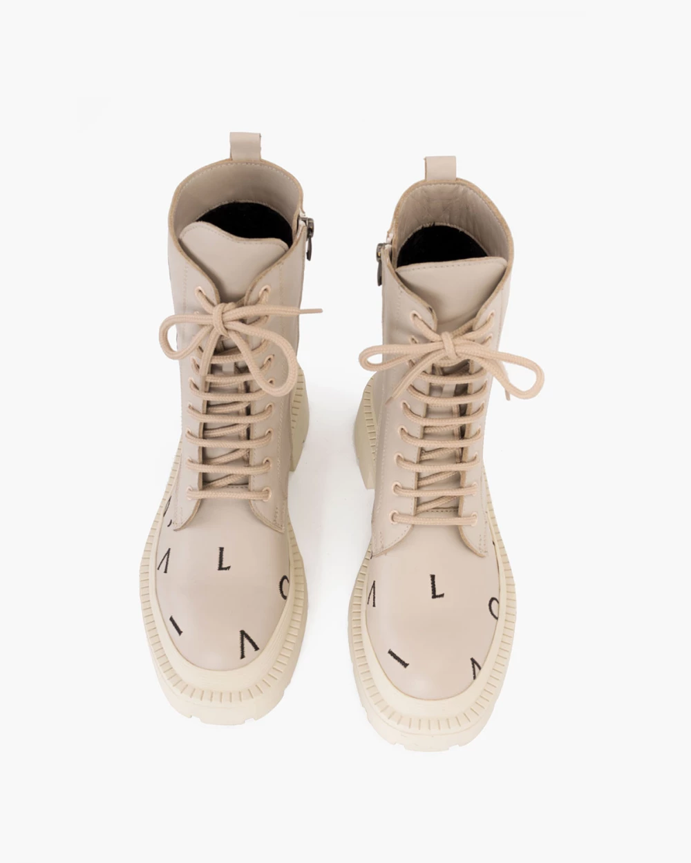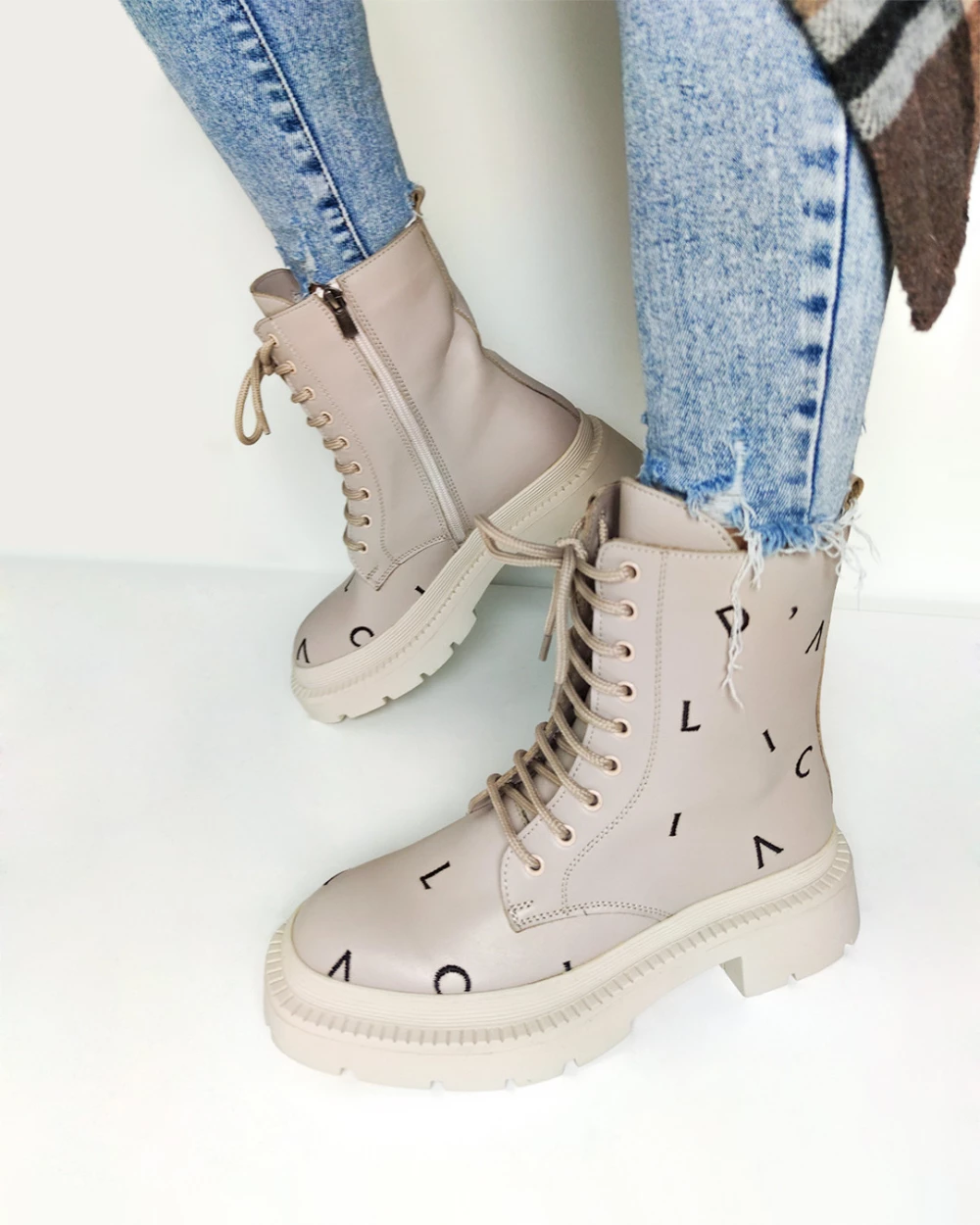 Beżowe trzewiki damskie skórzane z literkami