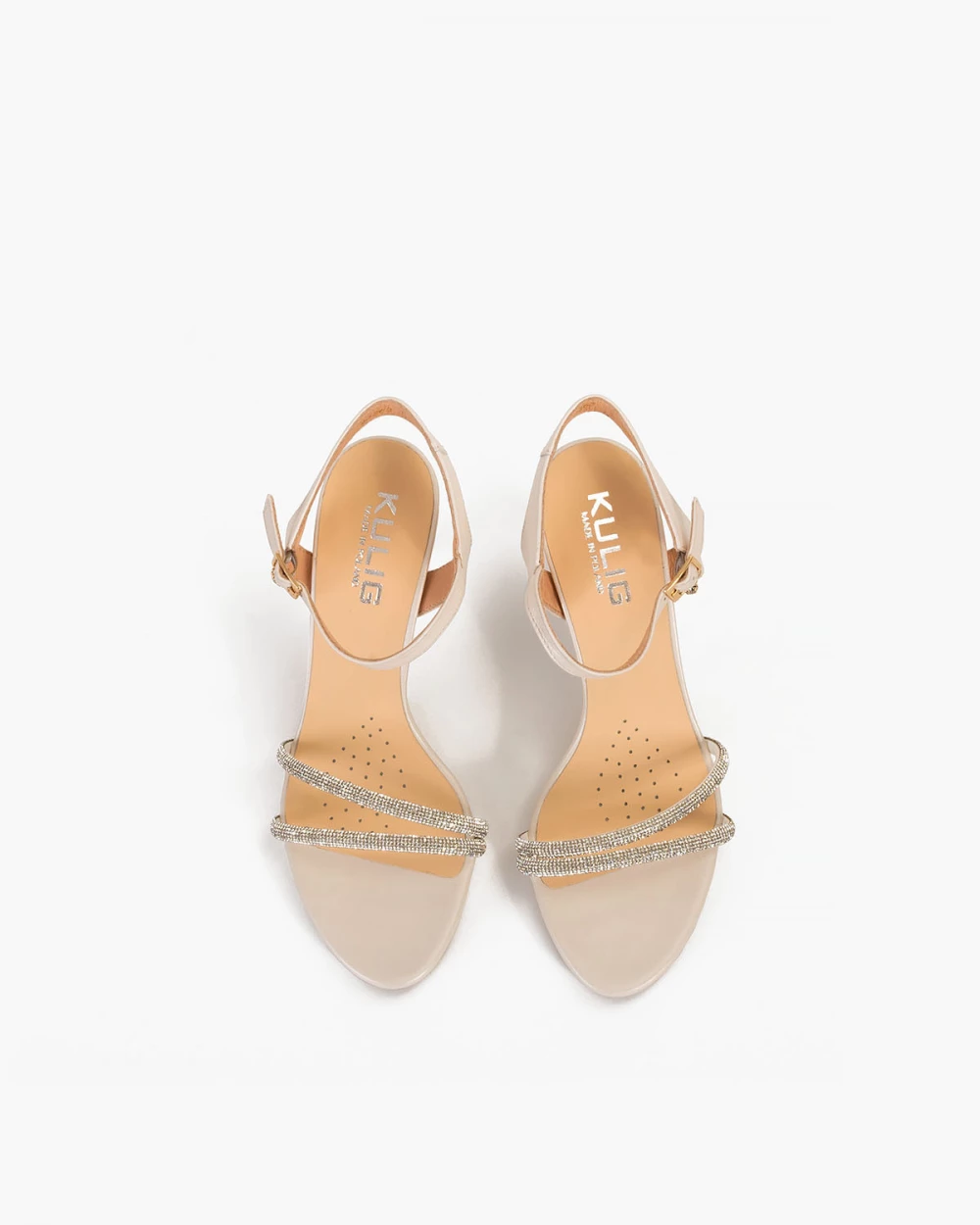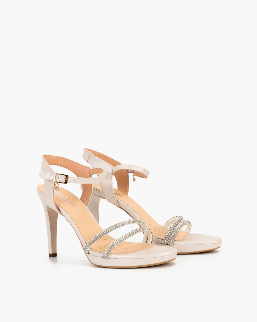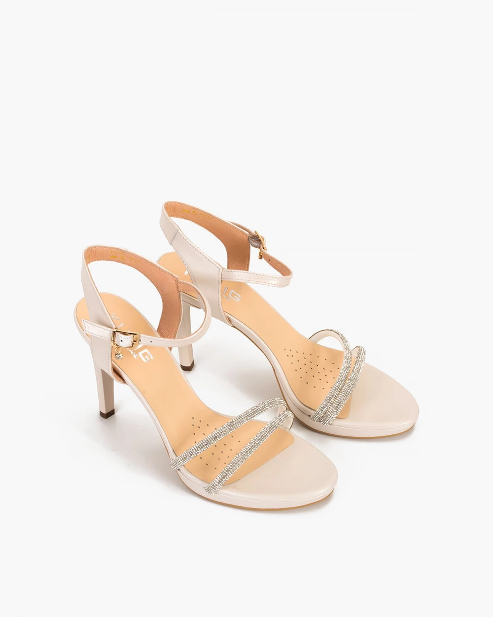 Perłowe sandały damskie skórzane z cyrkoniami na szpilce