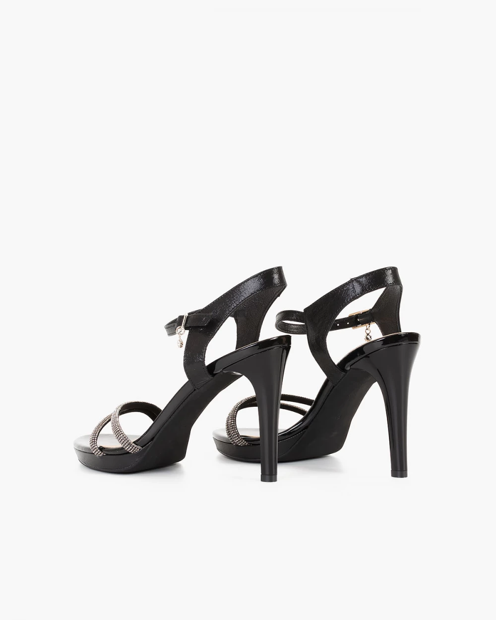Czarne sandały damskie skórzane z cyrkoniami na szpilce