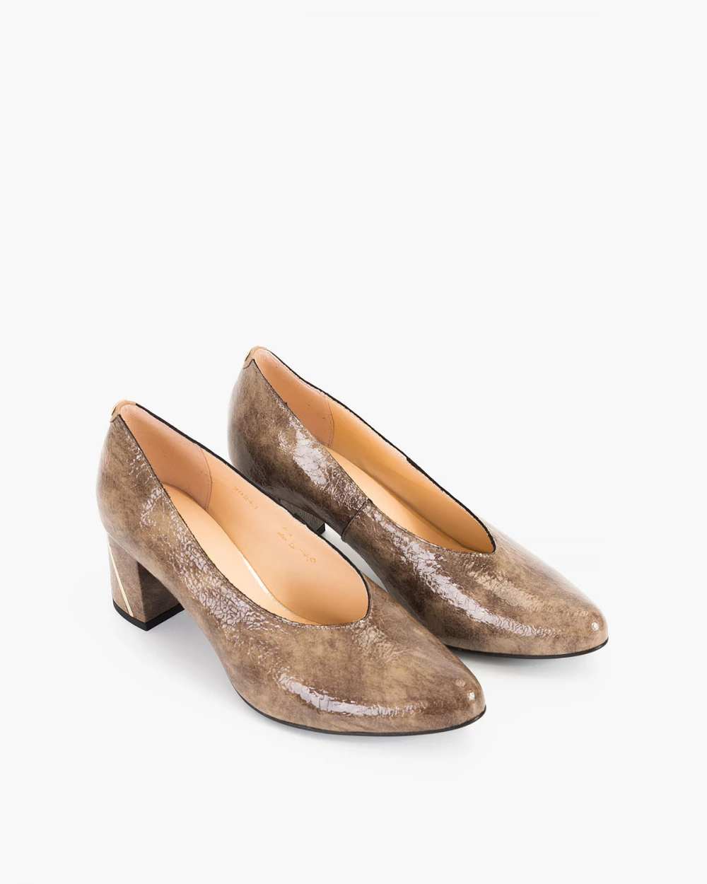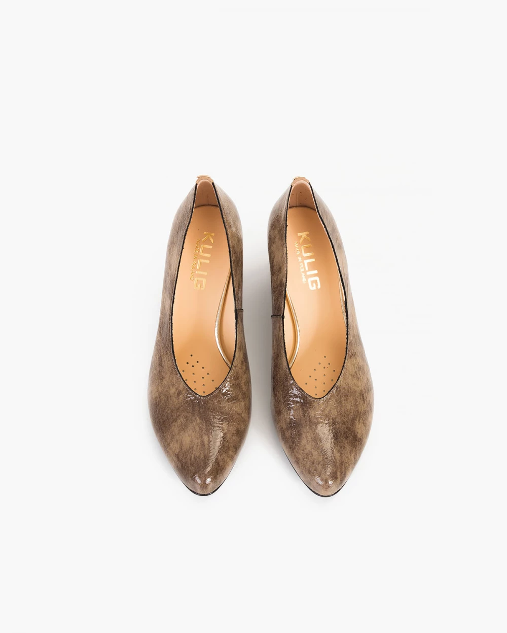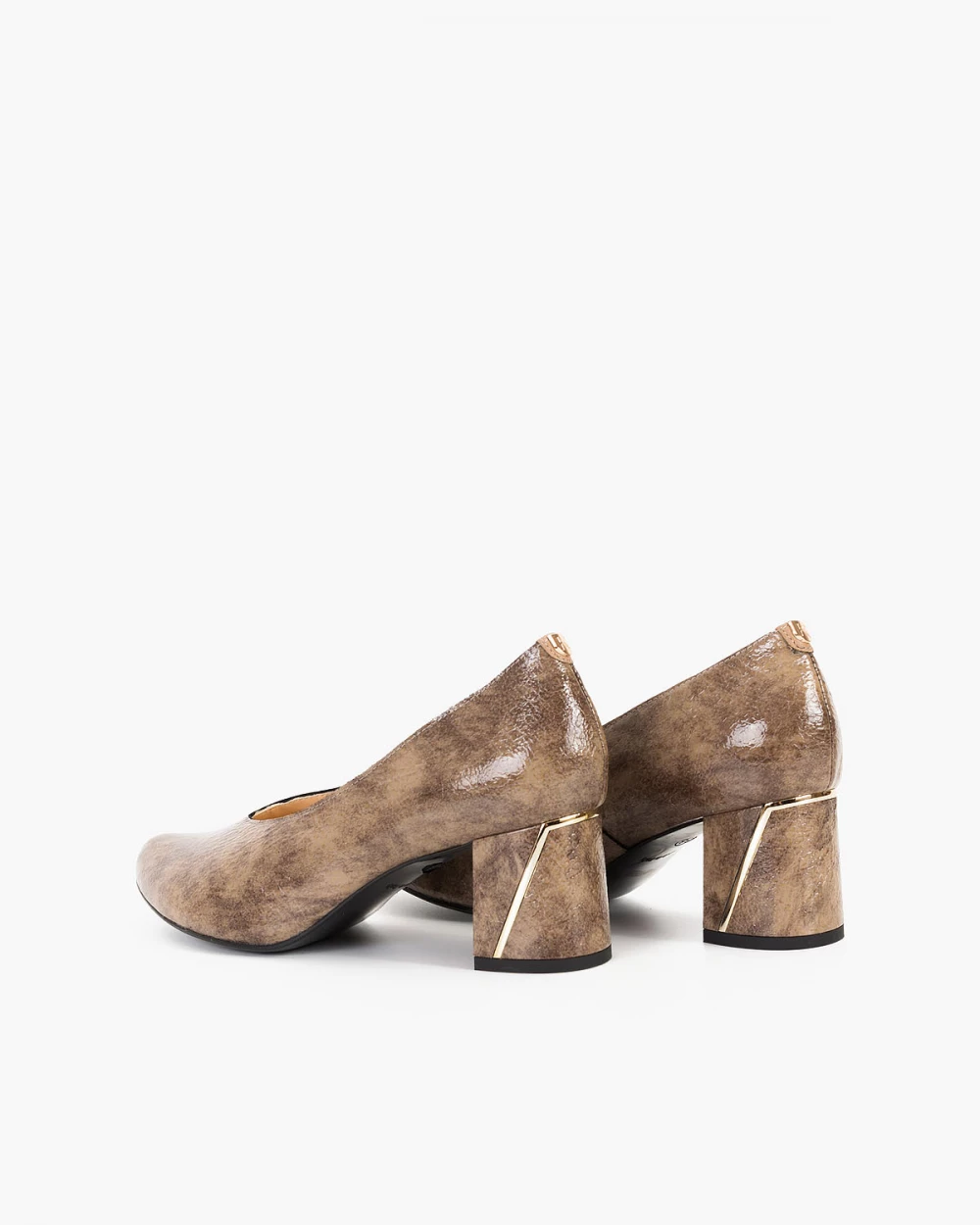Brązowe czółenka lakierowane z motywem na słupku