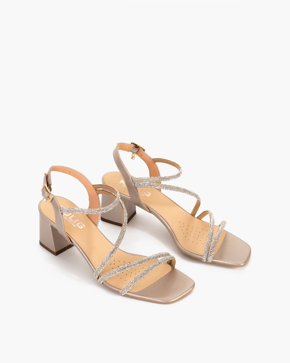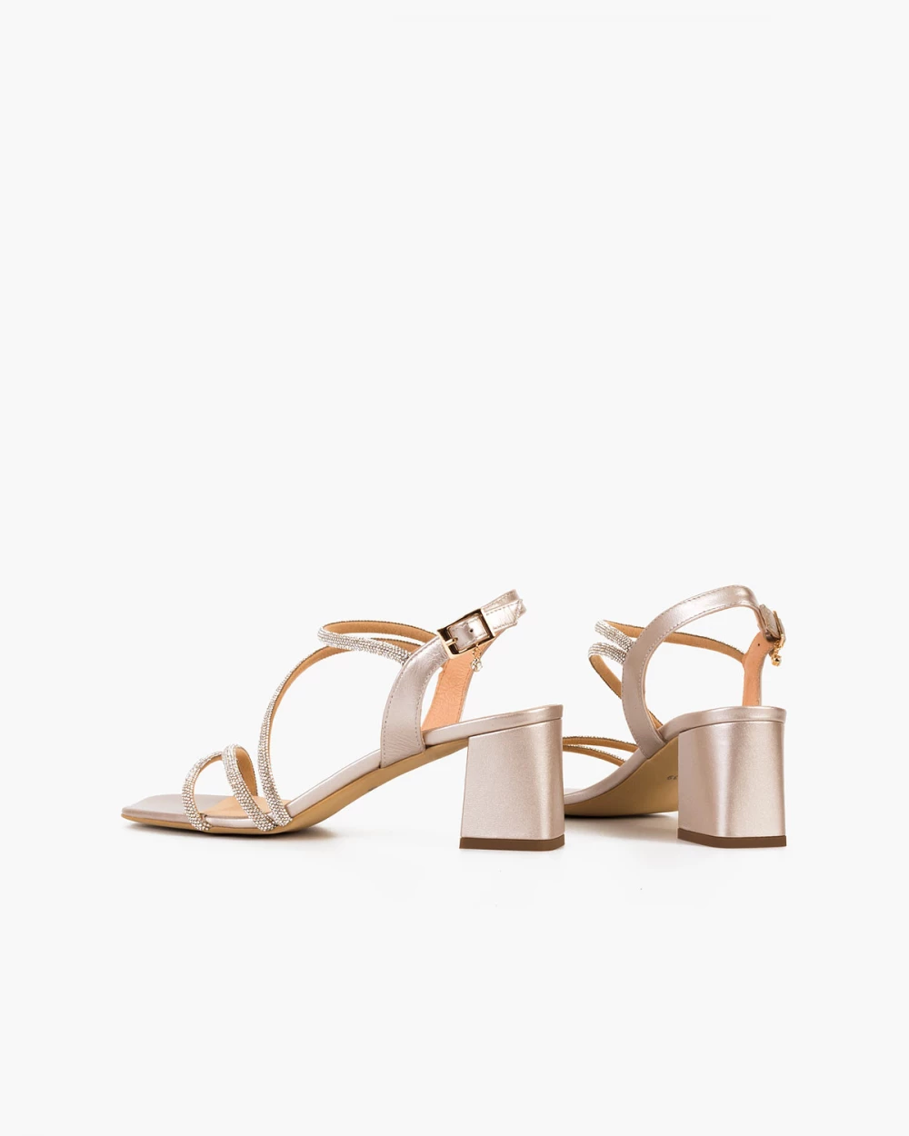 Złote sandały damskie skórzane z cyrkoniami na klocku