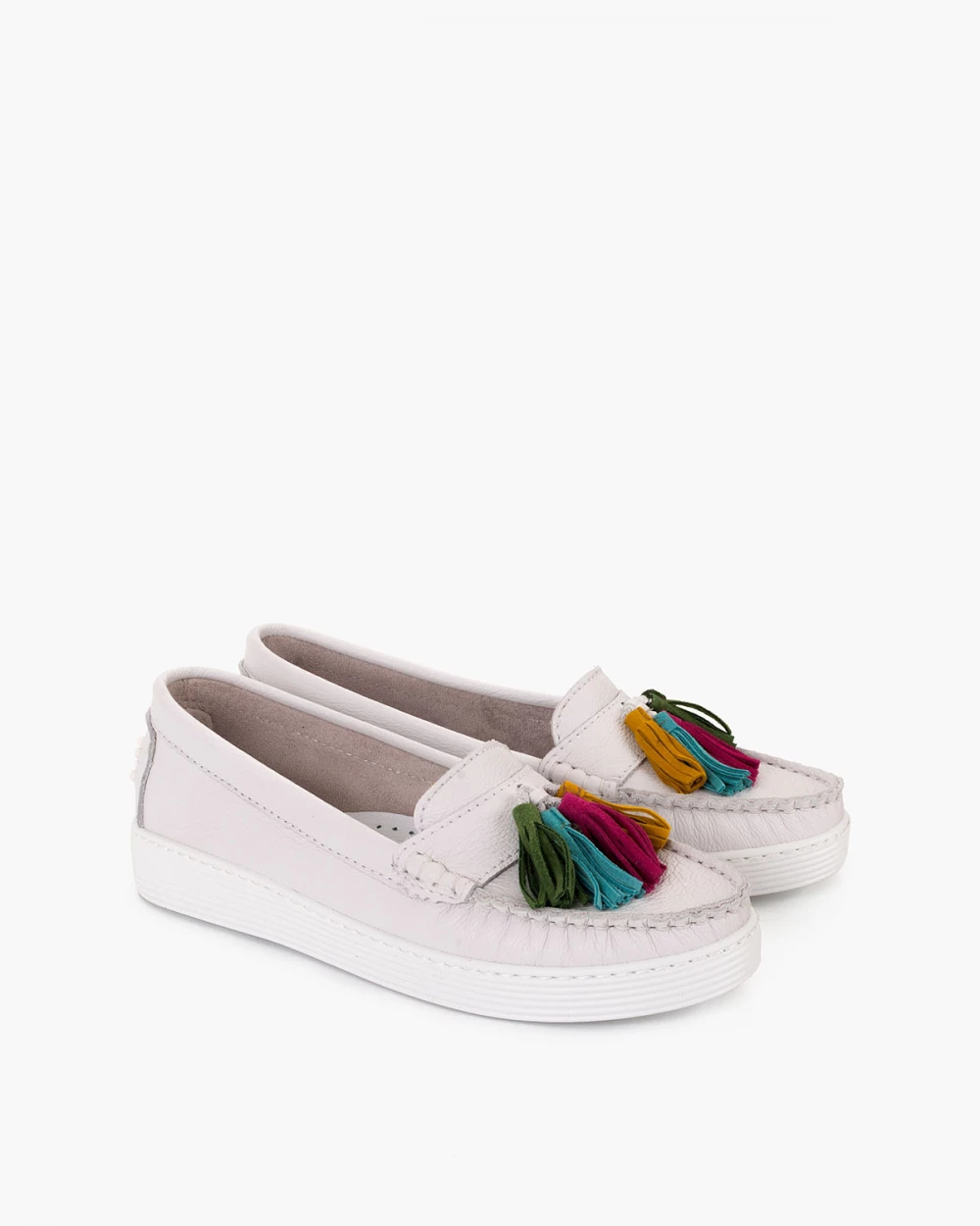 Białe mokasyny damskie skórzane z kolorowymi frędzlami