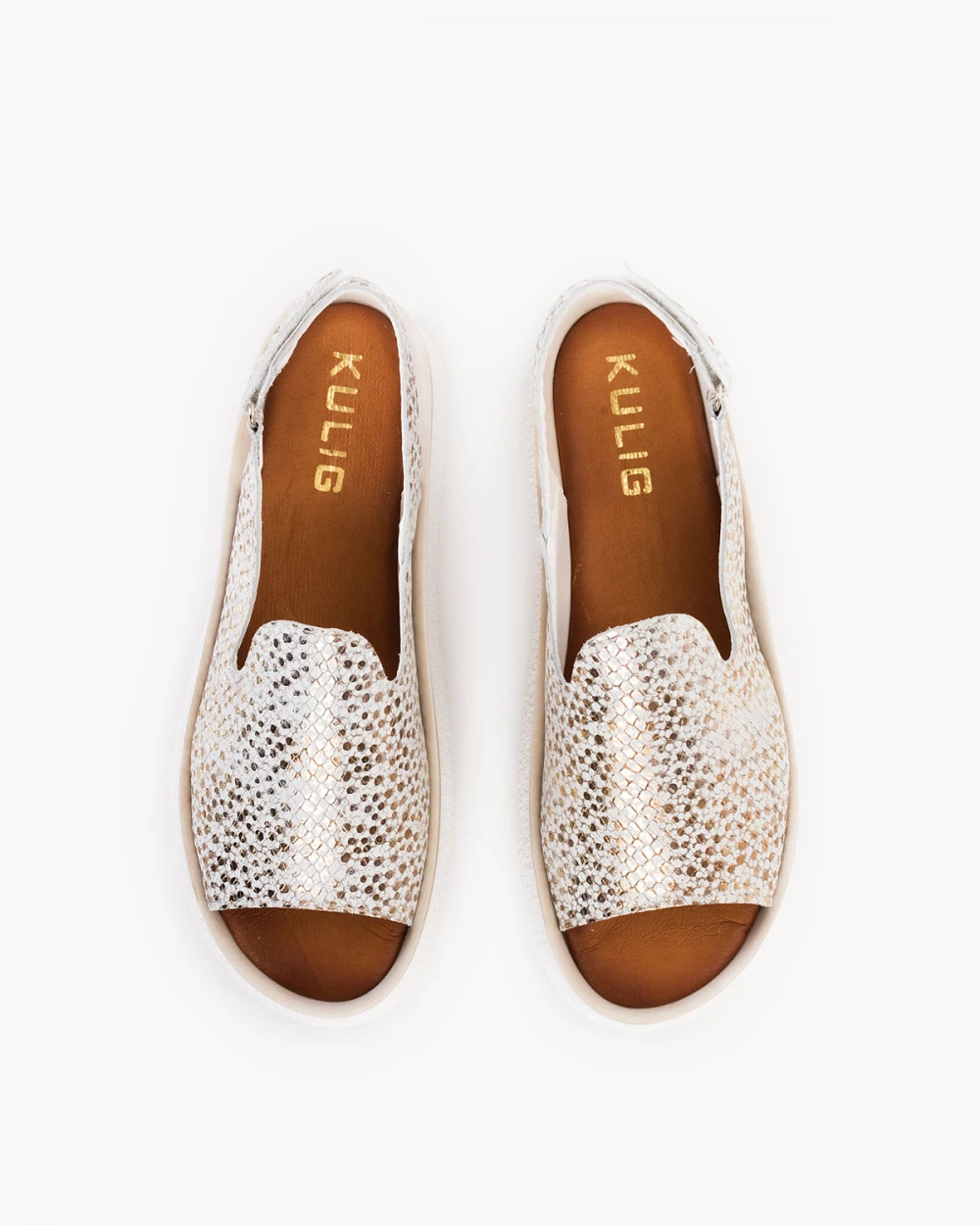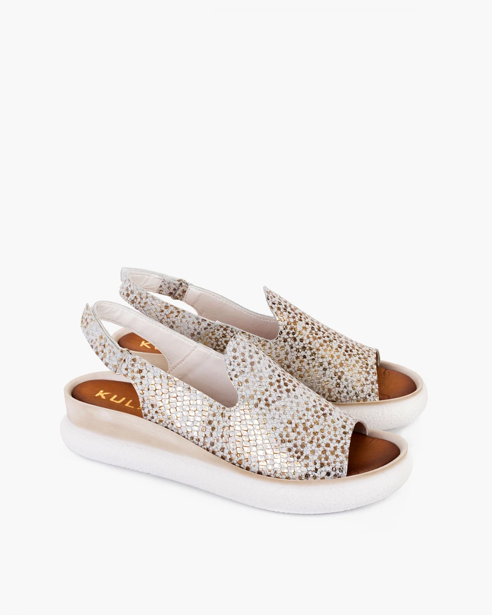 Biało-złote sandały damskie skórzane na koturnie