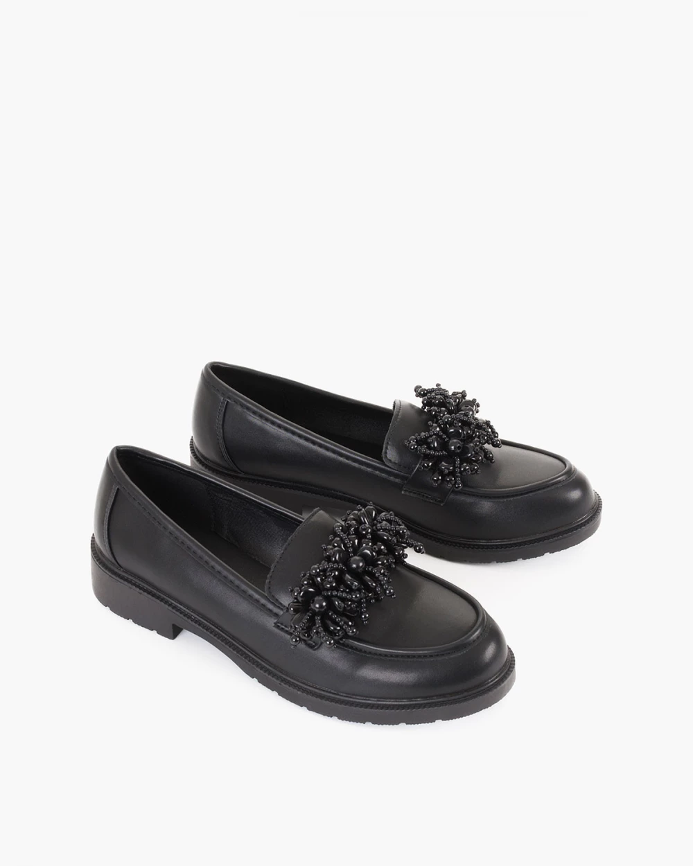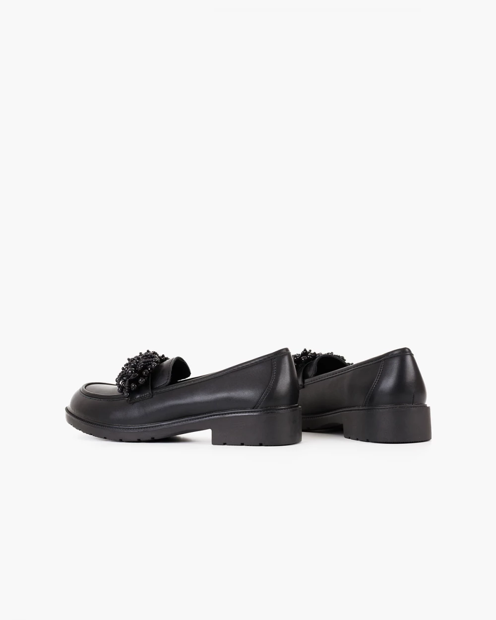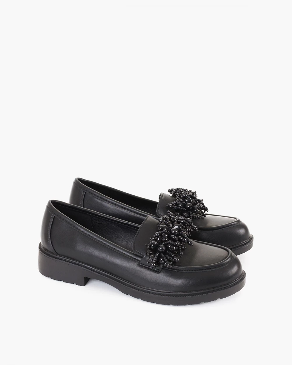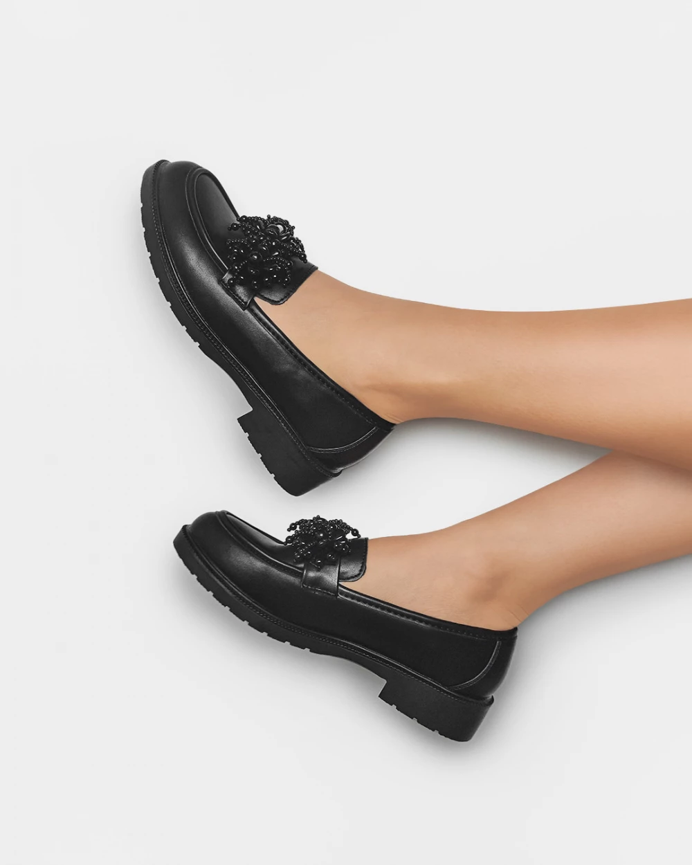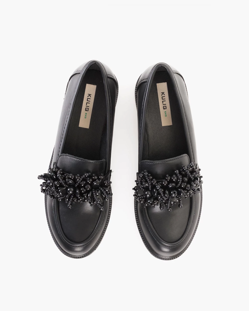 Czarne mokasyny damskie ze skóry ekologicznej z koralikami