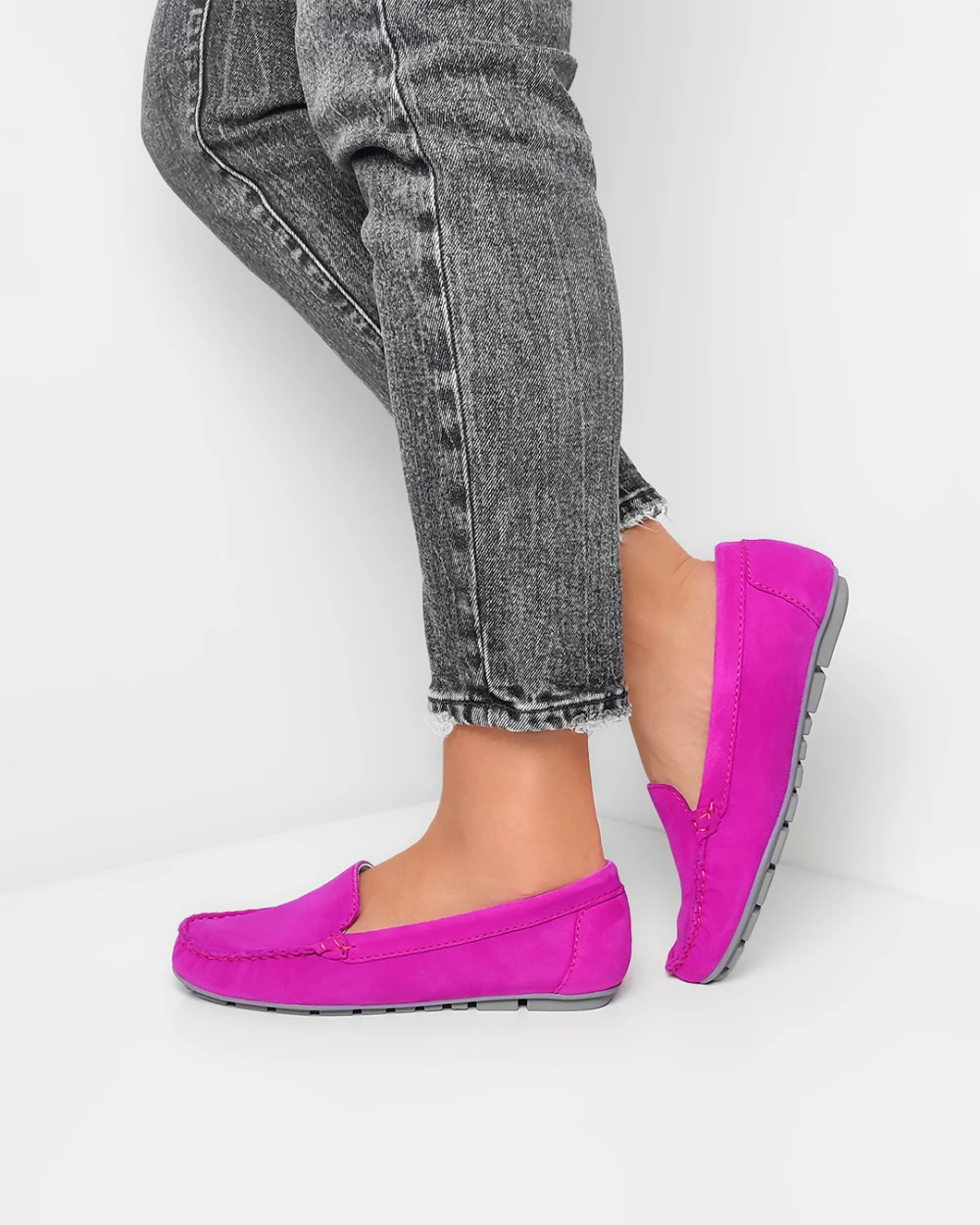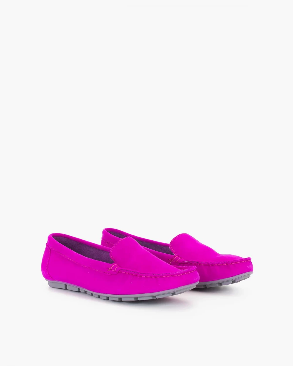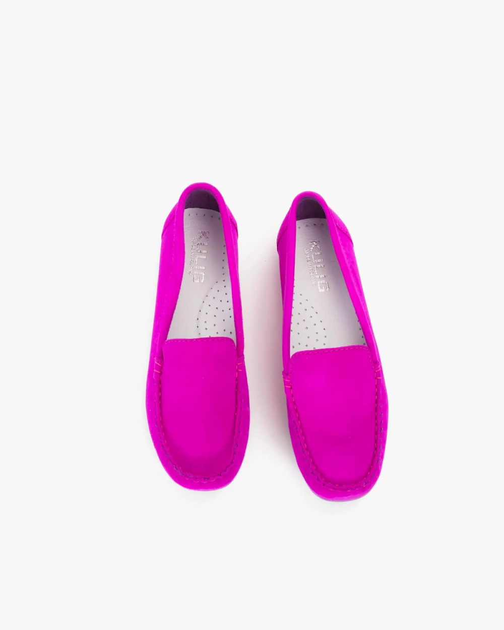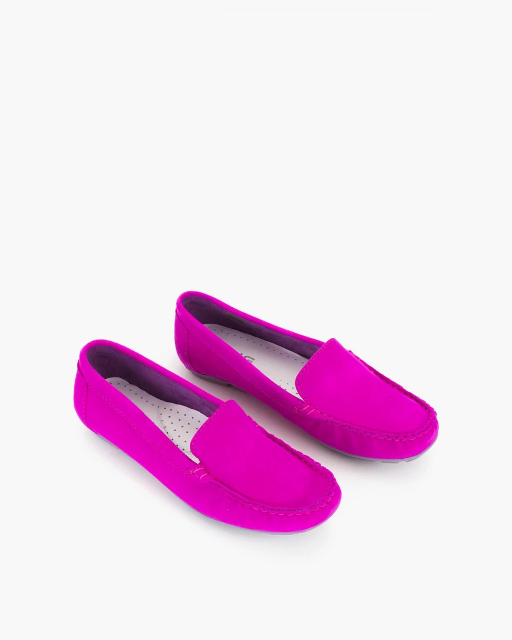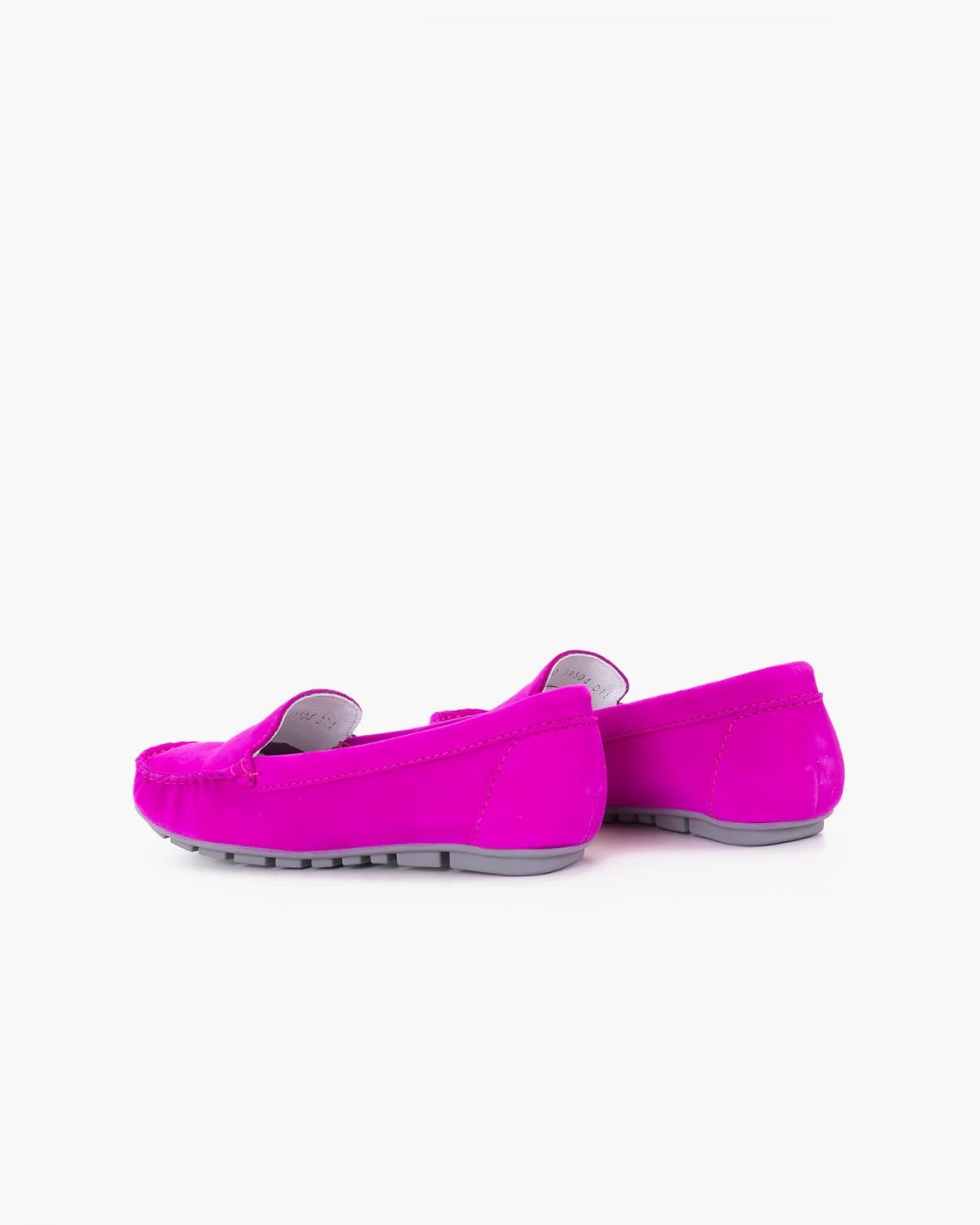 Fuksjowe mokasyny damskie z naturalnej skóry zamszowej